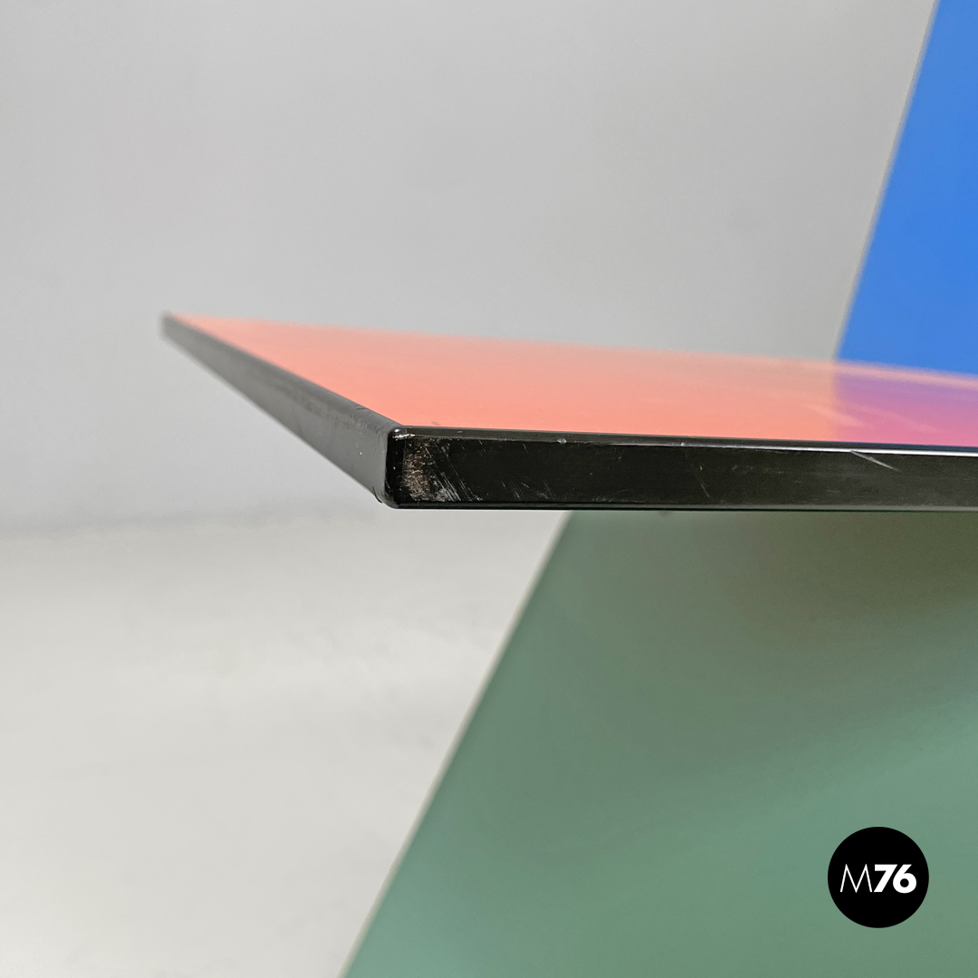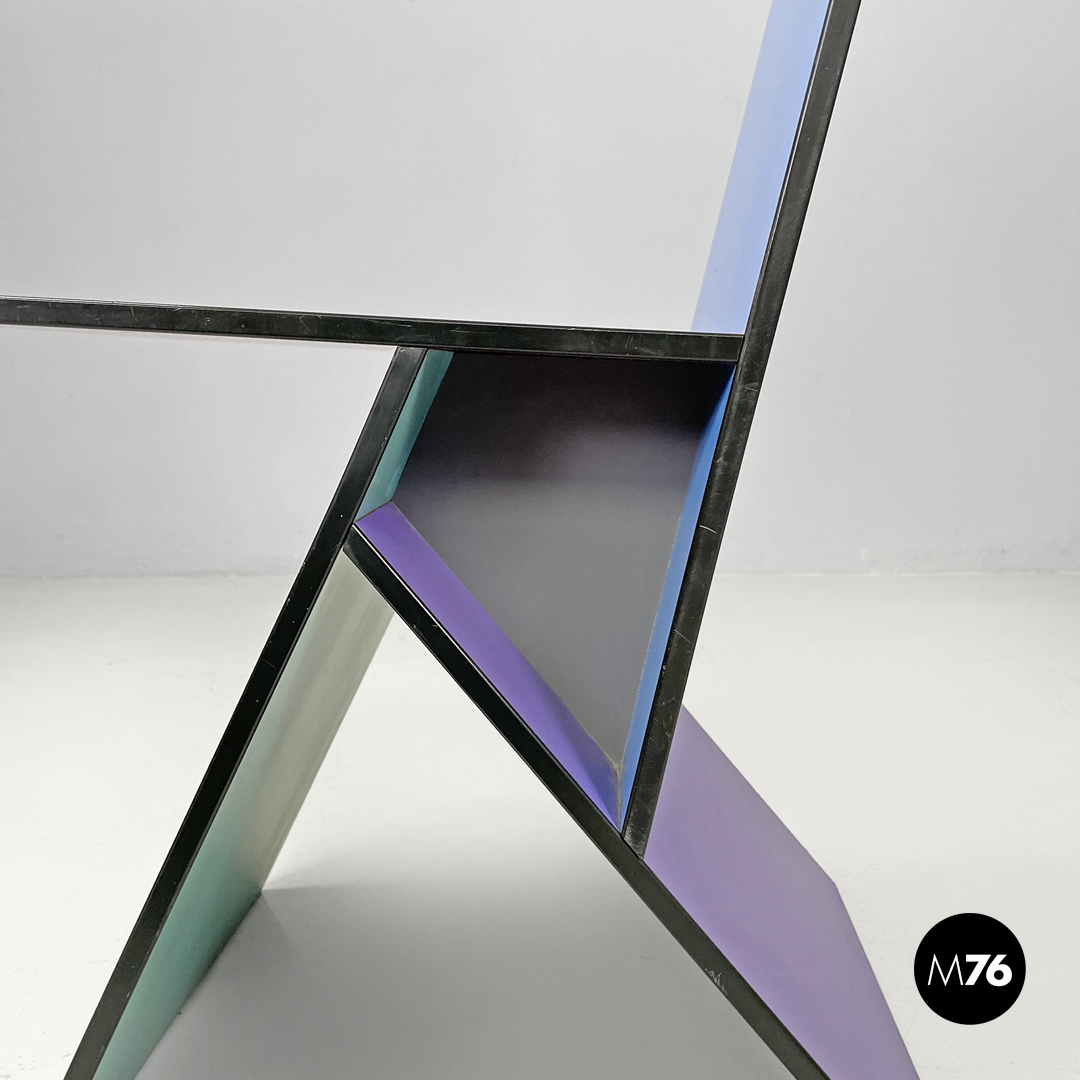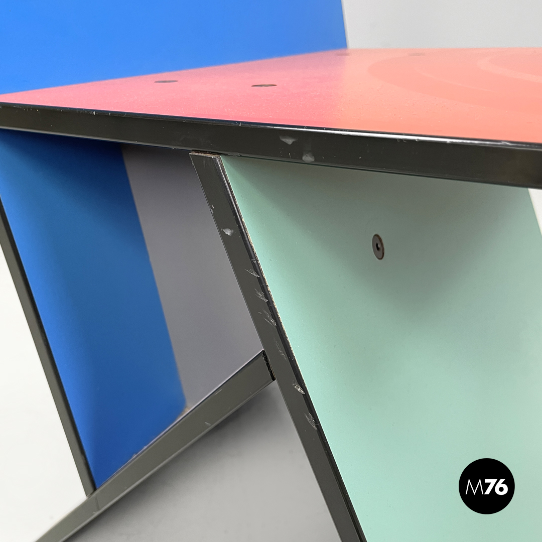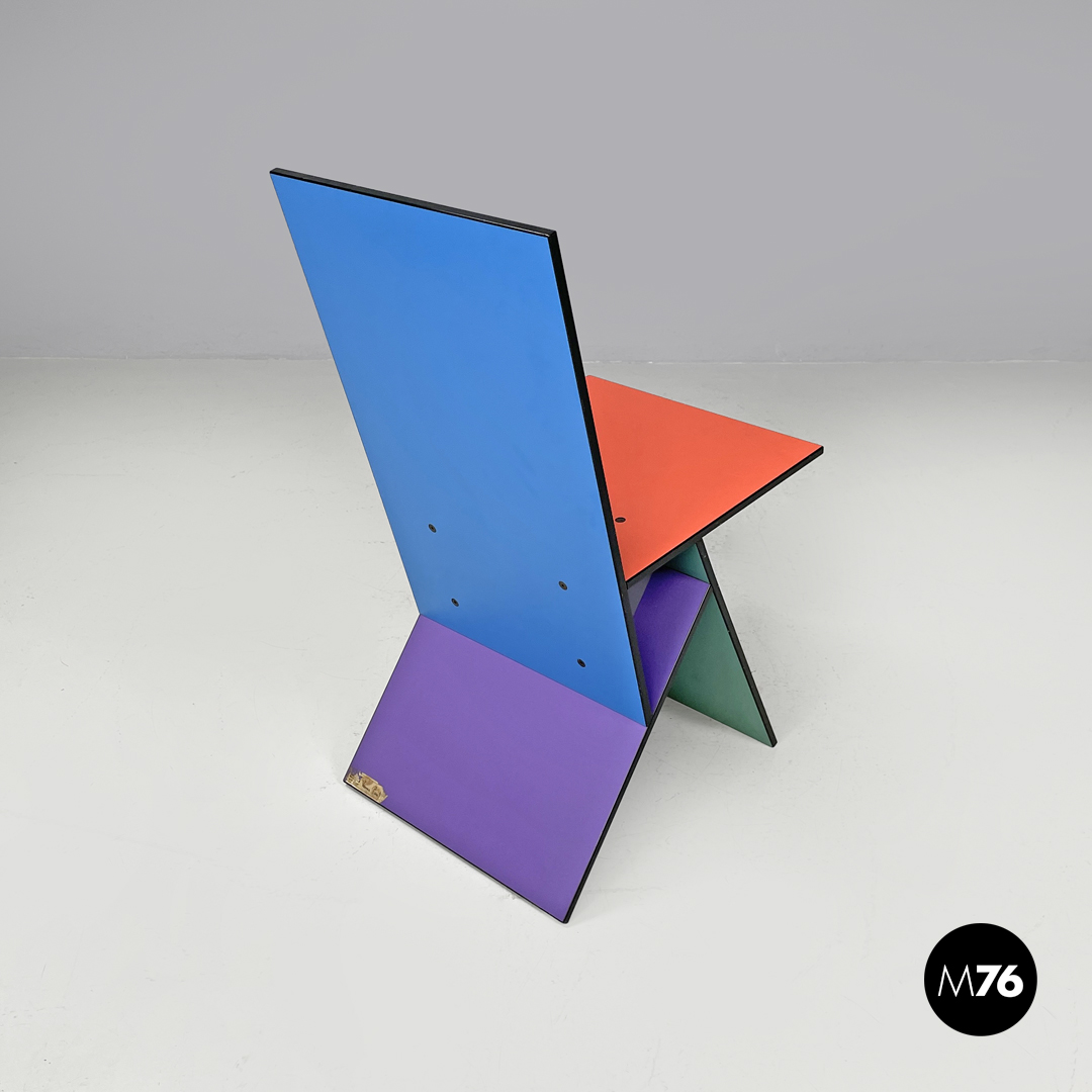 Sedia modello Vilbert in formica blu, viola, verde, rossa e grigia con bordi neri. La struttura segue linee geometriche e regolari, ed è composta da tavole rettangolari che si incrociano a formare schienale, seduta e gambe.