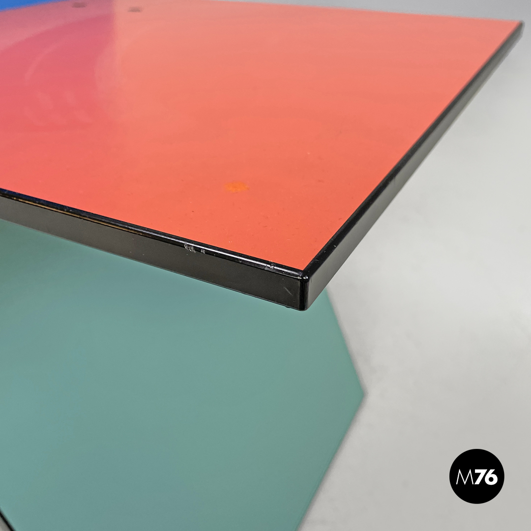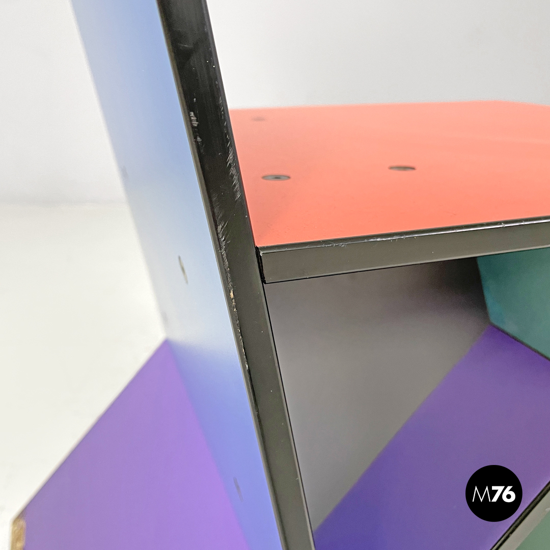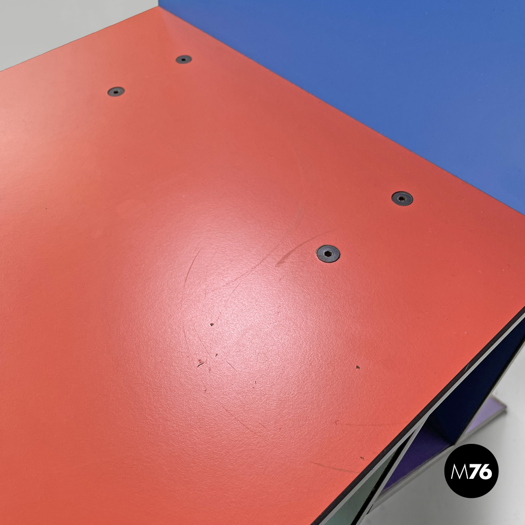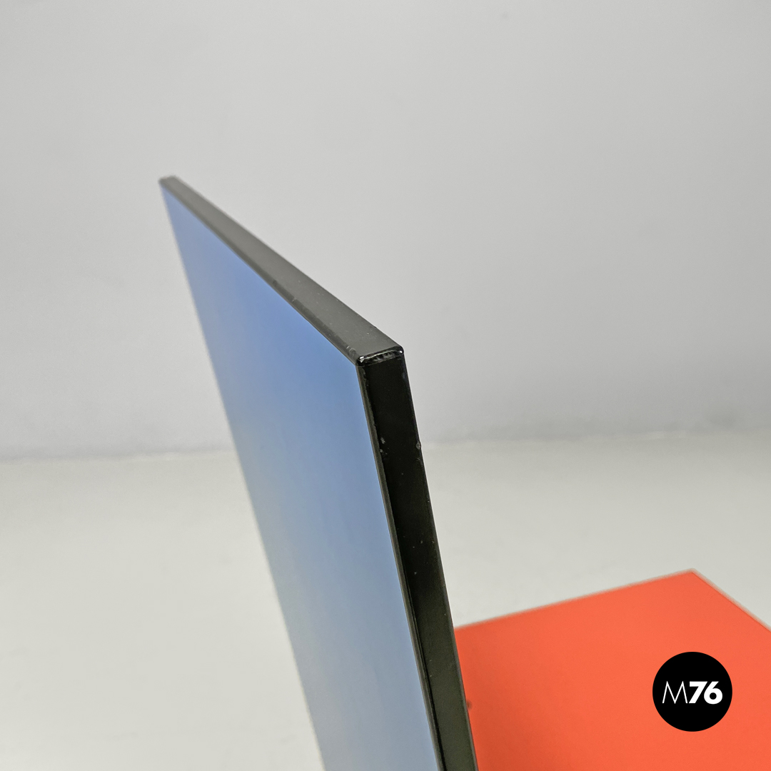 Sedia modello Vilbert in formica blu, viola, verde, rossa e grigia con bordi neri. La struttura segue linee geometriche e regolari, ed è composta da tavole rettangolari che si incrociano a formare schienale, seduta e gambe.