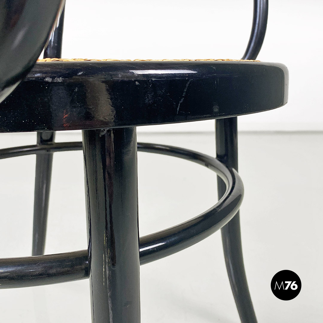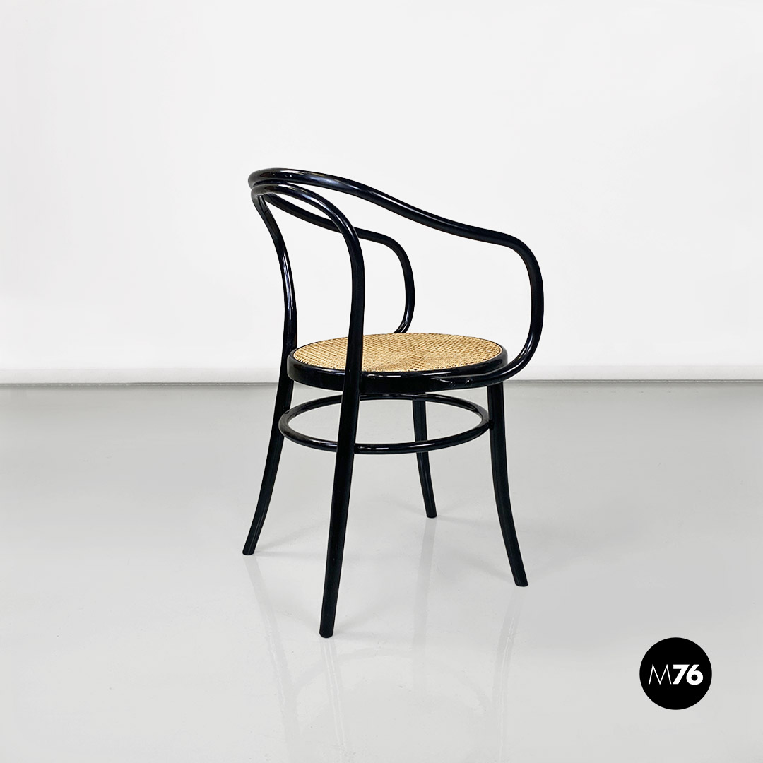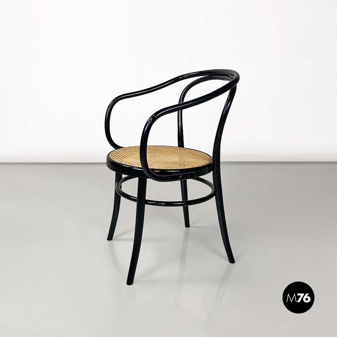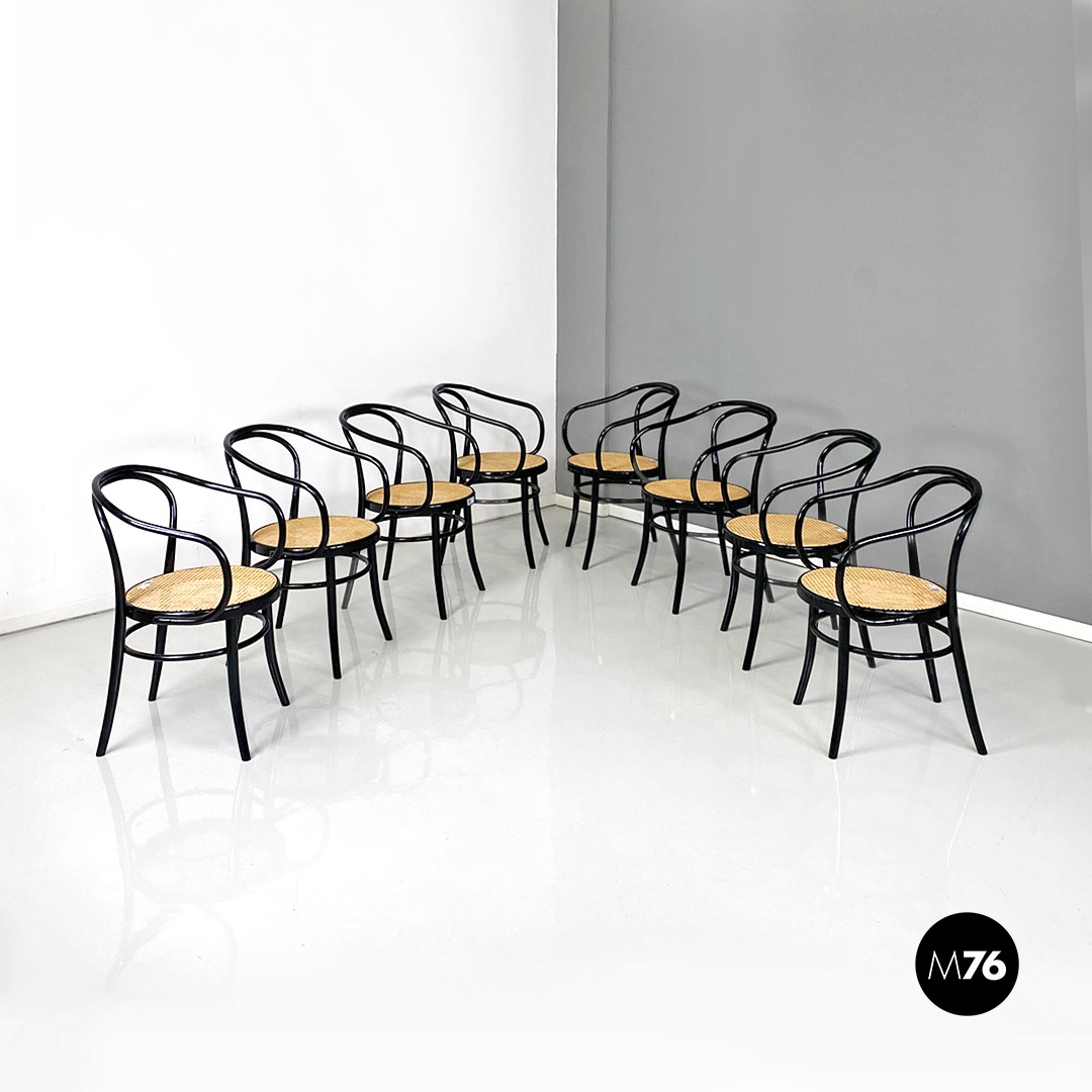 Set di otto sedie modello 209, con struttura in faggio curvato verniciato nero, con anello sempre in legno curvato posto sotto la seduta tonda a rinforzare la struttura, facendo da connettore tra le quattro zampe e sedile in paglia di Vienna. Sedie provenienti da un edificio del 1800 posto alle spalle del Duomo di Milano.
