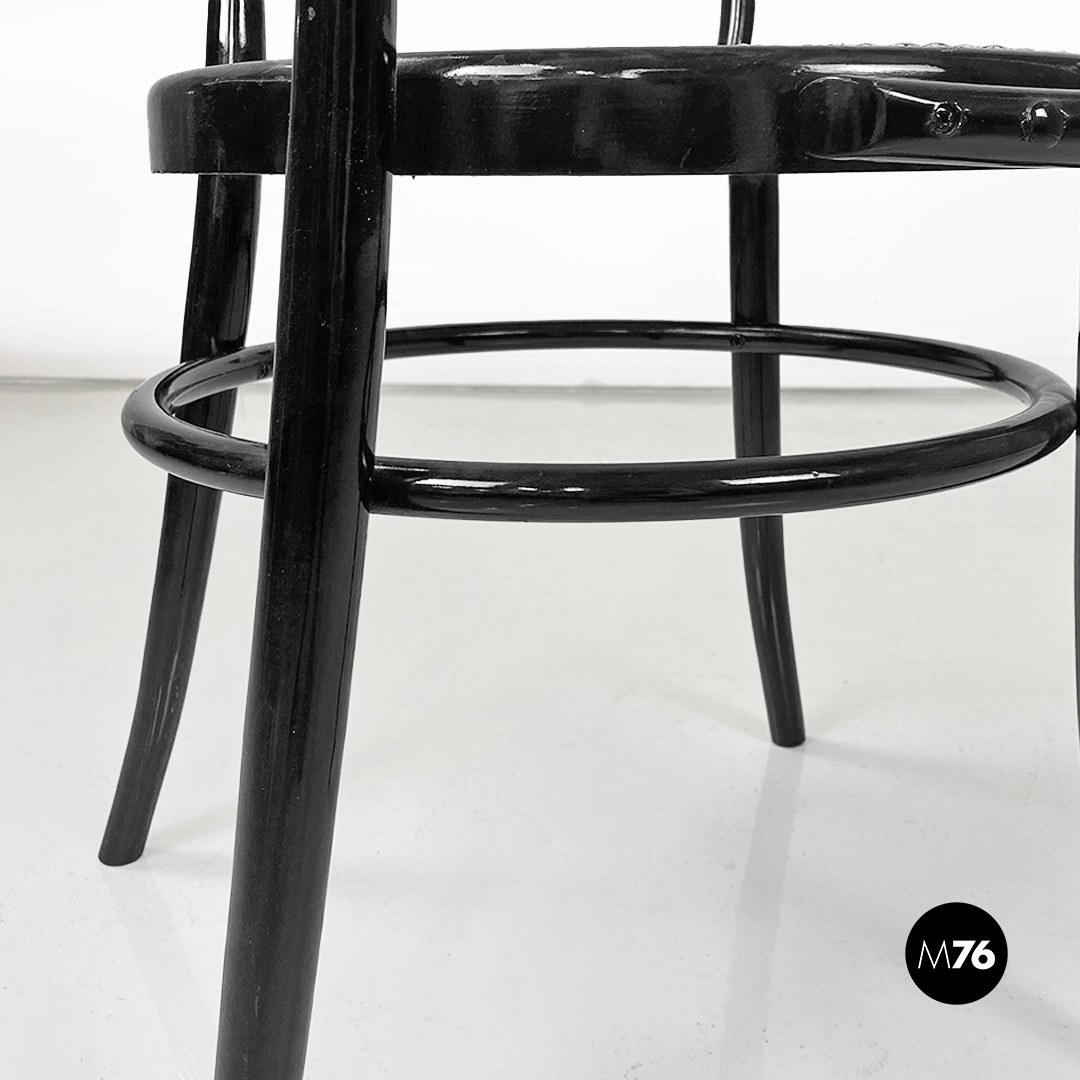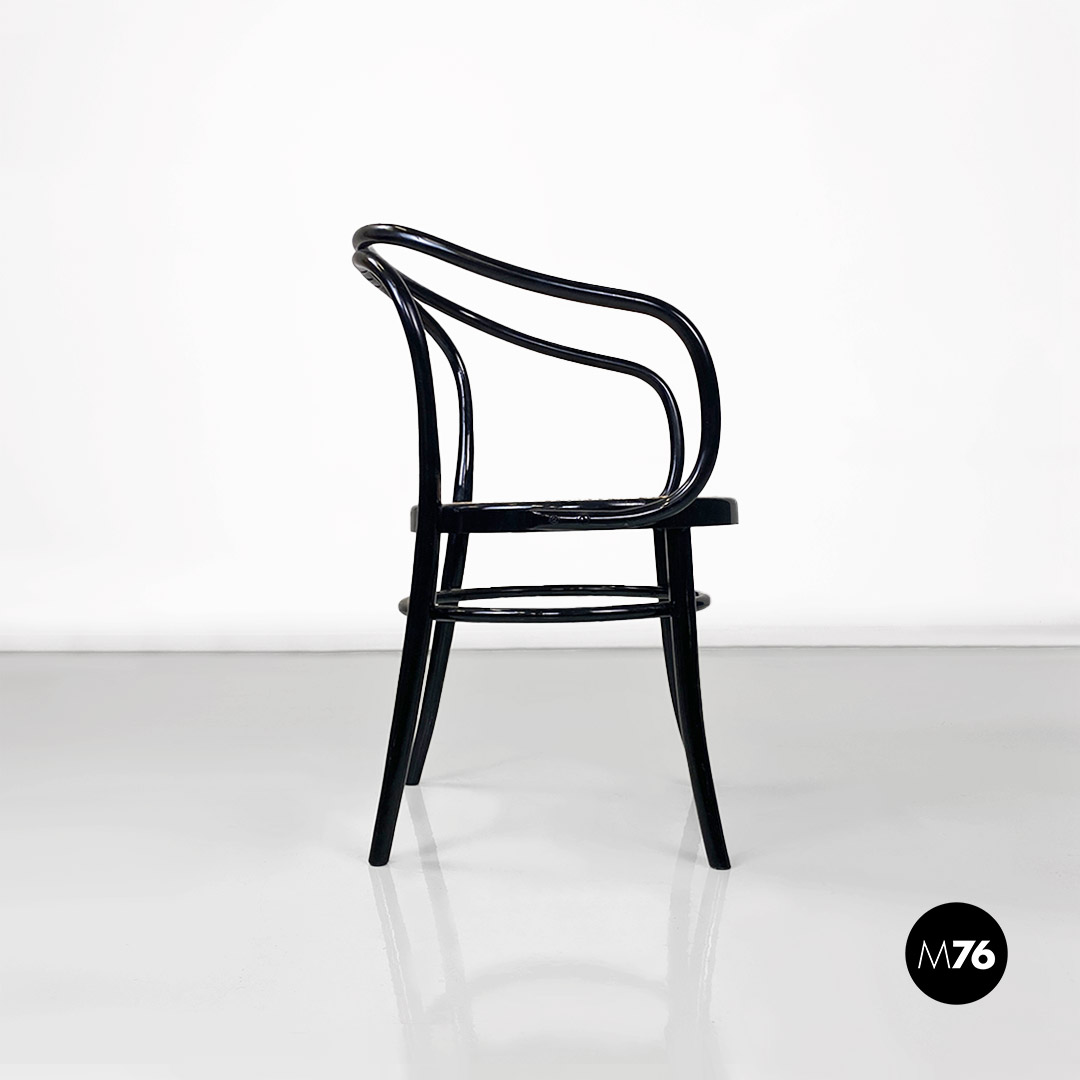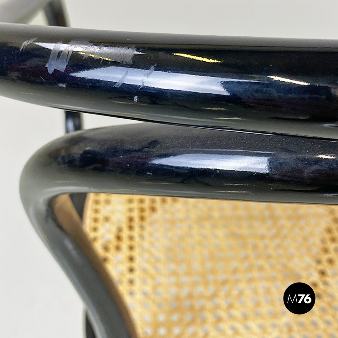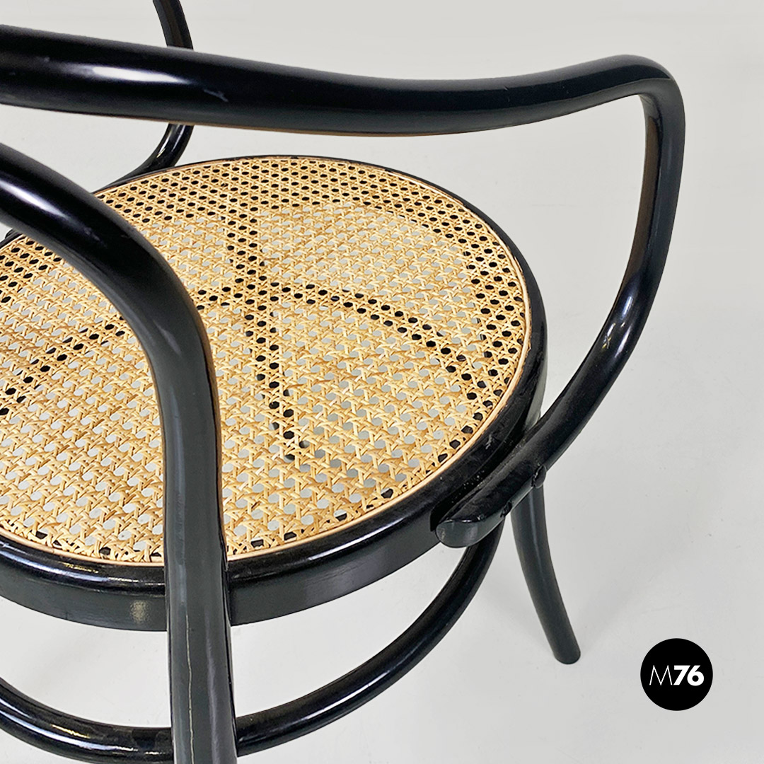 Set di otto sedie modello 209, con struttura in faggio curvato verniciato nero, con anello sempre in legno curvato posto sotto la seduta tonda a rinforzare la struttura, facendo da connettore tra le quattro zampe e sedile in paglia di Vienna. Sedie provenienti da un edificio del 1800 posto alle spalle del Duomo di Milano.