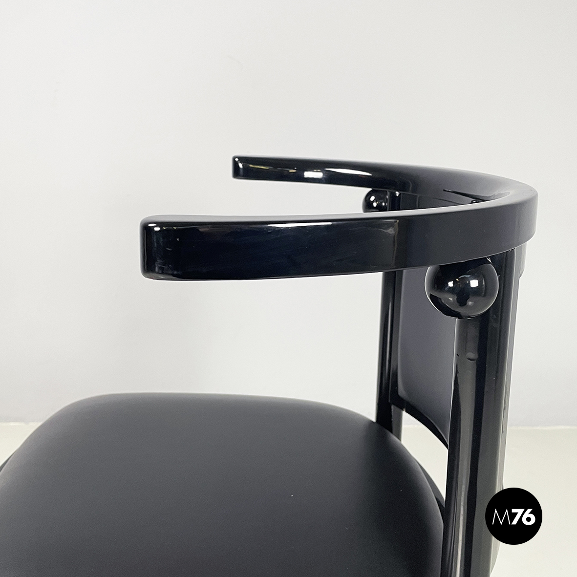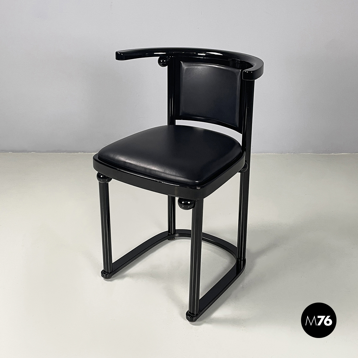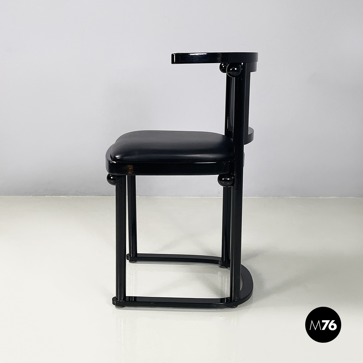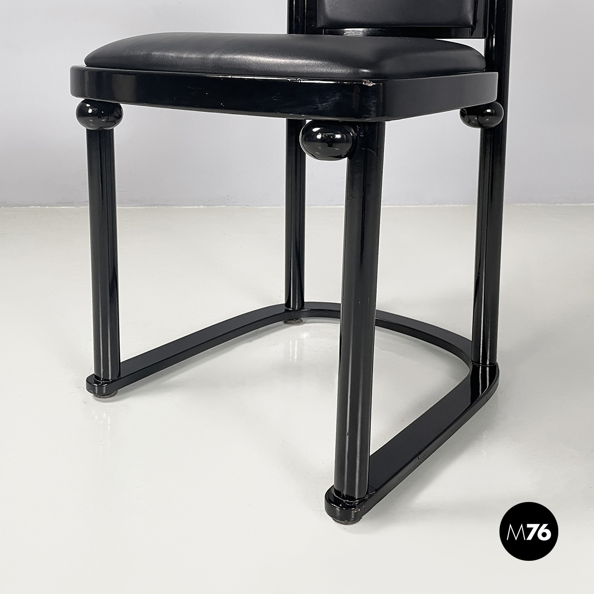 Set di sei sedie a pozzetto con struttura in legno verniciato nero. Sulla struttura sono presenti delle sfere decorative, anche esse in legno verniciate nere. La seduta e lo schienale sono imbottiti e rivestiti in pelle nera. La sedia presenta quattro gambe e sezione quadrata unite da un listello semicircolare.