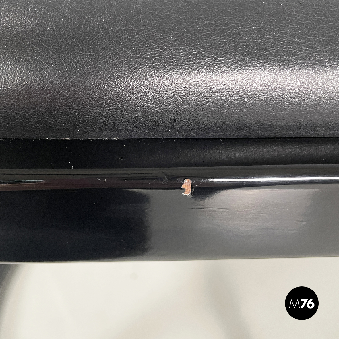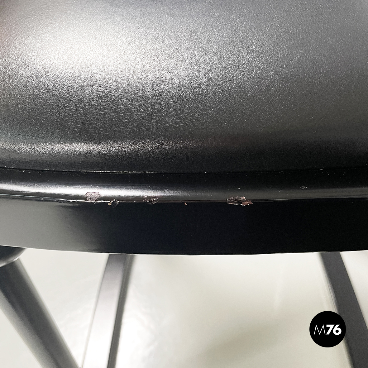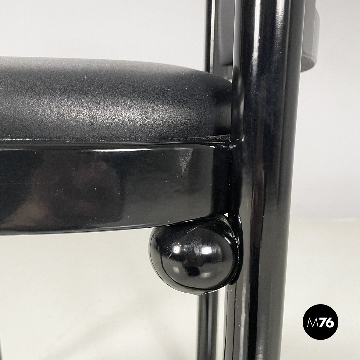 Set di sei sedie a pozzetto con struttura in legno verniciato nero. Sulla struttura sono presenti delle sfere decorative, anche esse in legno verniciate nere. La seduta e lo schienale sono imbottiti e rivestiti in pelle nera. La sedia presenta quattro gambe e sezione quadrata unite da un listello semicircolare.
