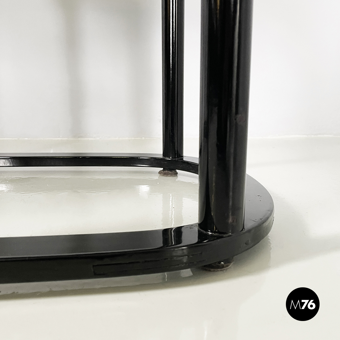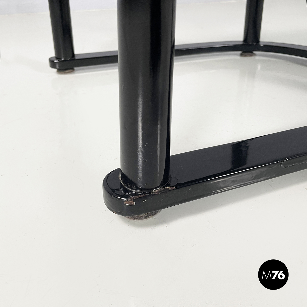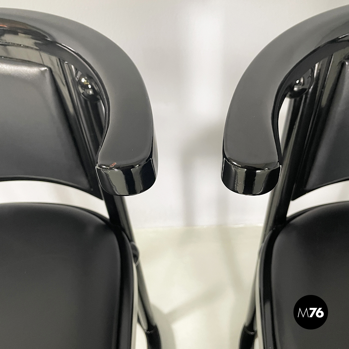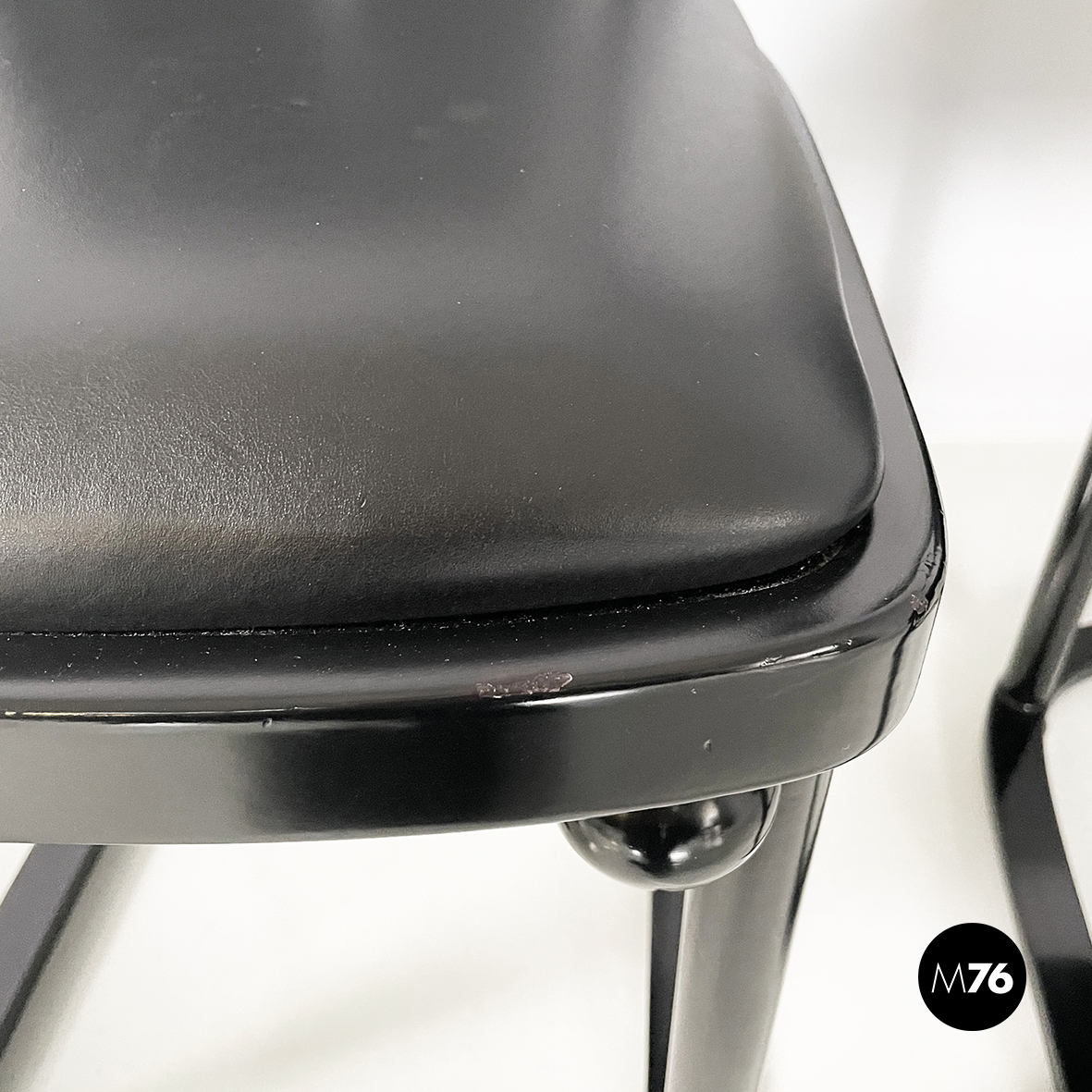 Set di sei sedie a pozzetto con struttura in legno verniciato nero. Sulla struttura sono presenti delle sfere decorative, anche esse in legno verniciate nere. La seduta e lo schienale sono imbottiti e rivestiti in pelle nera. La sedia presenta quattro gambe e sezione quadrata unite da un listello semicircolare.
