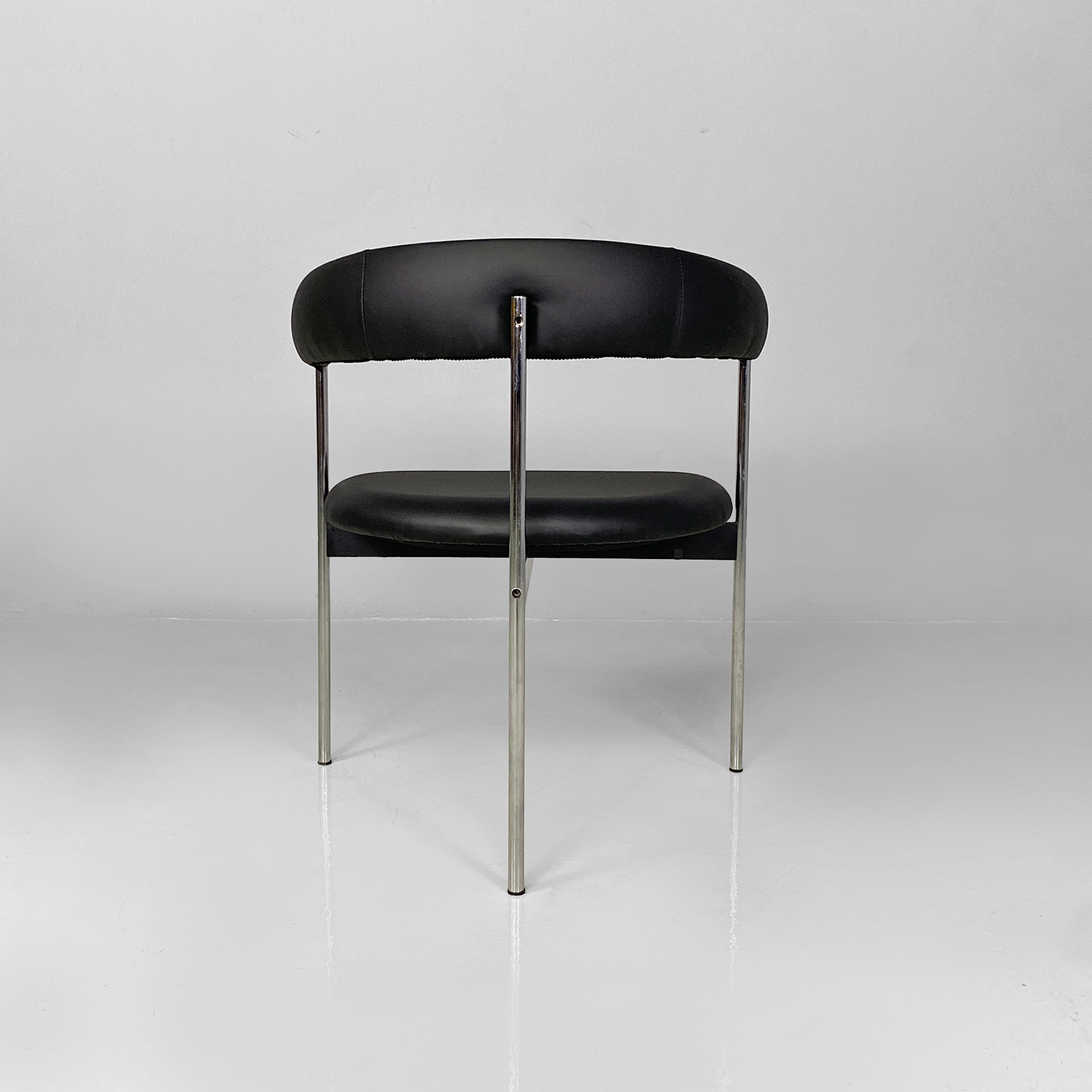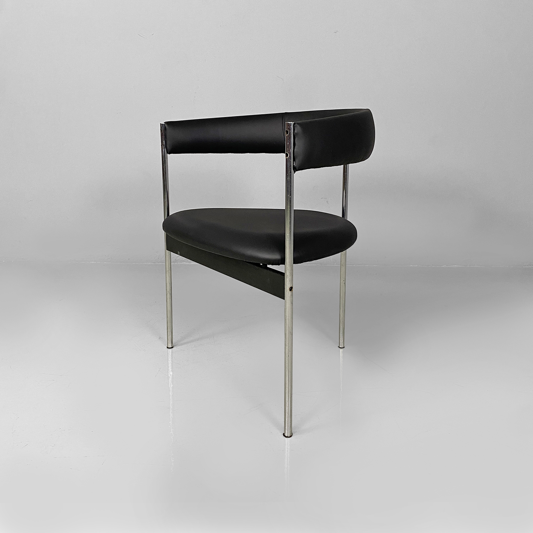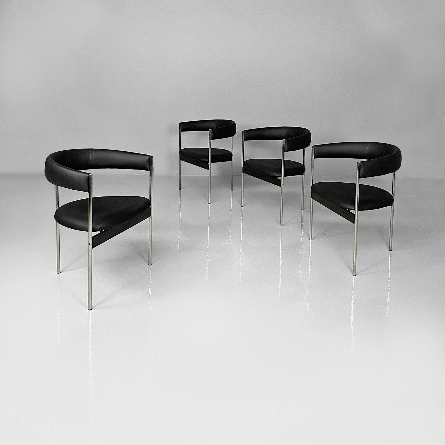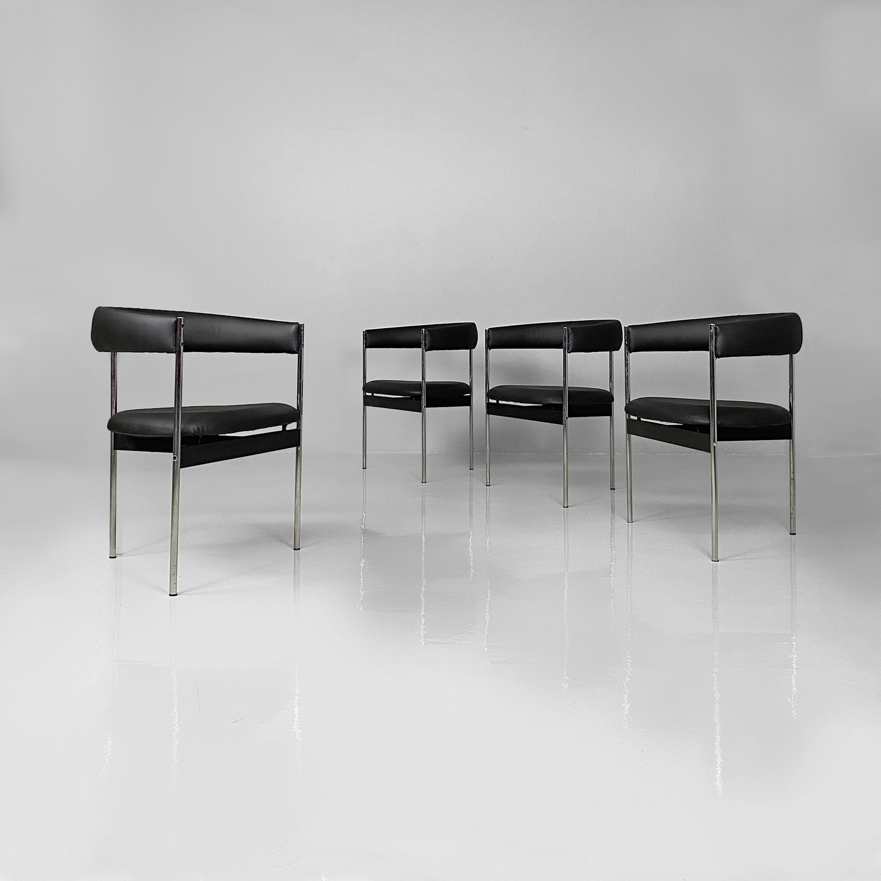 Set di quattro sedie a pozzetto con braccioli o poltrone di piccola dimensione, con schienale e seduta imbottiti e rivestiti in sky o similpelle di colore nero opaco. Struttura della sedia composta da tre zampe in acciaio cromato a sezione tonda, con supporto a “t” nella parte inferiore della seduta, a tenere le zampe solidali tra loro.