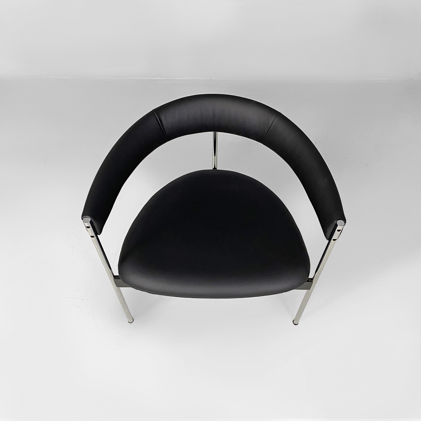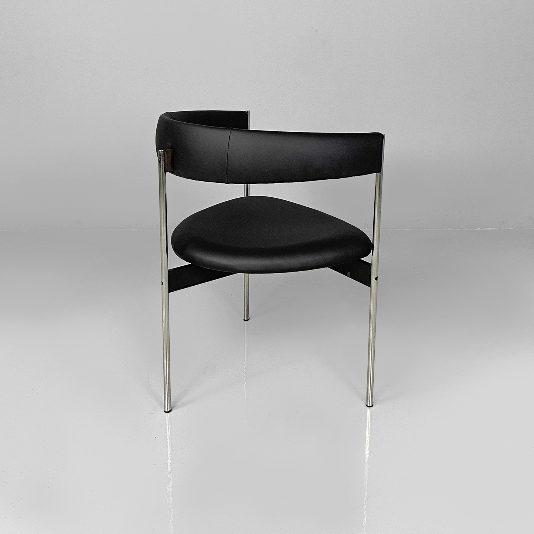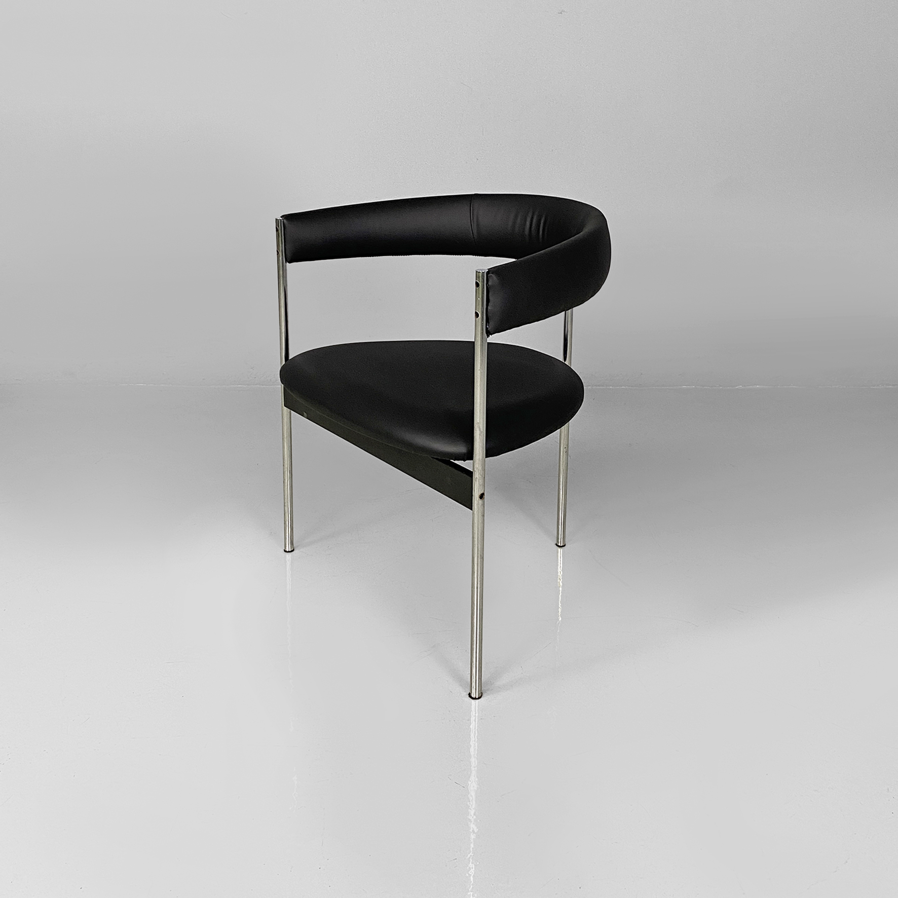 Set di quattro sedie a pozzetto con braccioli o poltrone di piccola dimensione, con schienale e seduta imbottiti e rivestiti in sky o similpelle di colore nero opaco. Struttura della sedia composta da tre zampe in acciaio cromato a sezione tonda, con supporto a “t” nella parte inferiore della seduta, a tenere le zampe solidali tra loro.