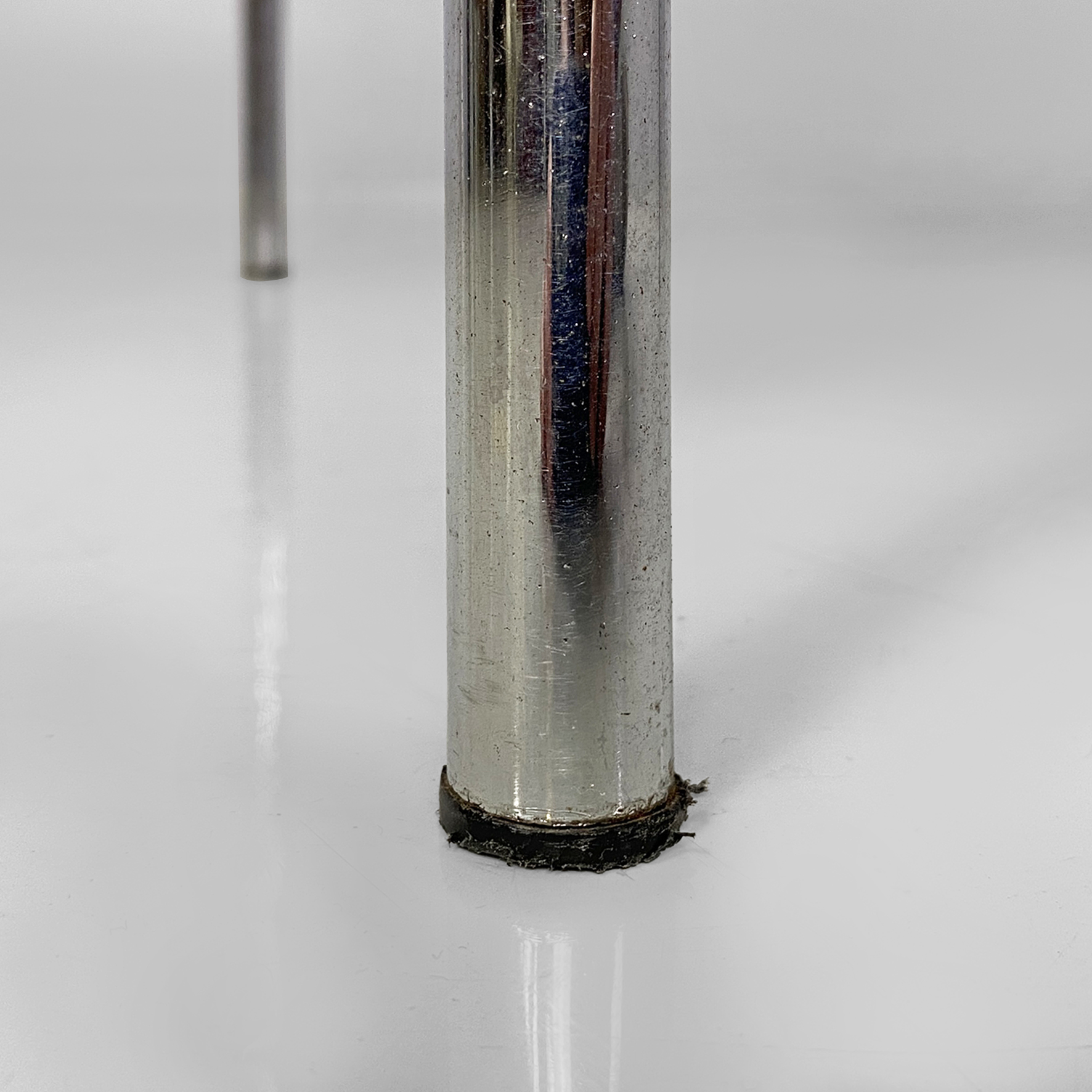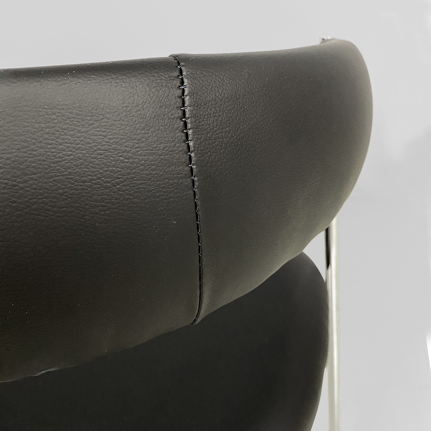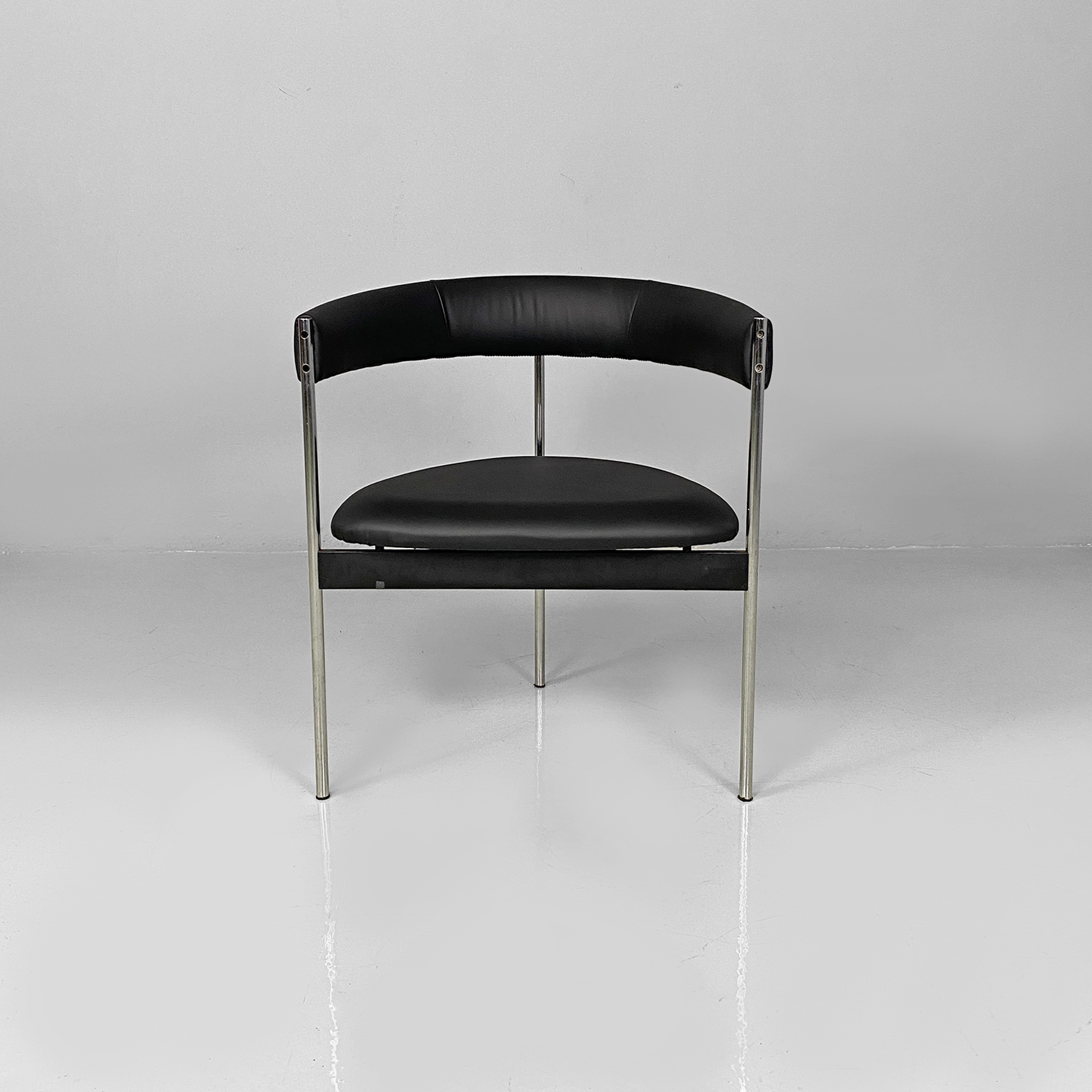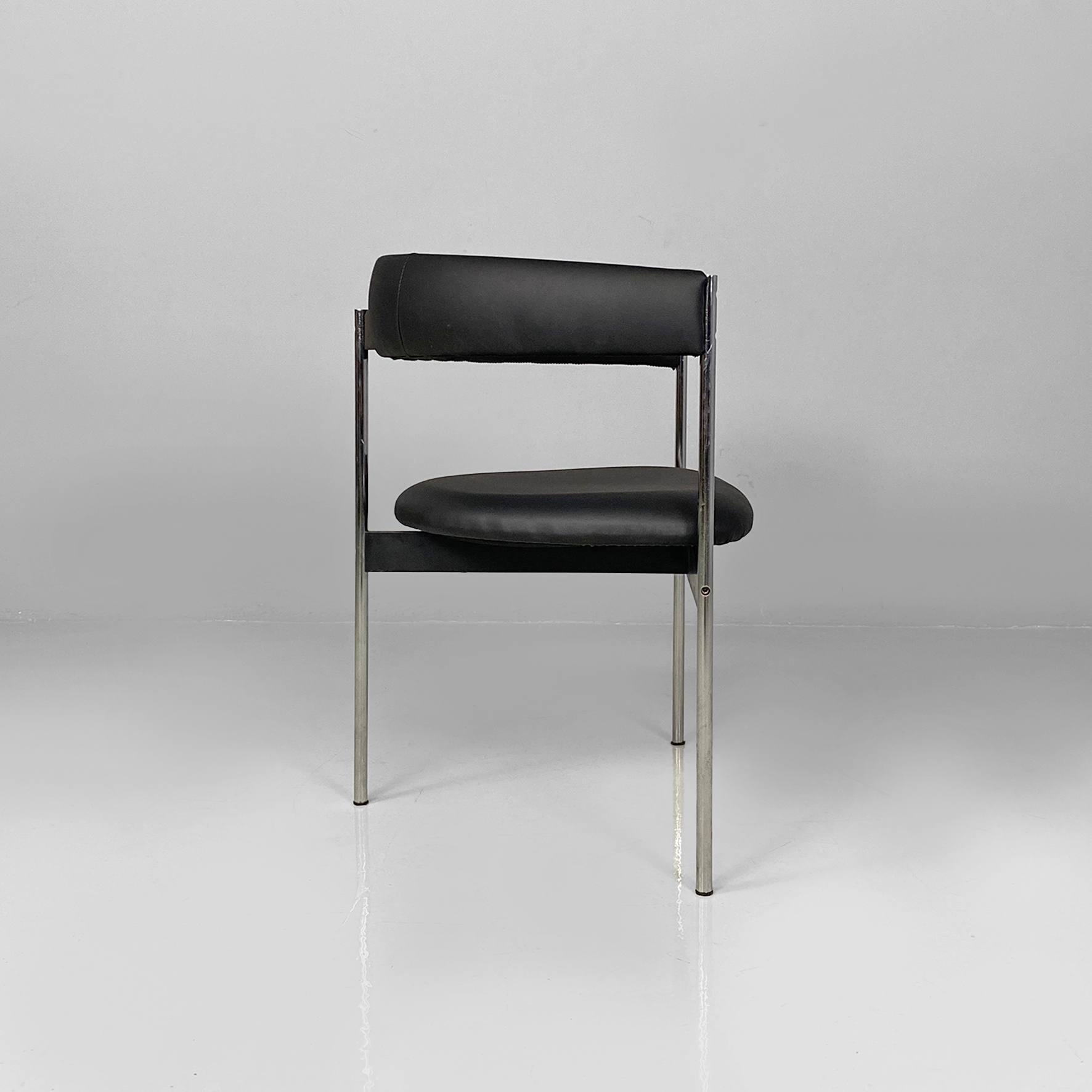 Set di quattro sedie a pozzetto con braccioli o poltrone di piccola dimensione, con schienale e seduta imbottiti e rivestiti in sky o similpelle di colore nero opaco. Struttura della sedia composta da tre zampe in acciaio cromato a sezione tonda, con supporto a “t” nella parte inferiore della seduta, a tenere le zampe solidali tra loro.