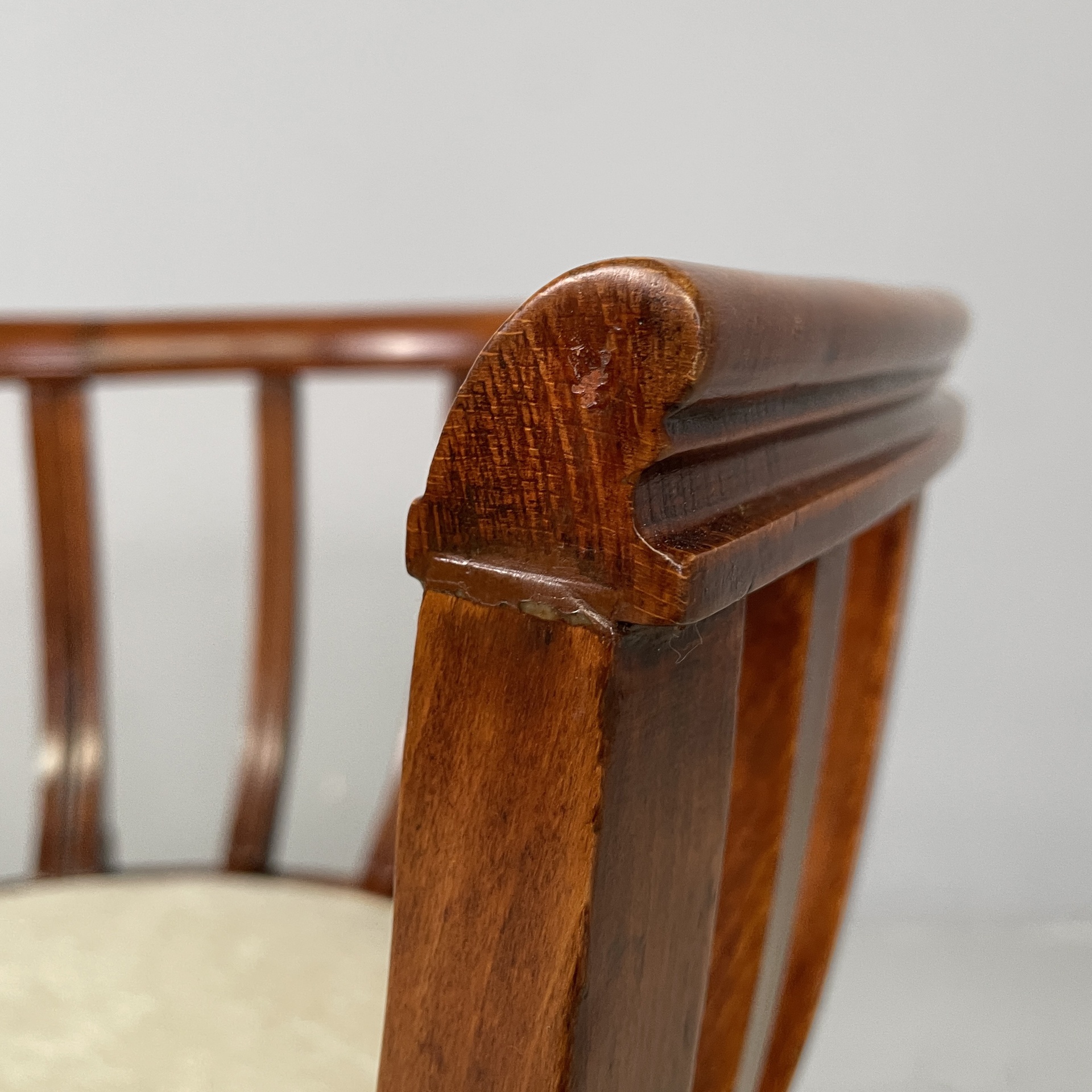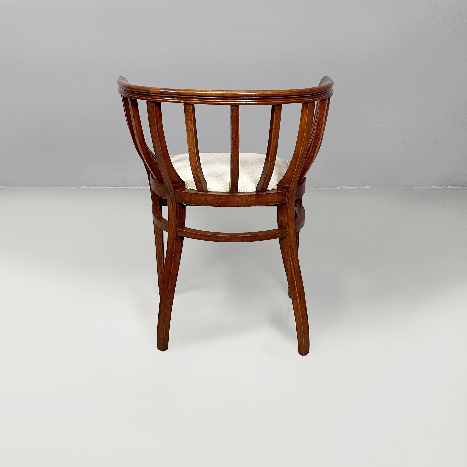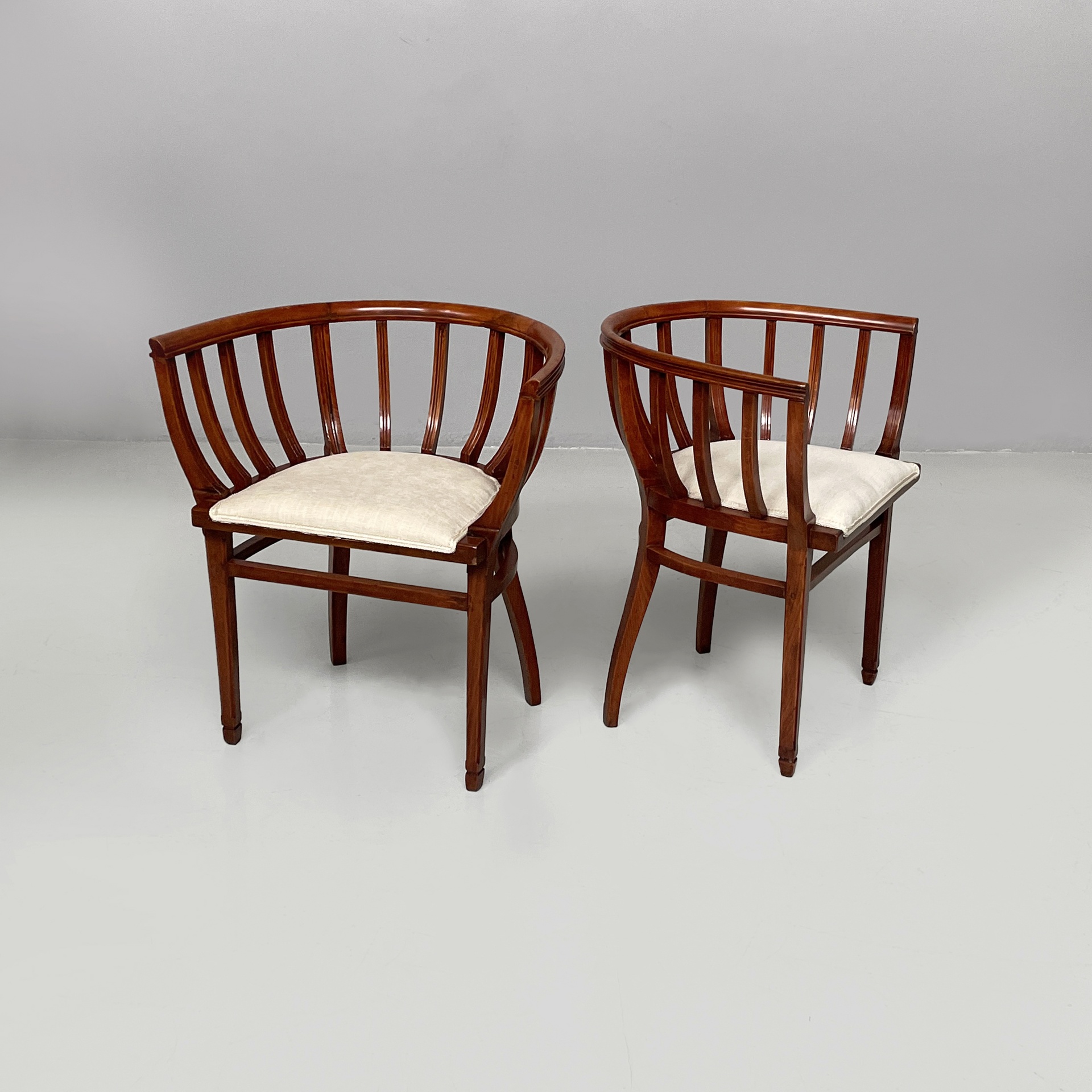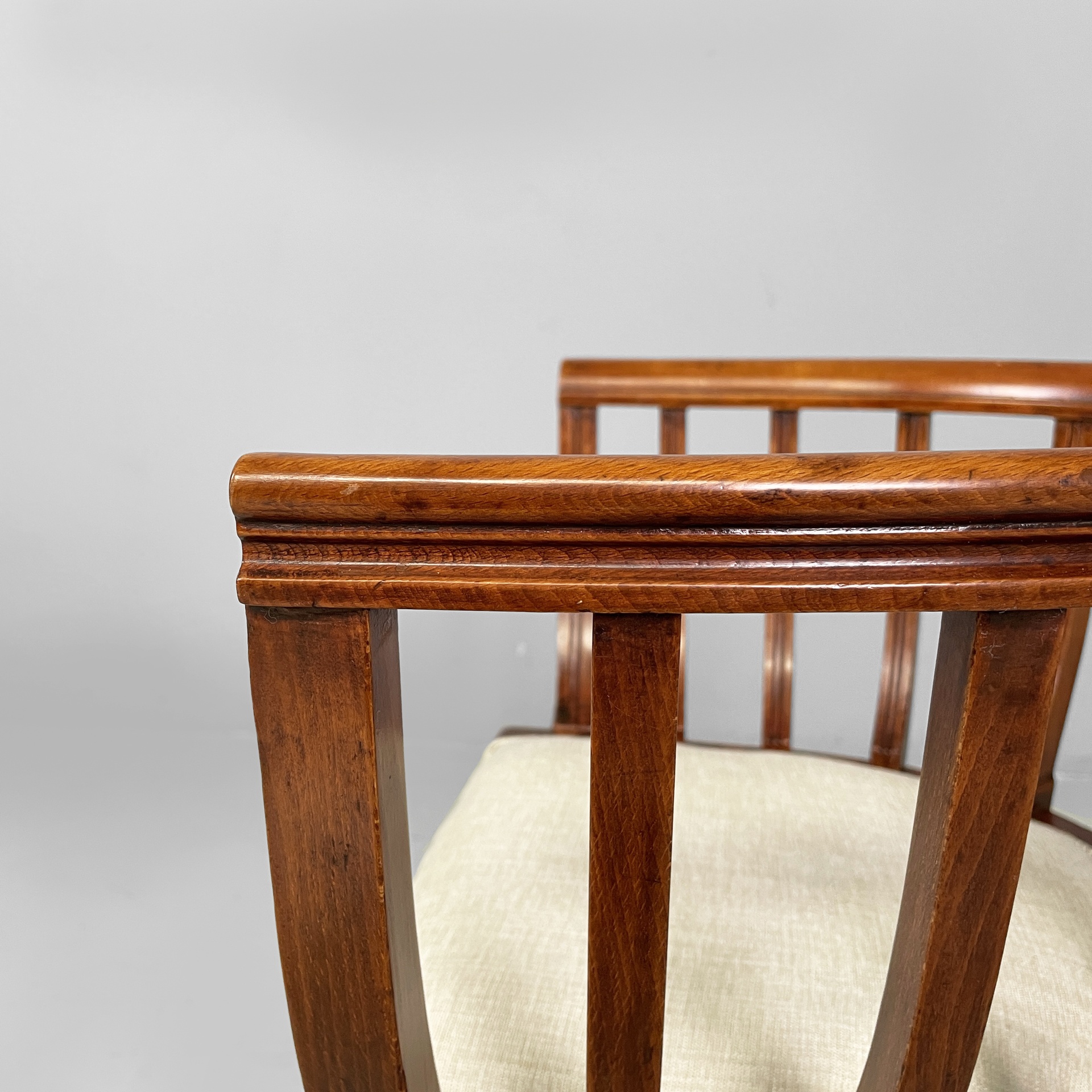 Coppia di sedie a pozzetto con seduta imbottita e rivestita in tessuto bianco. Lo schienale e i braccioli sono composti da listelli in legno curvato. Le zampe sono in legno. Art Deco.