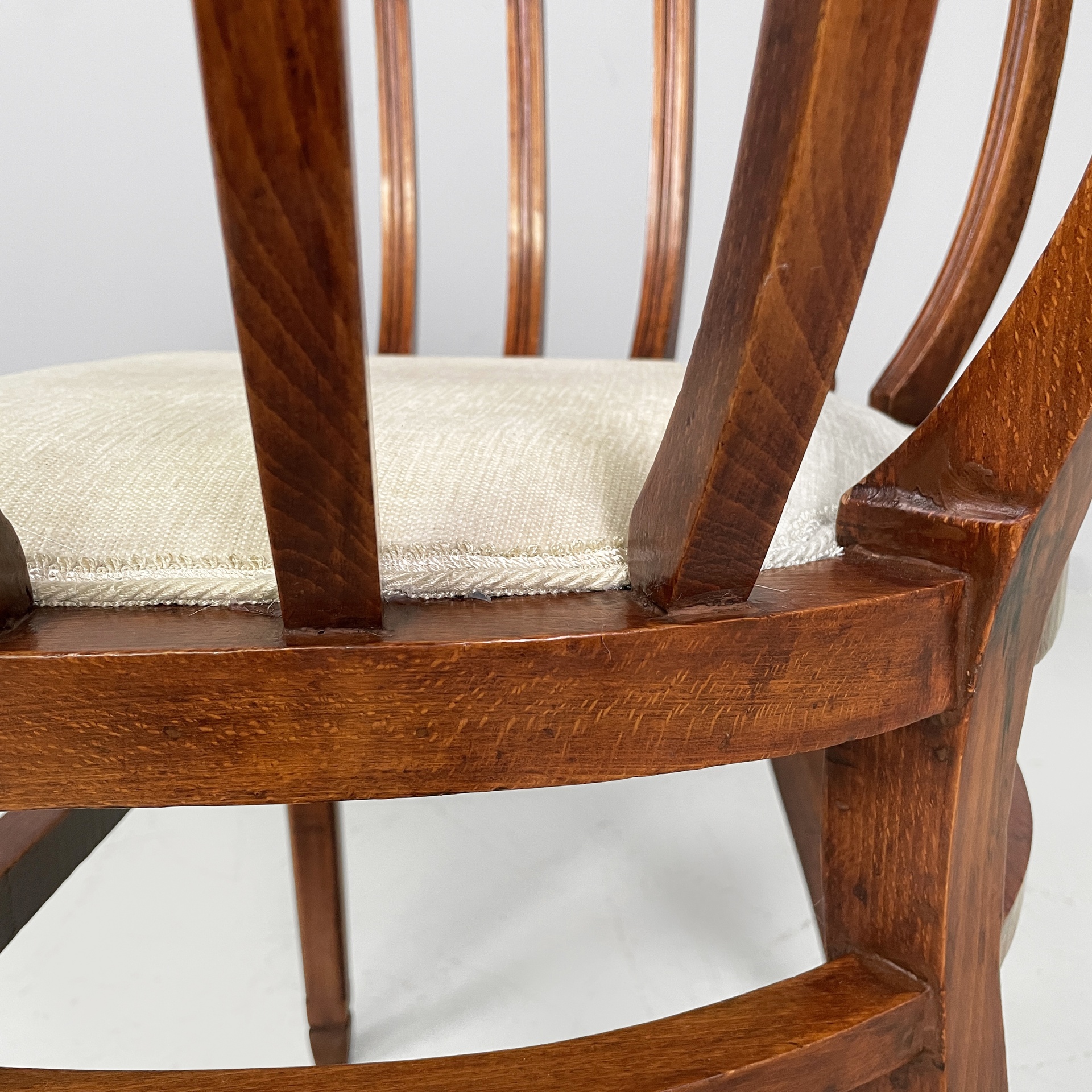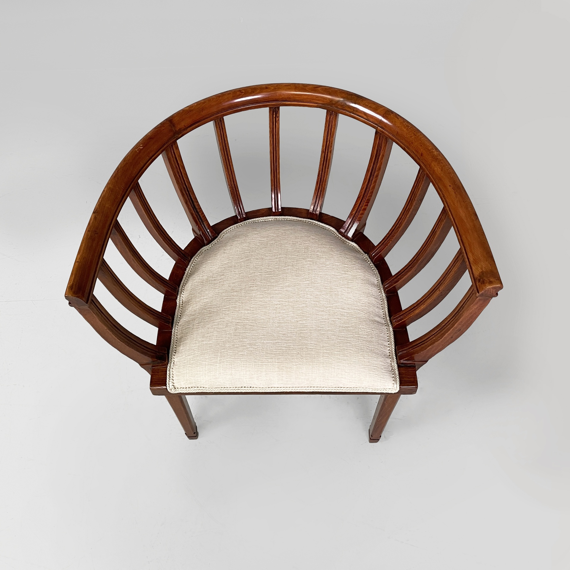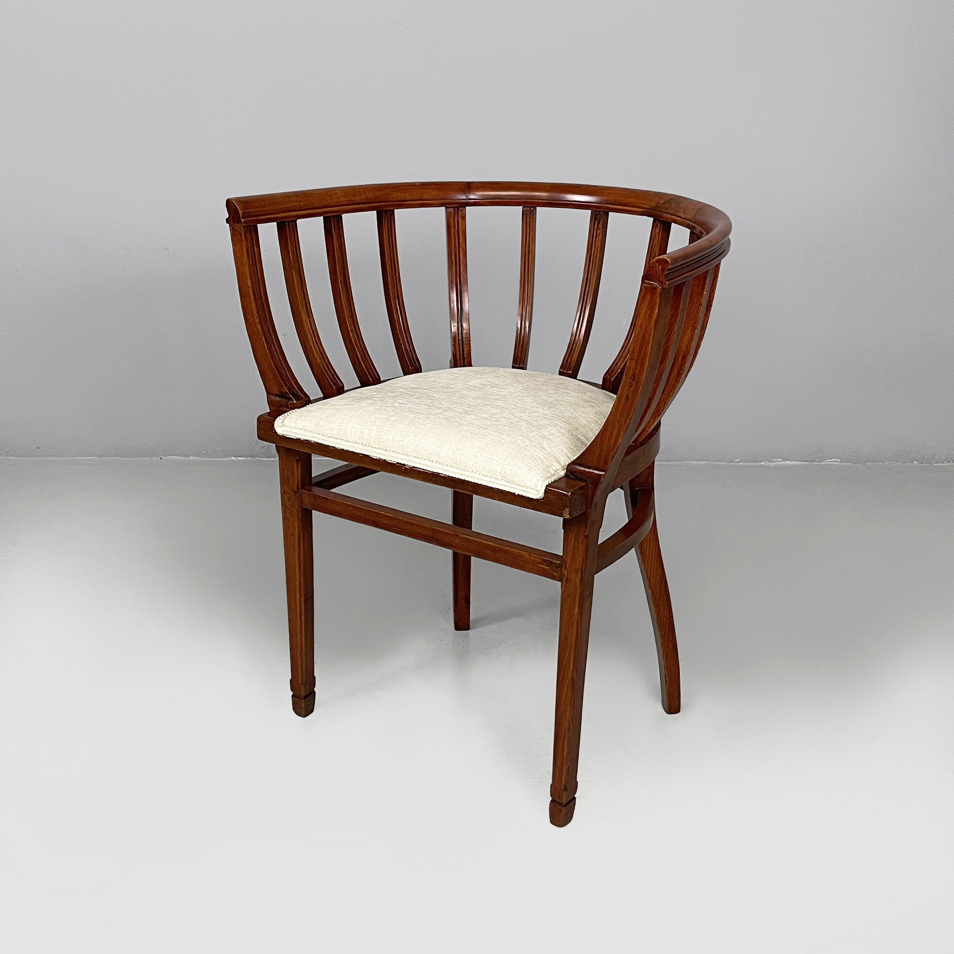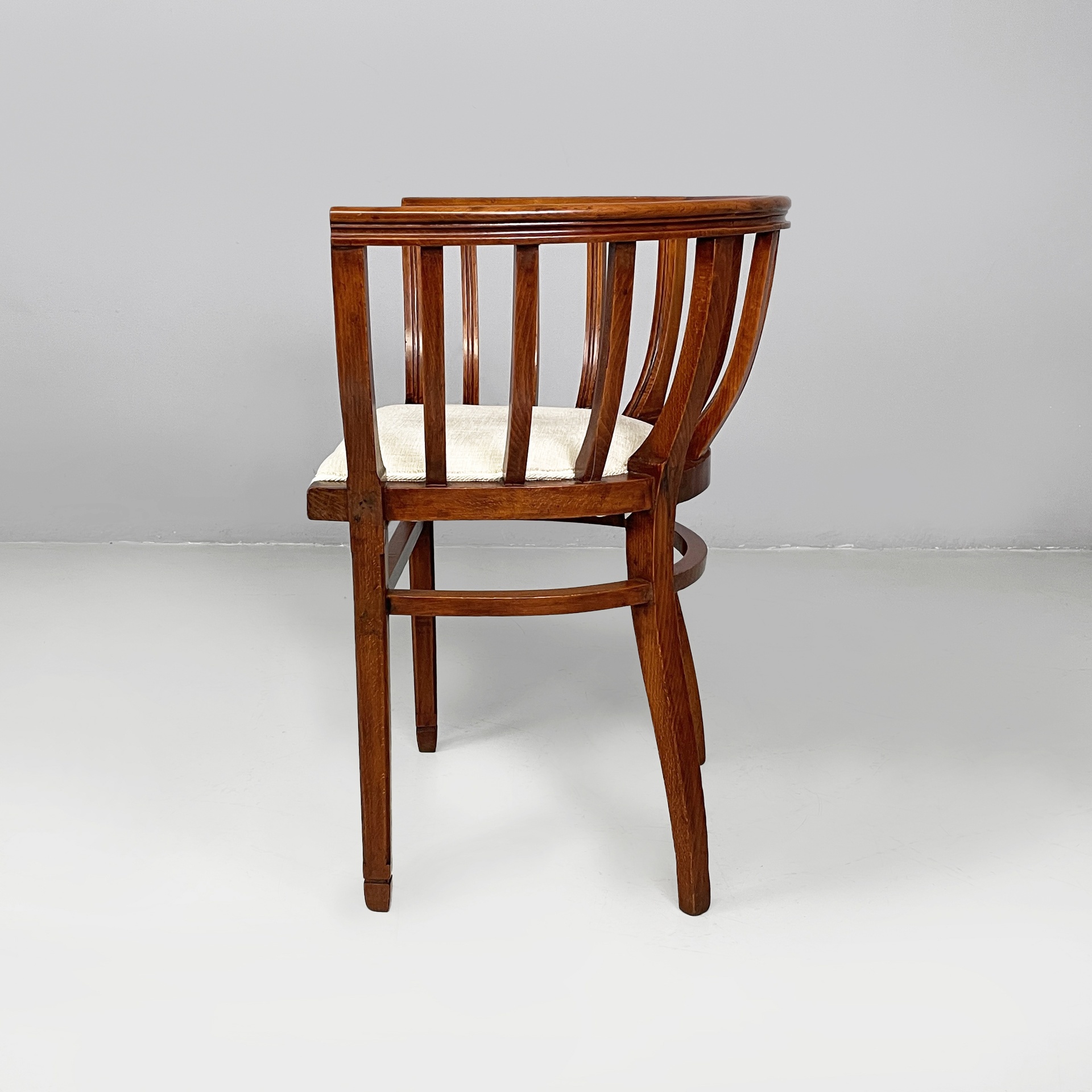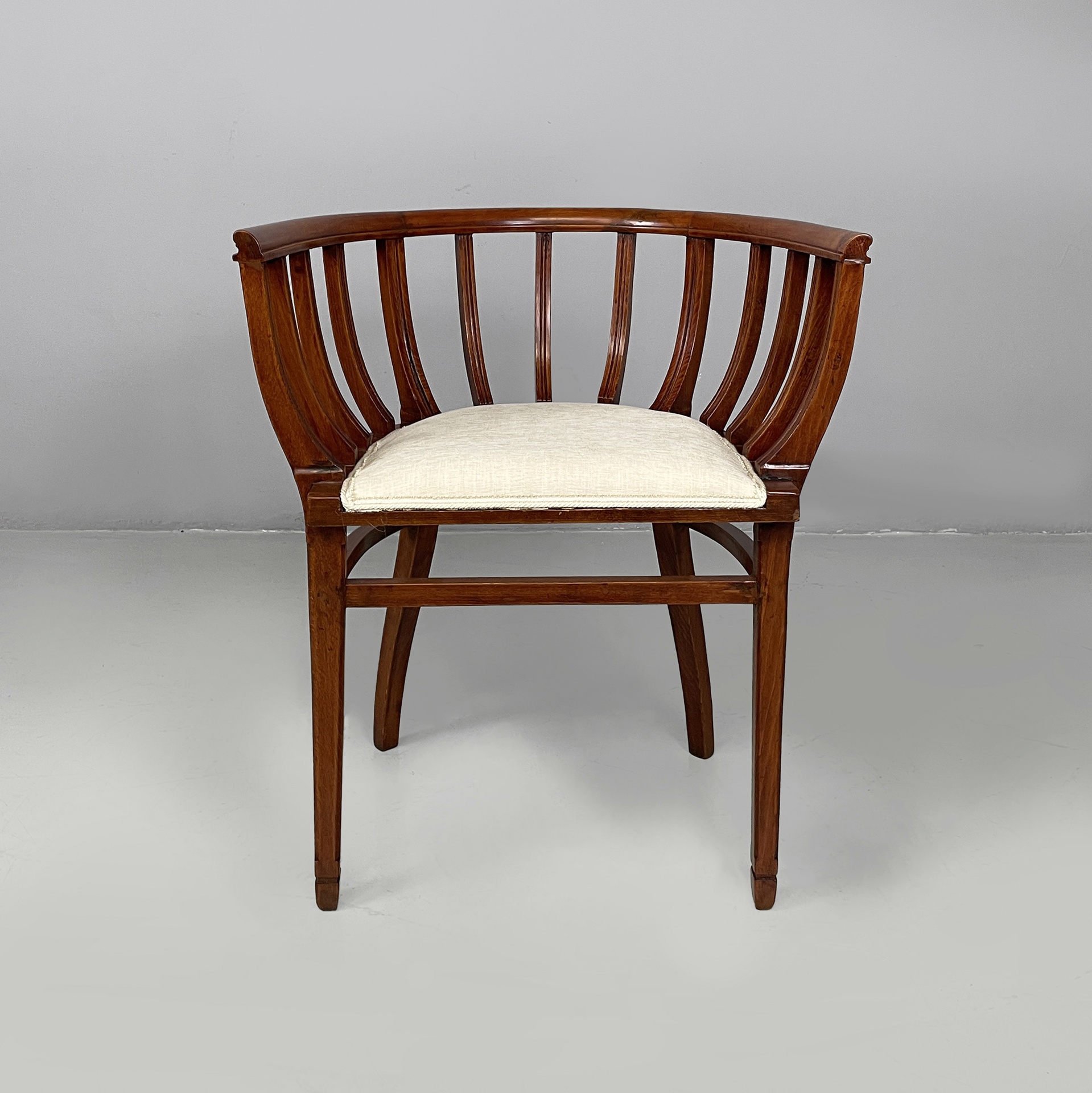 Coppia di sedie a pozzetto con seduta imbottita e rivestita in tessuto bianco. Lo schienale e i braccioli sono composti da listelli in legno curvato. Le zampe sono in legno. Art Deco.