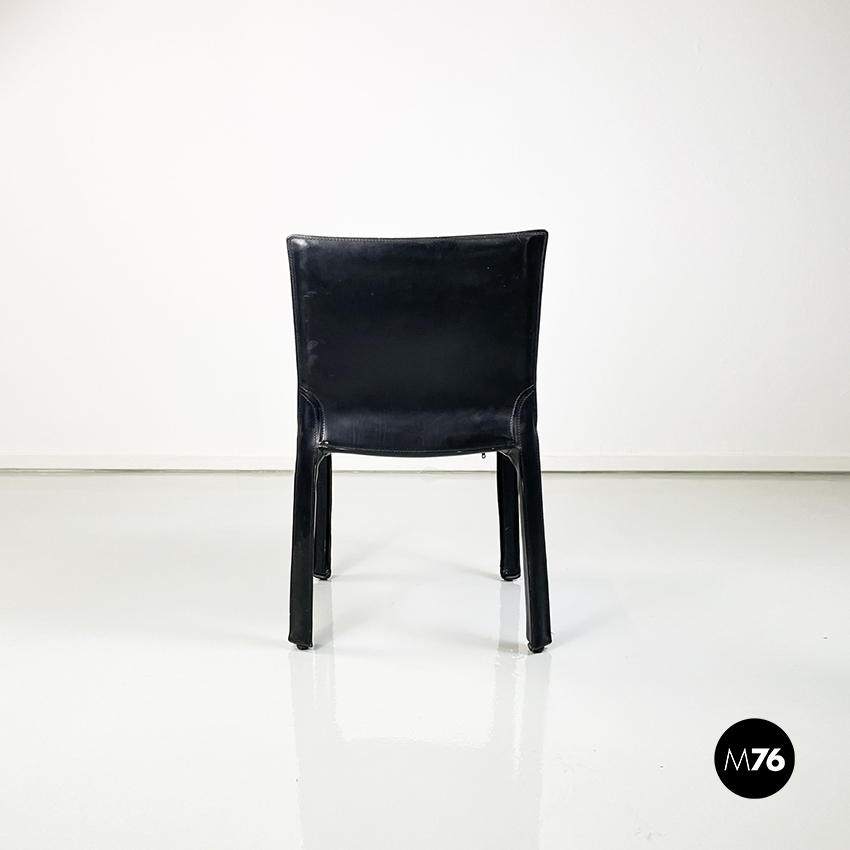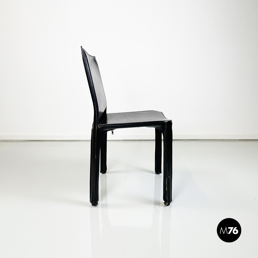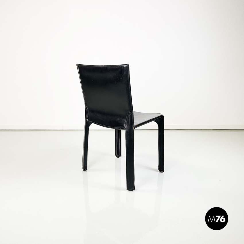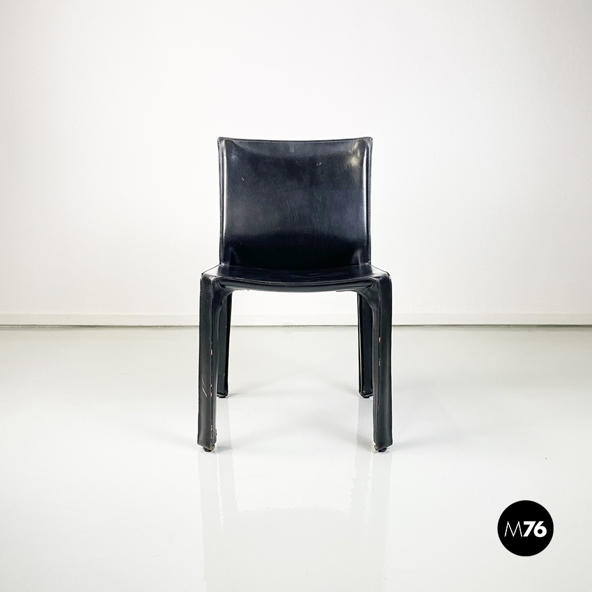 Set di sei sedie model CAB 412 in pelle nera. Il cuoio segue le forme della seduta, dello schienale e delle gambe. Cuciture a vista. Sotto la seduta sono presenti delle cerniere che chiudono la pelle.