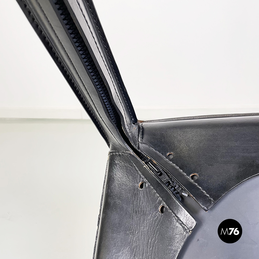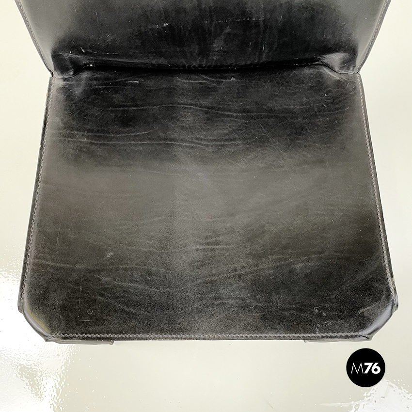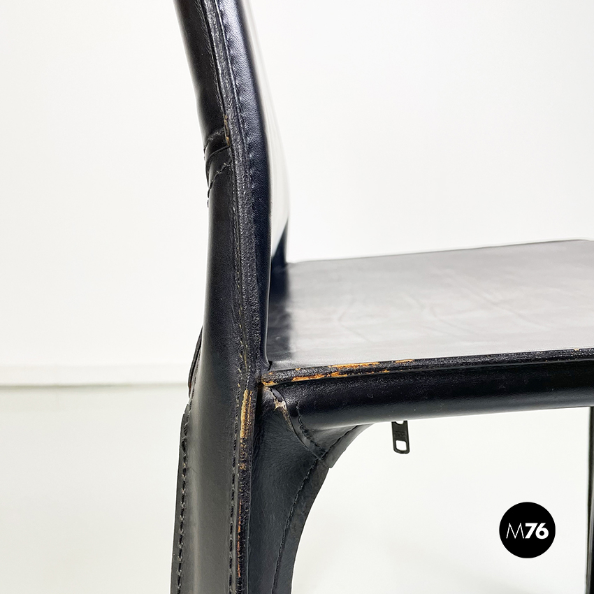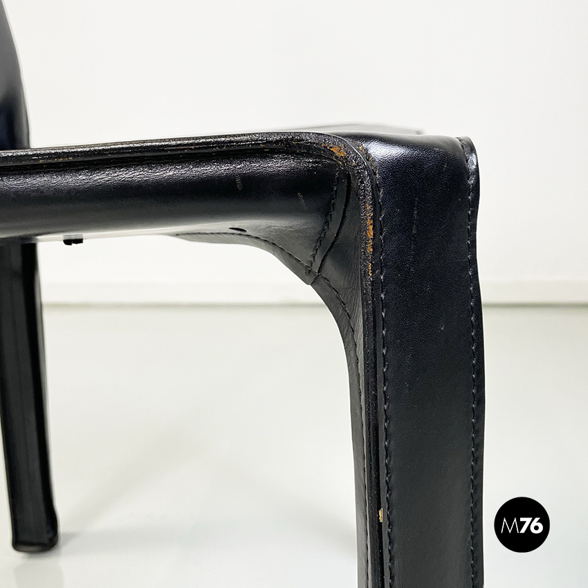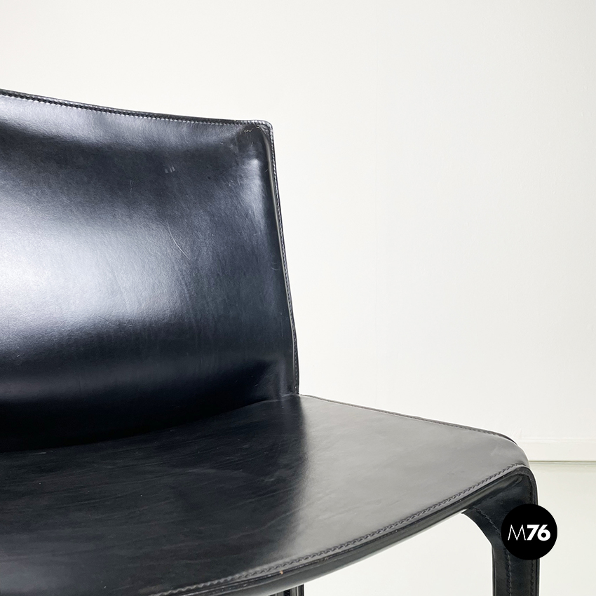 Set di sei sedie model CAB 412 in pelle nera. Il cuoio segue le forme della seduta, dello schienale e delle gambe. Cuciture a vista. Sotto la seduta sono presenti delle cerniere che chiudono la pelle.