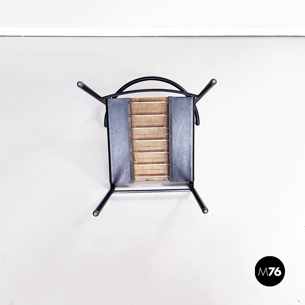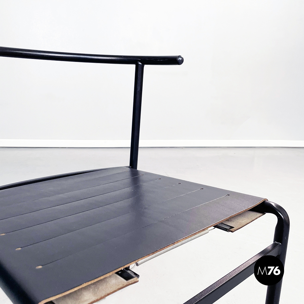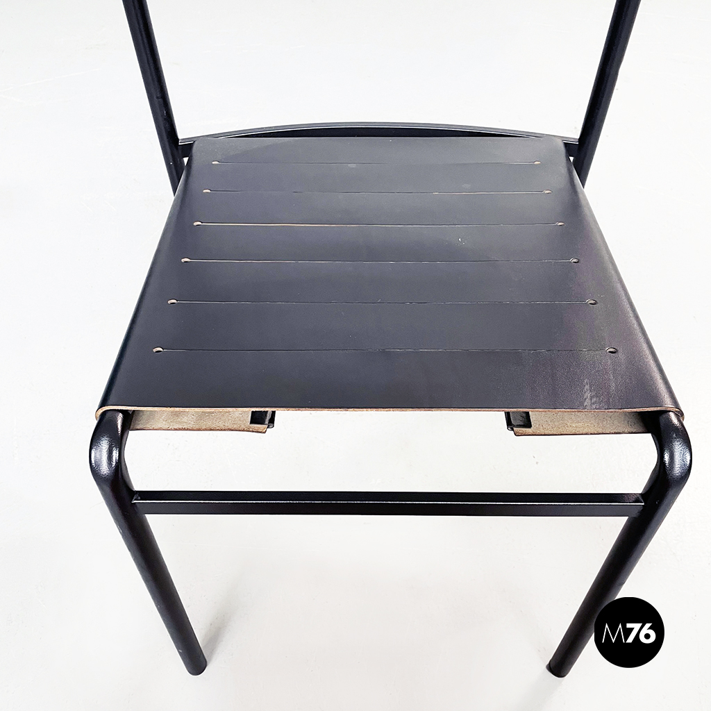 Coppia di sedie modello Cafè Chair con seduta squadrata in pelle nera. La seduta è composta da una striscia di cuoio con presenti sei tagli orizzontali, sostenuta da cinghie in lattice di gomma e polipropilene. La struttura è in acciaio tubolare verniciato nero. Lo schienale è composto da dell’acciaio tubolare ricurvo. Impilabili.