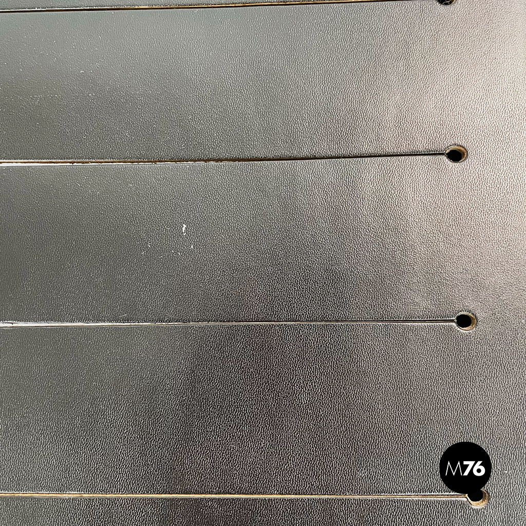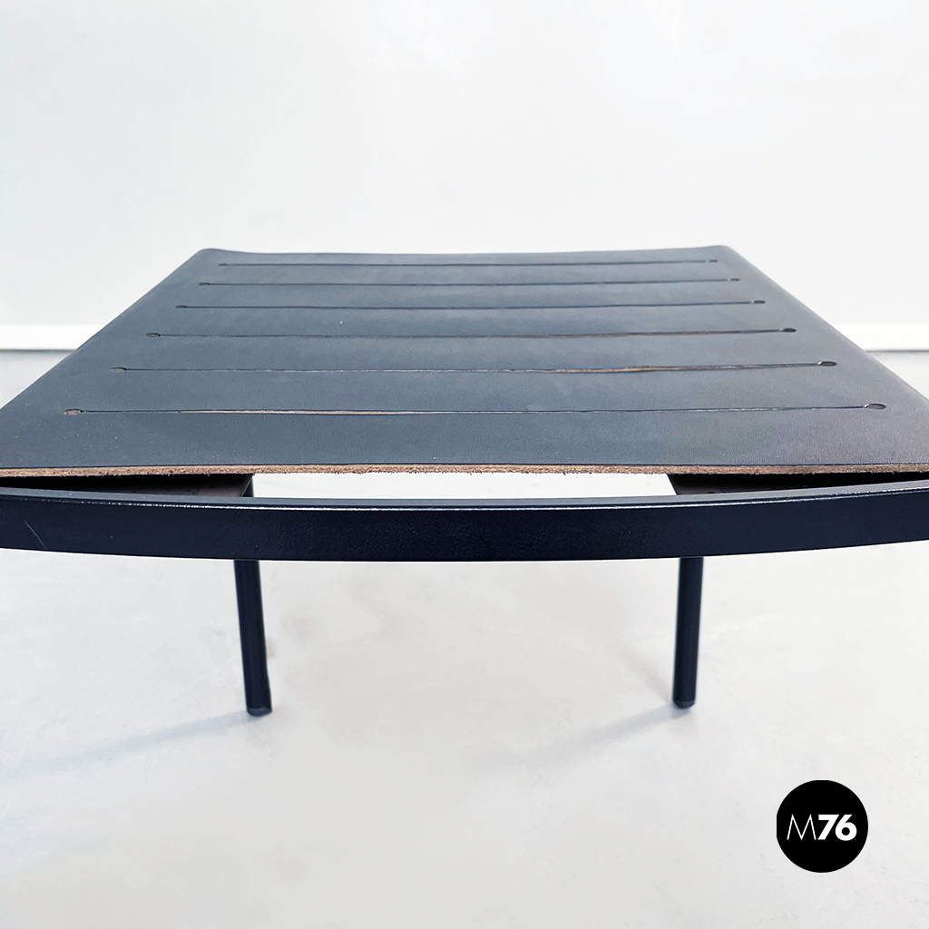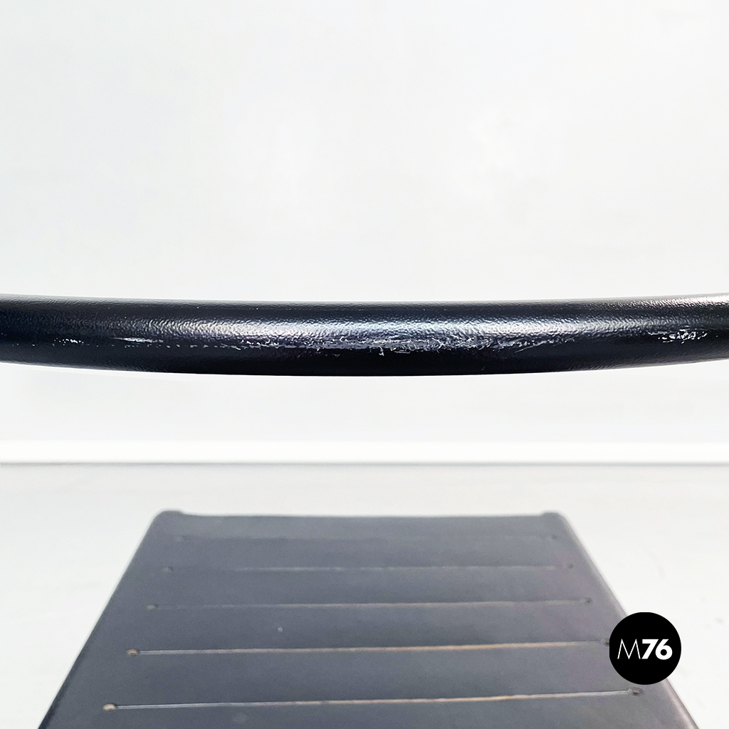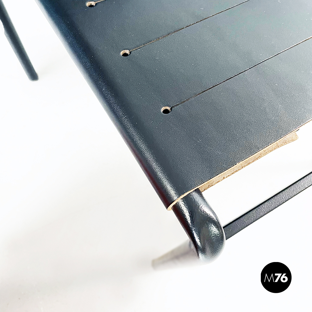 Coppia di sedie modello Cafè Chair con seduta squadrata in pelle nera. La seduta è composta da una striscia di cuoio con presenti sei tagli orizzontali, sostenuta da cinghie in lattice di gomma e polipropilene. La struttura è in acciaio tubolare verniciato nero. Lo schienale è composto da dell’acciaio tubolare ricurvo. Impilabili.