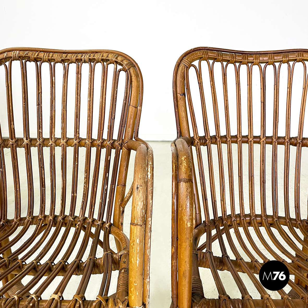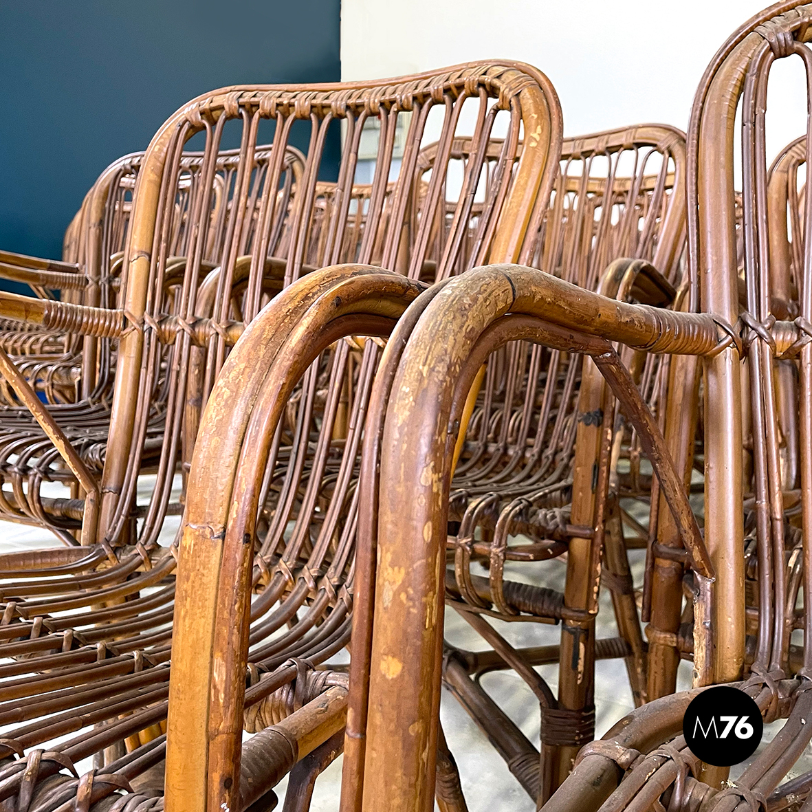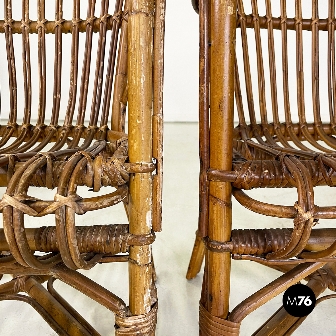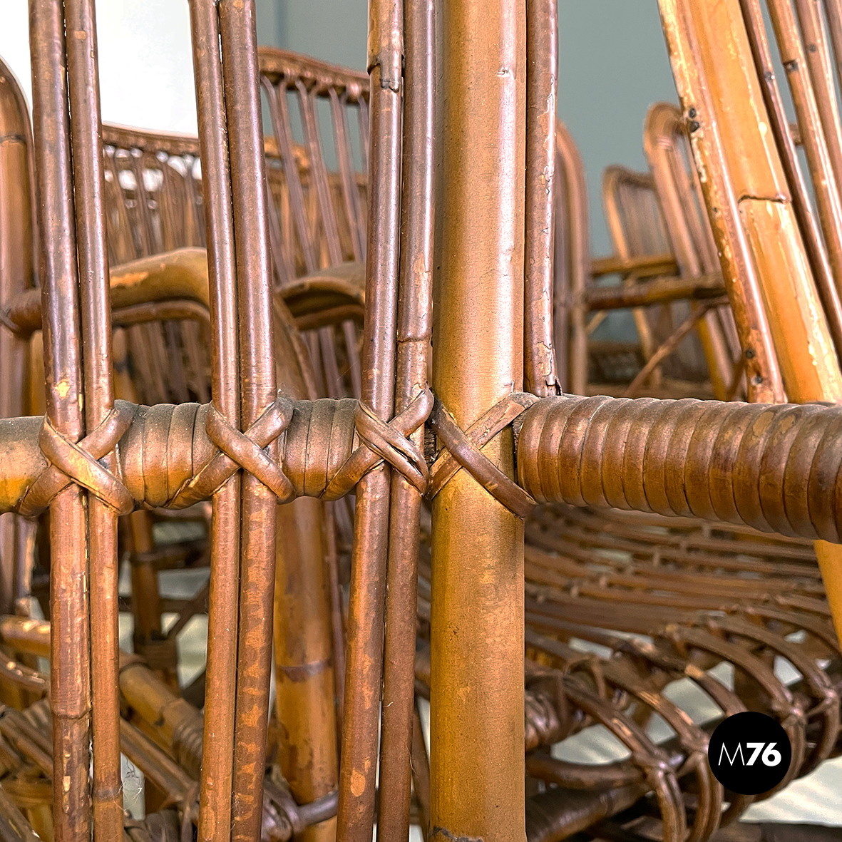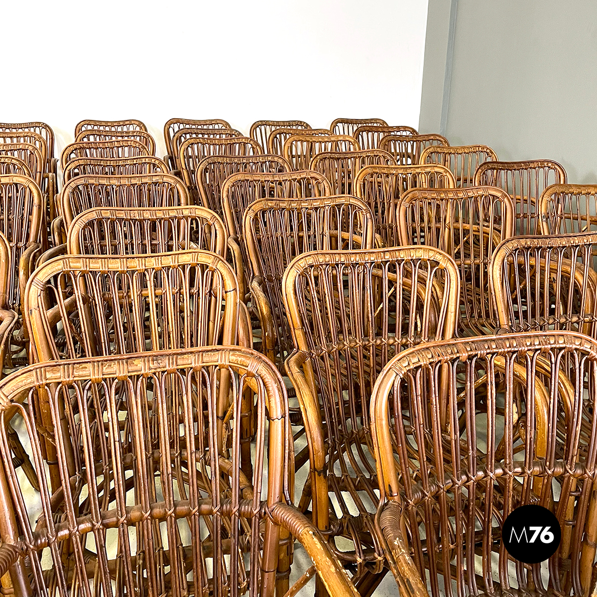 Set di quarantaquattro poltrone o sedie con braccioli curvati in bamboo o rattan di diverse sfumature finemente intrecciato. Le zampe sono congiunte nel mezzo da una struttura a X. Adatte ad uso esterno come in giardino o terrazzo.