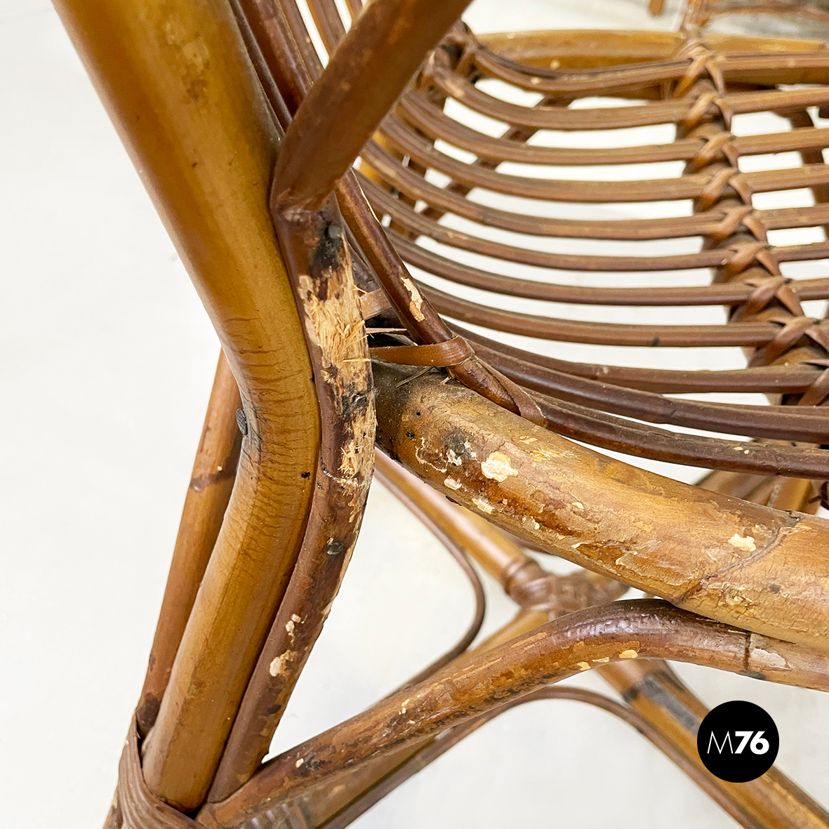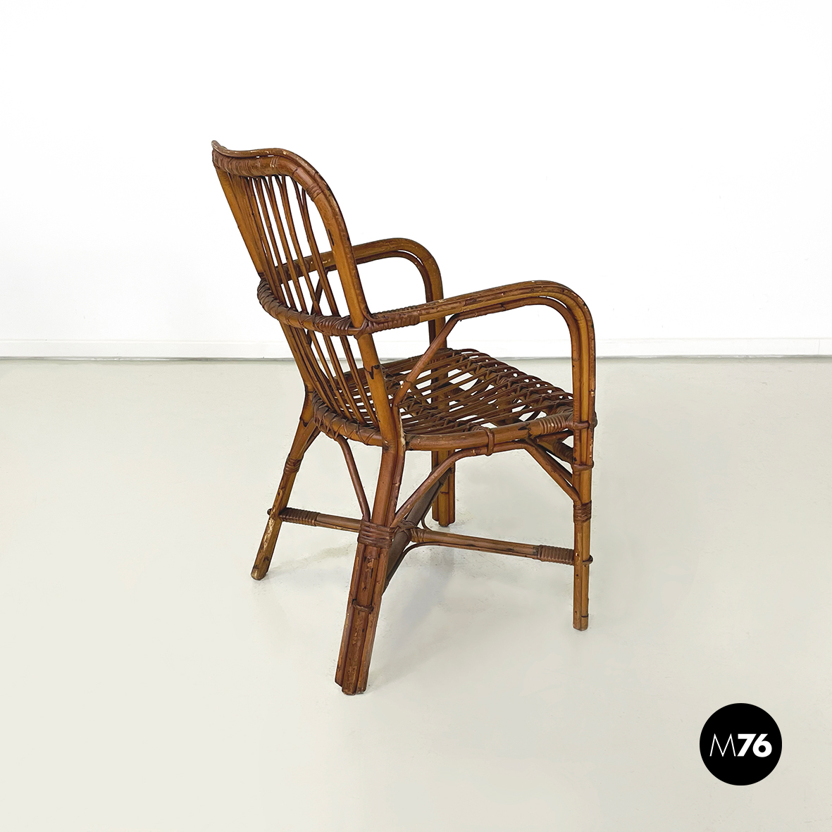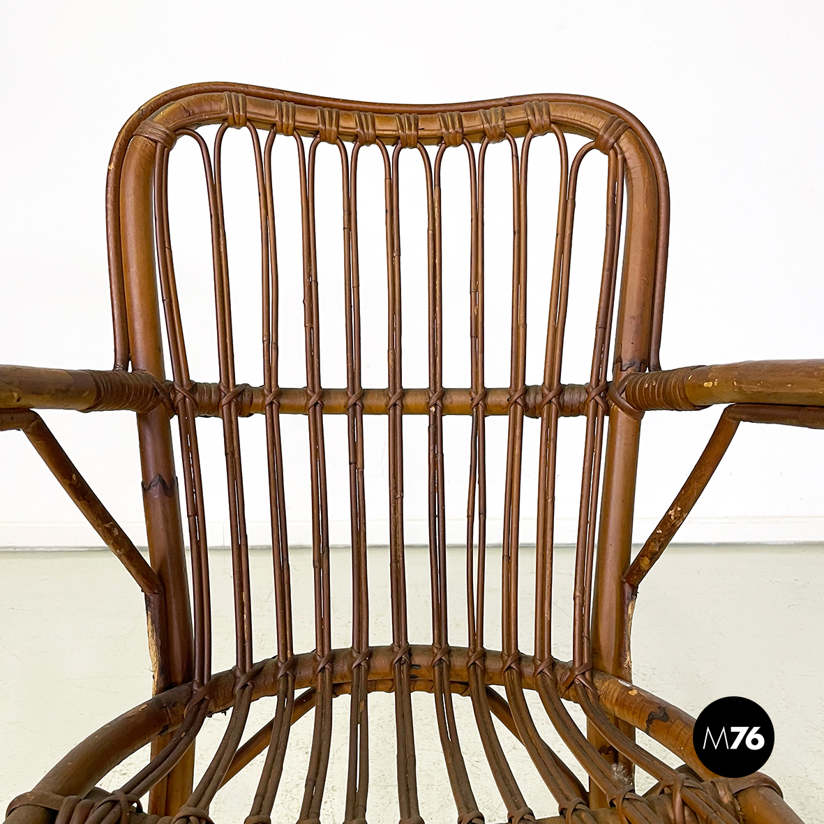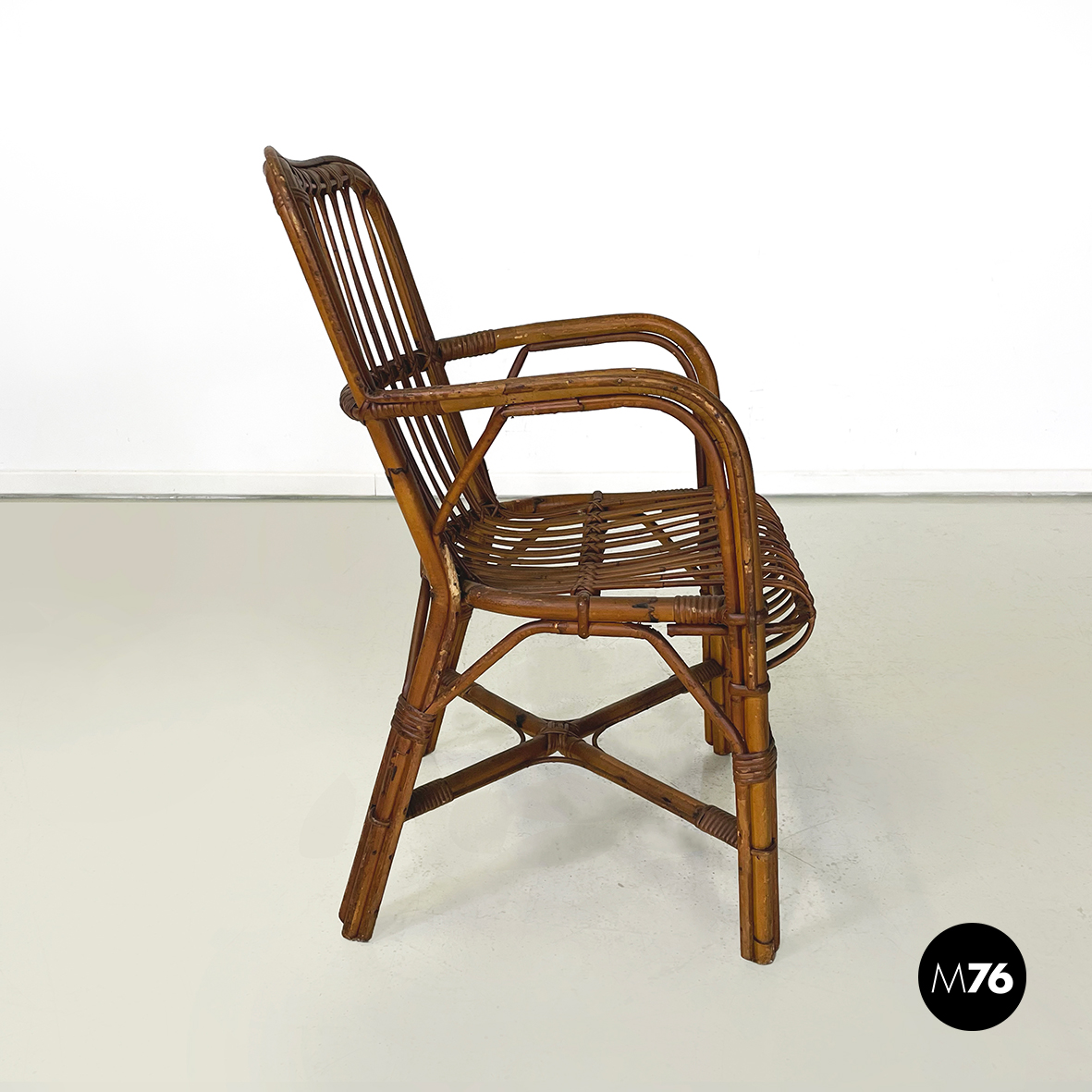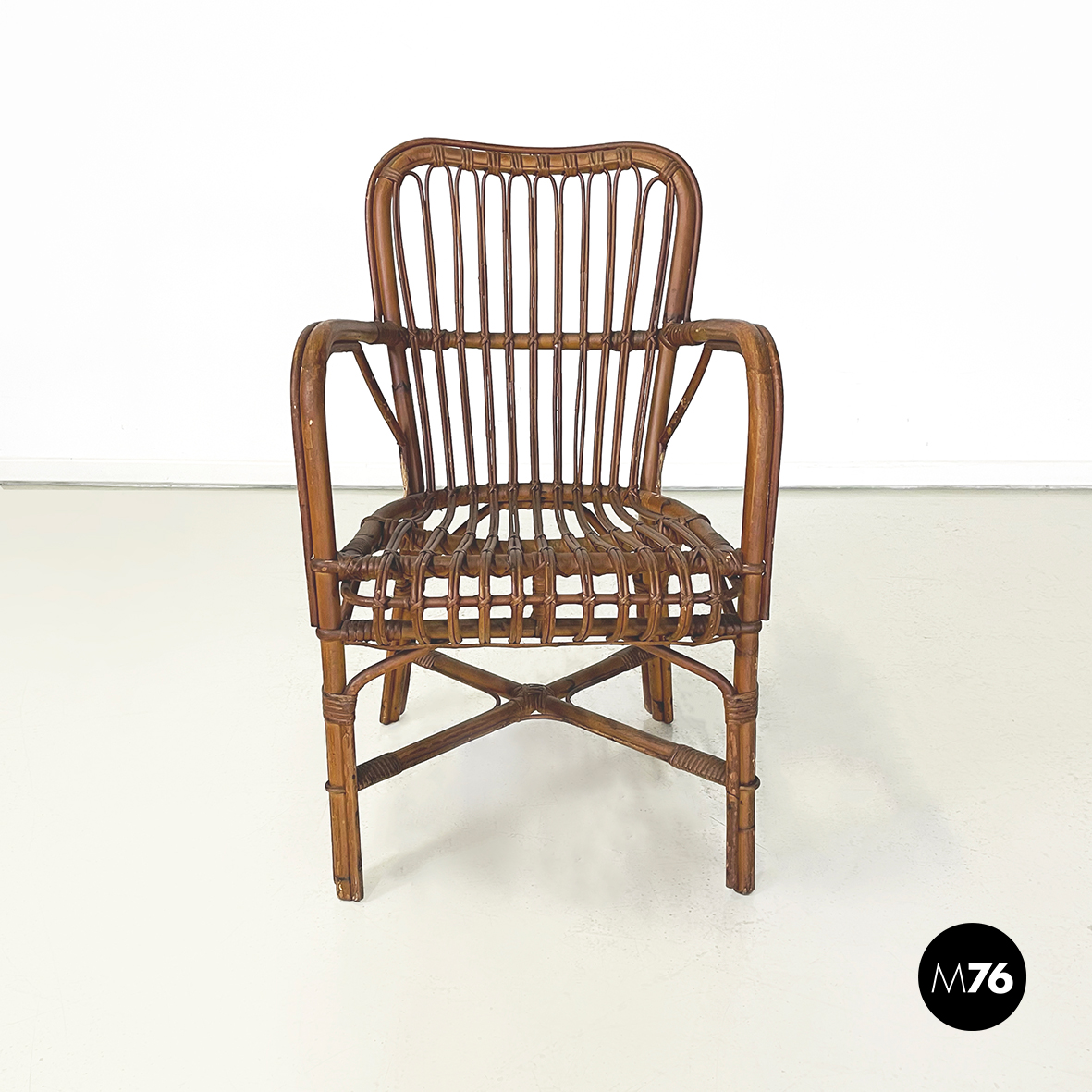 Set di quarantaquattro poltrone o sedie con braccioli curvati in bamboo o rattan di diverse sfumature finemente intrecciato. Le zampe sono congiunte nel mezzo da una struttura a X. Adatte ad uso esterno come in giardino o terrazzo.