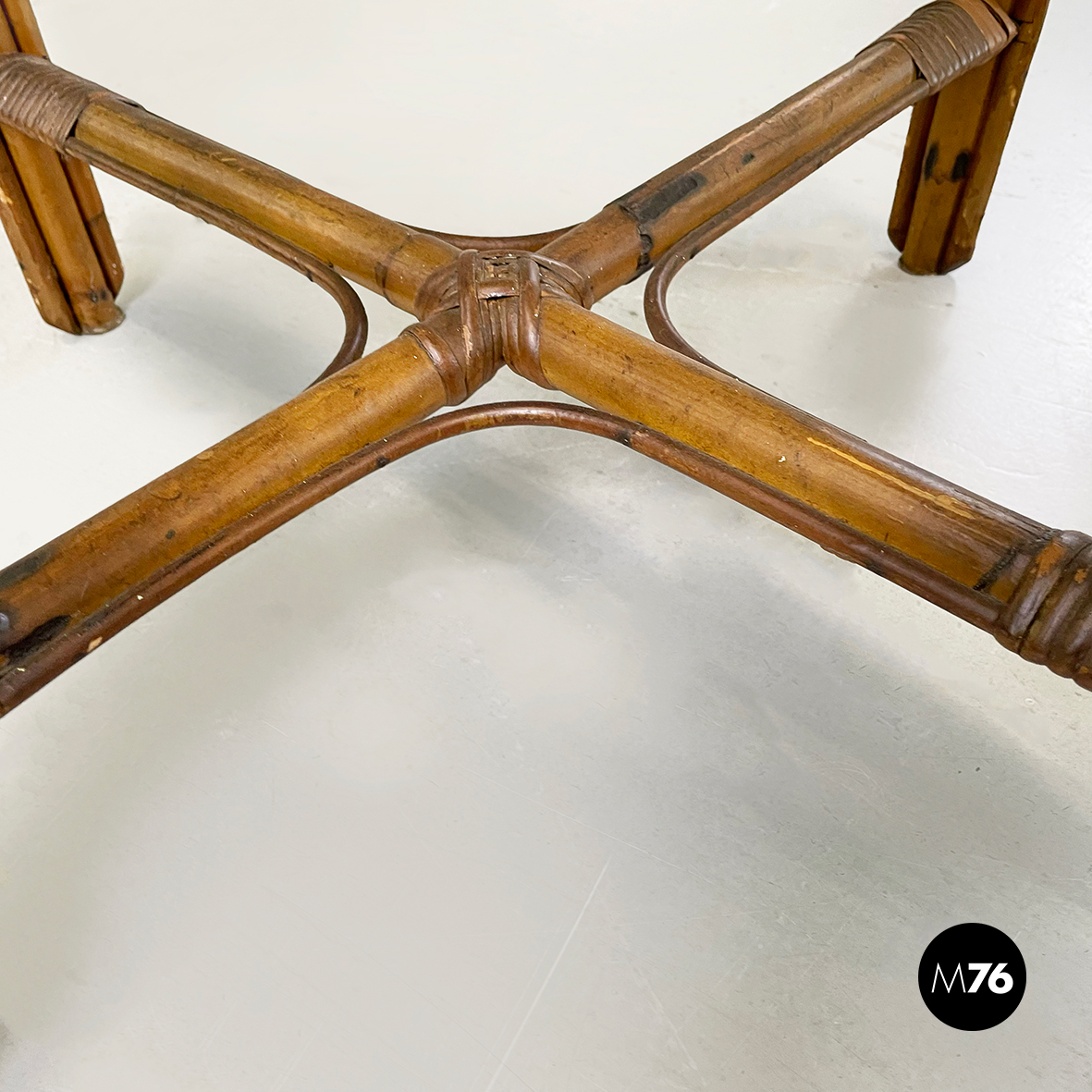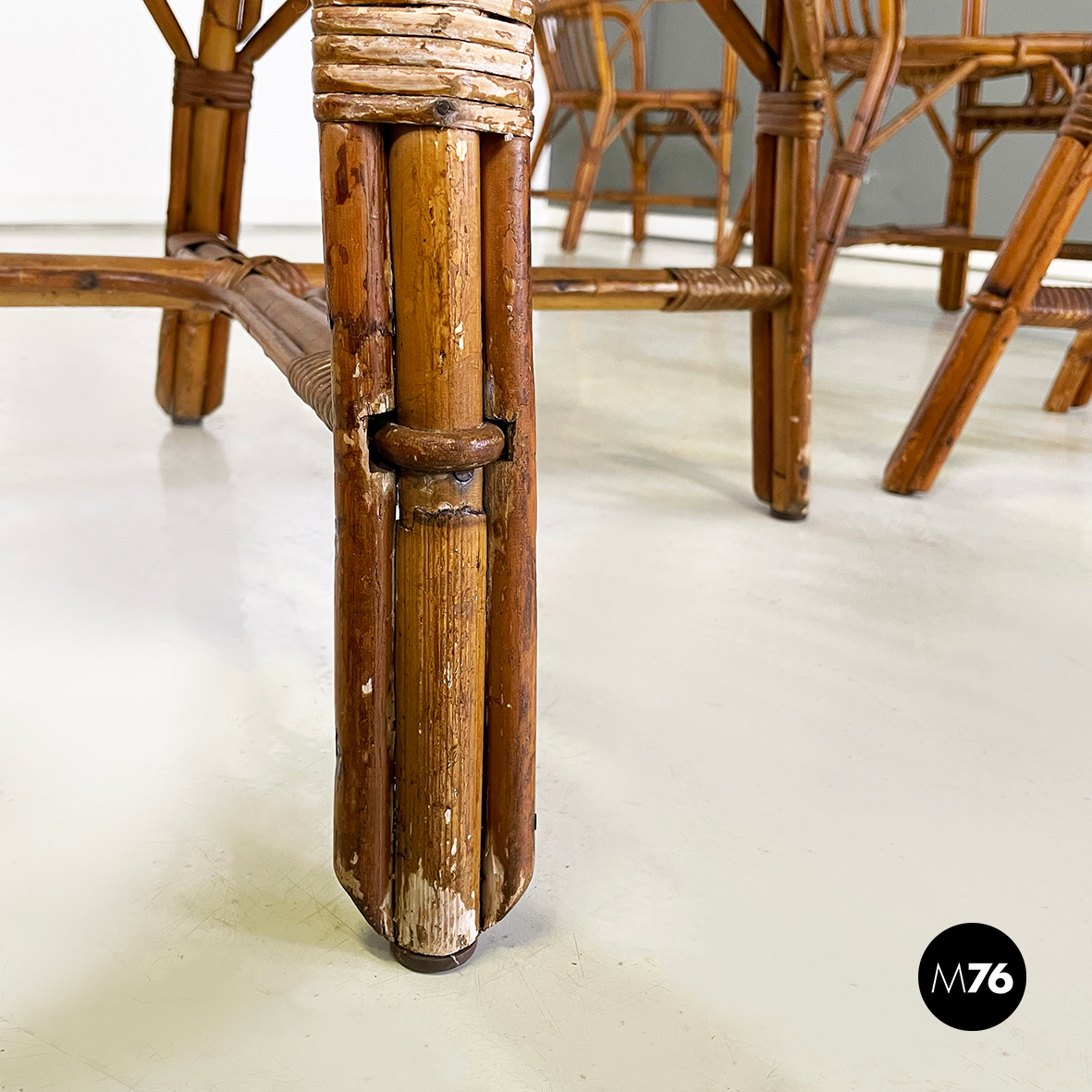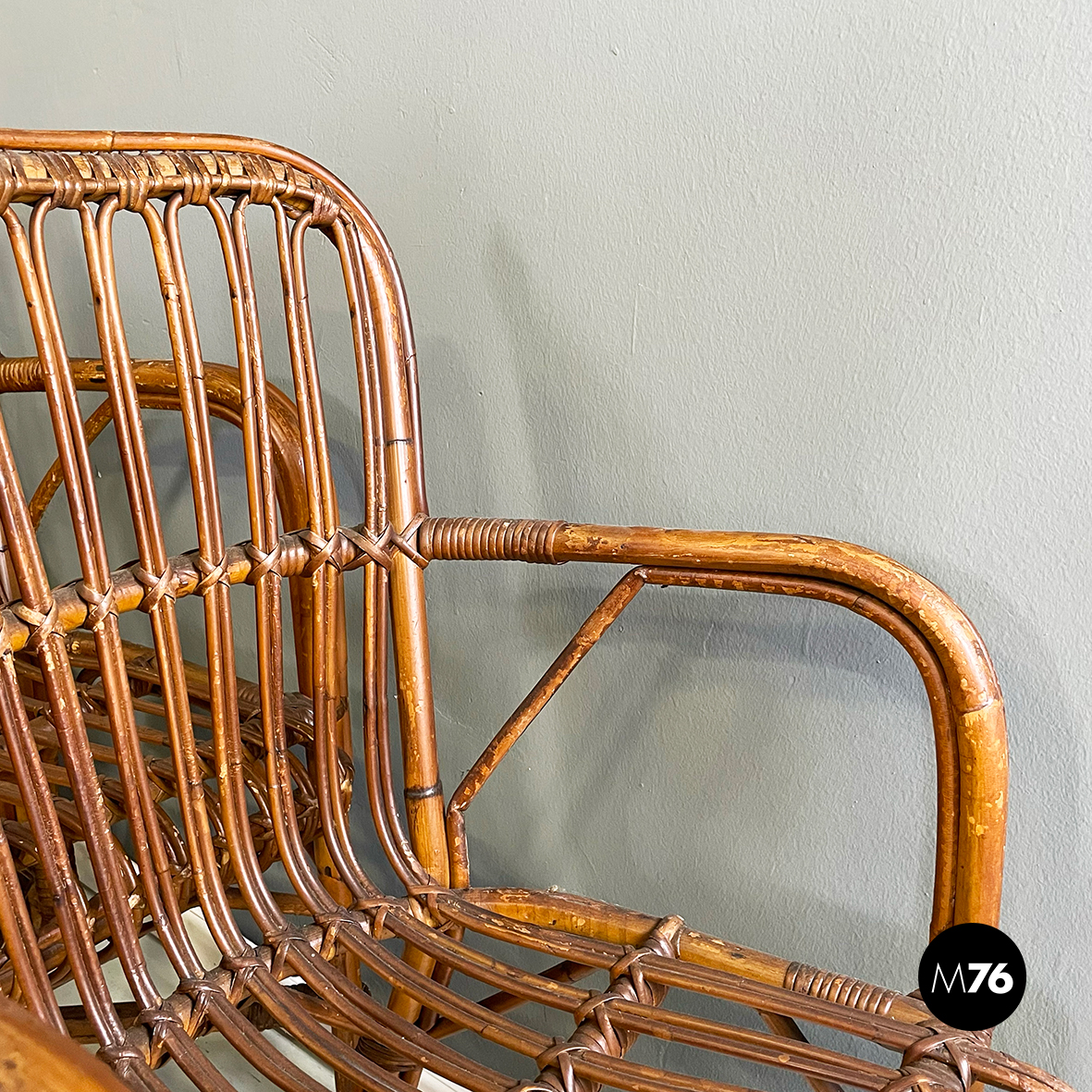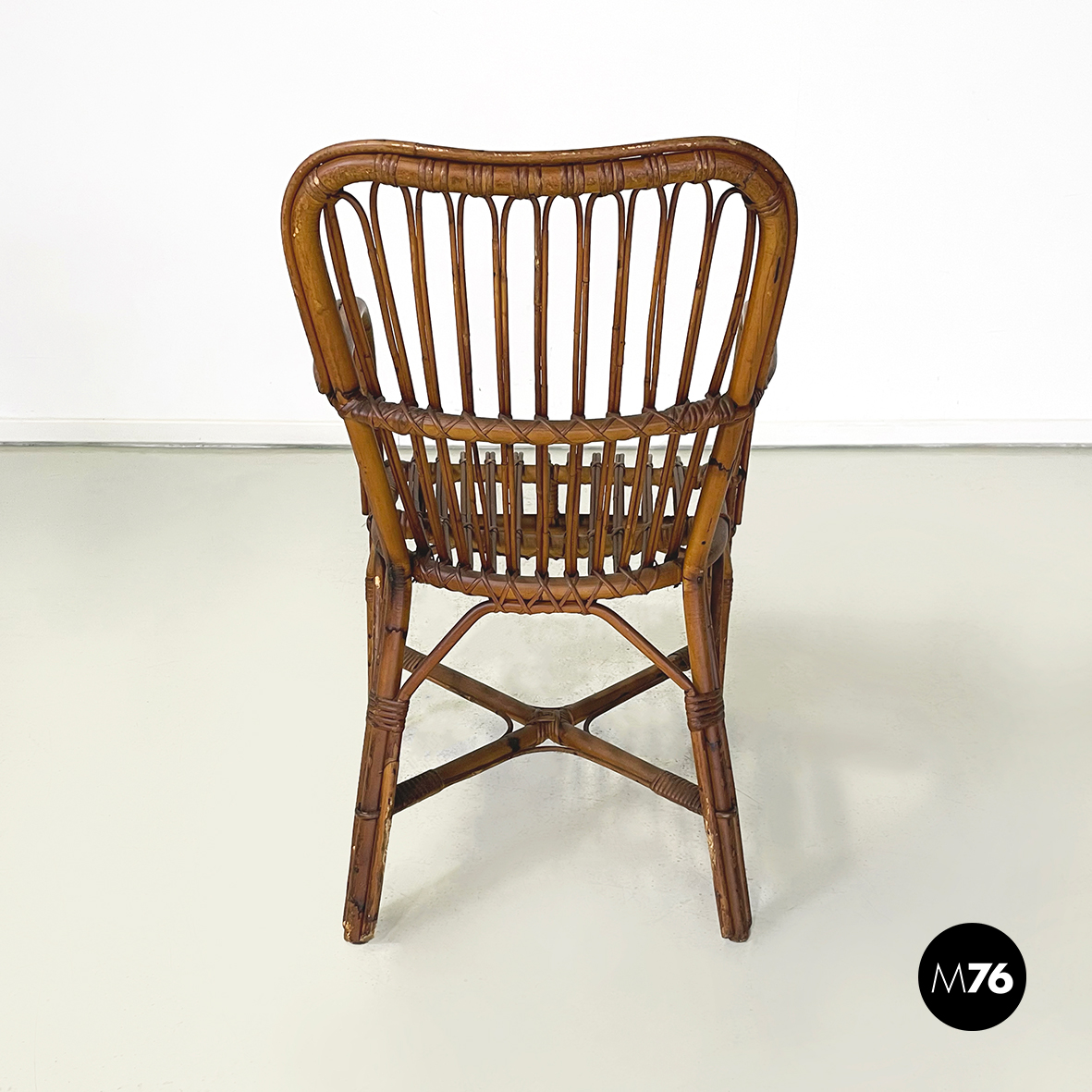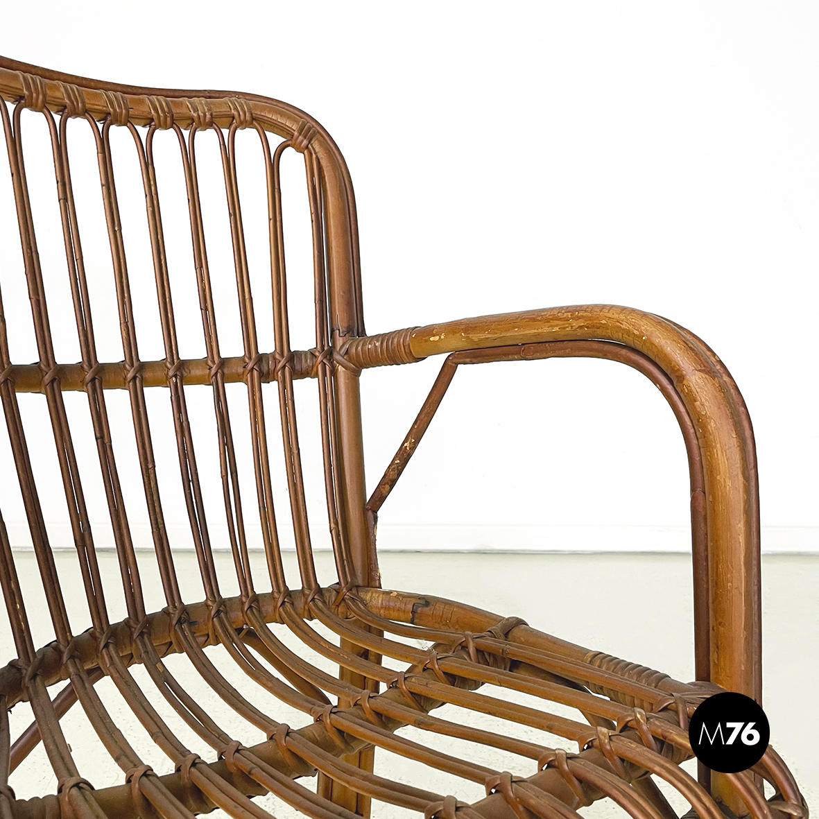 Set di quarantaquattro poltrone o sedie con braccioli curvati in bamboo o rattan di diverse sfumature finemente intrecciato. Le zampe sono congiunte nel mezzo da una struttura a X. Adatte ad uso esterno come in giardino o terrazzo.