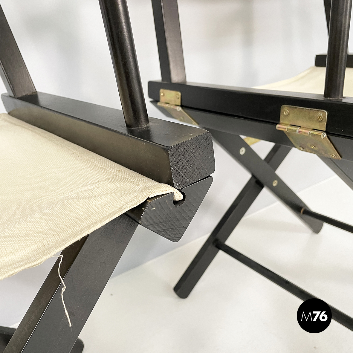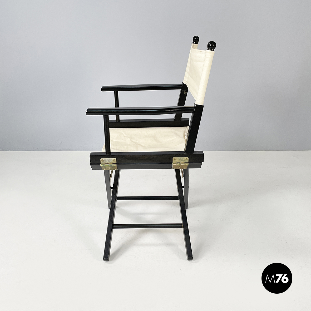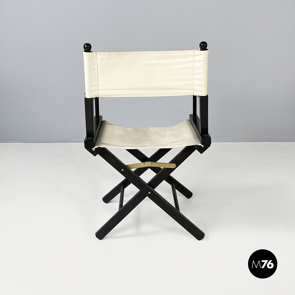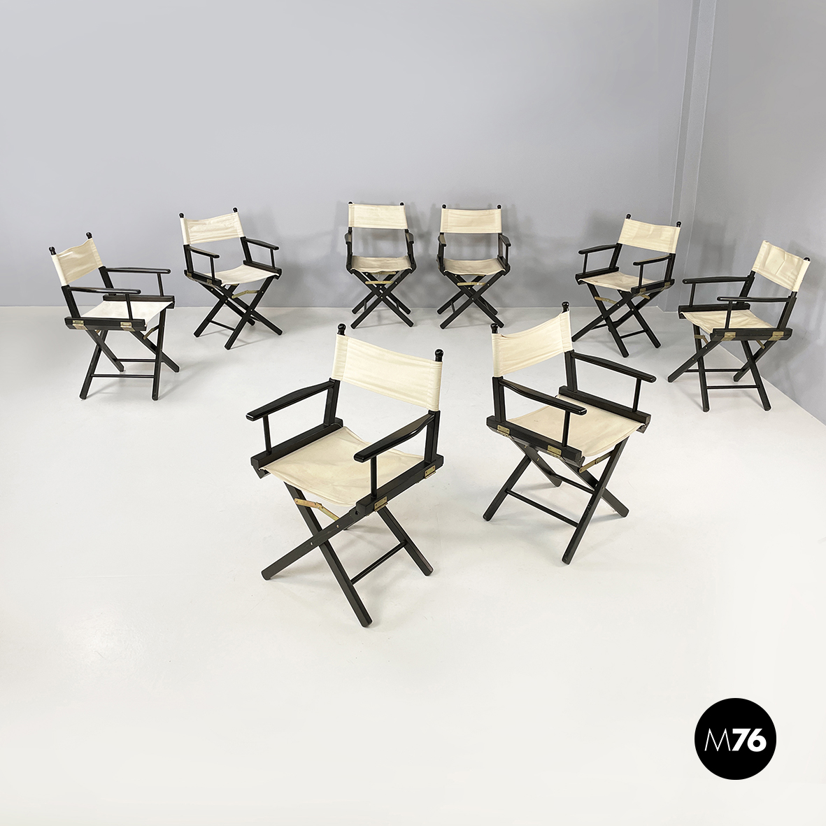 Set di otto sedie da regista pieghevoli con struttura in legno verniciato nero. La seduta squadrata e schienale rettangolare sono composti da un lembo di tessuto bianco, incastrato nella struttura. Sfere decorative alla fine dello schienale. Braccioli squadrati. Le zampe sono a X con un piccolo inserto in metallo, il quale permette la chiusura della sedia.