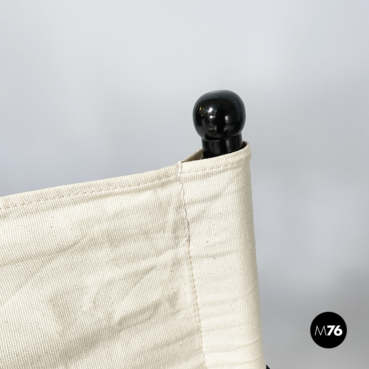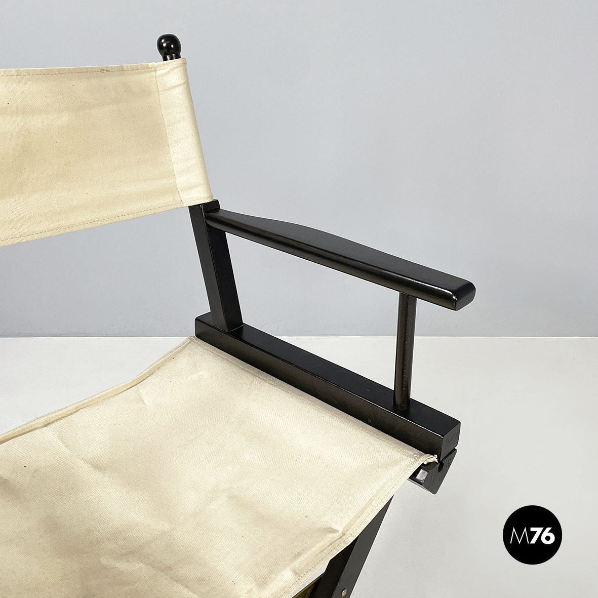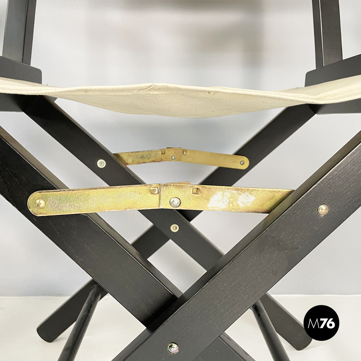 Set di otto sedie da regista pieghevoli con struttura in legno verniciato nero. La seduta squadrata e schienale rettangolare sono composti da un lembo di tessuto bianco, incastrato nella struttura. Sfere decorative alla fine dello schienale. Braccioli squadrati. Le zampe sono a X con un piccolo inserto in metallo, il quale permette la chiusura della sedia.