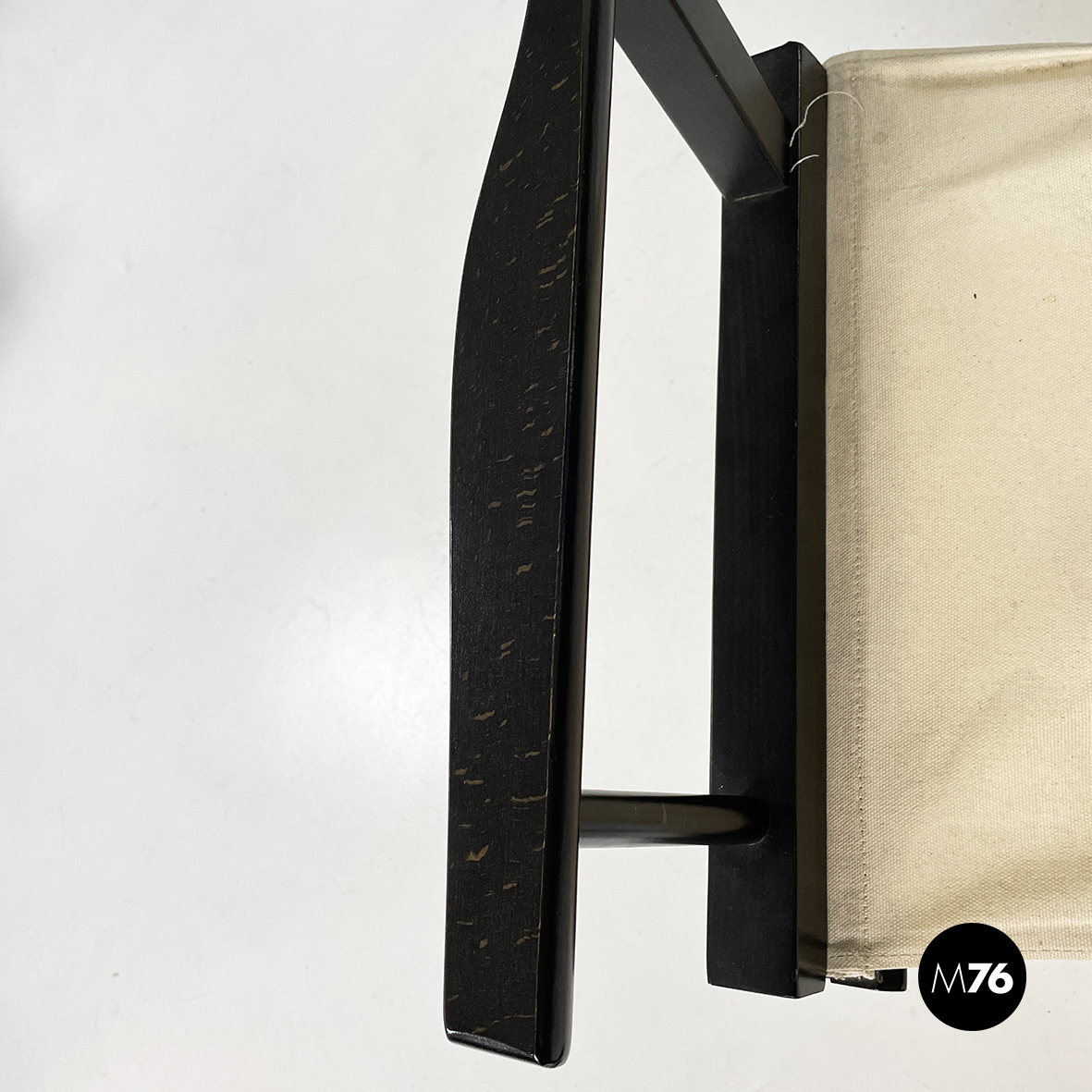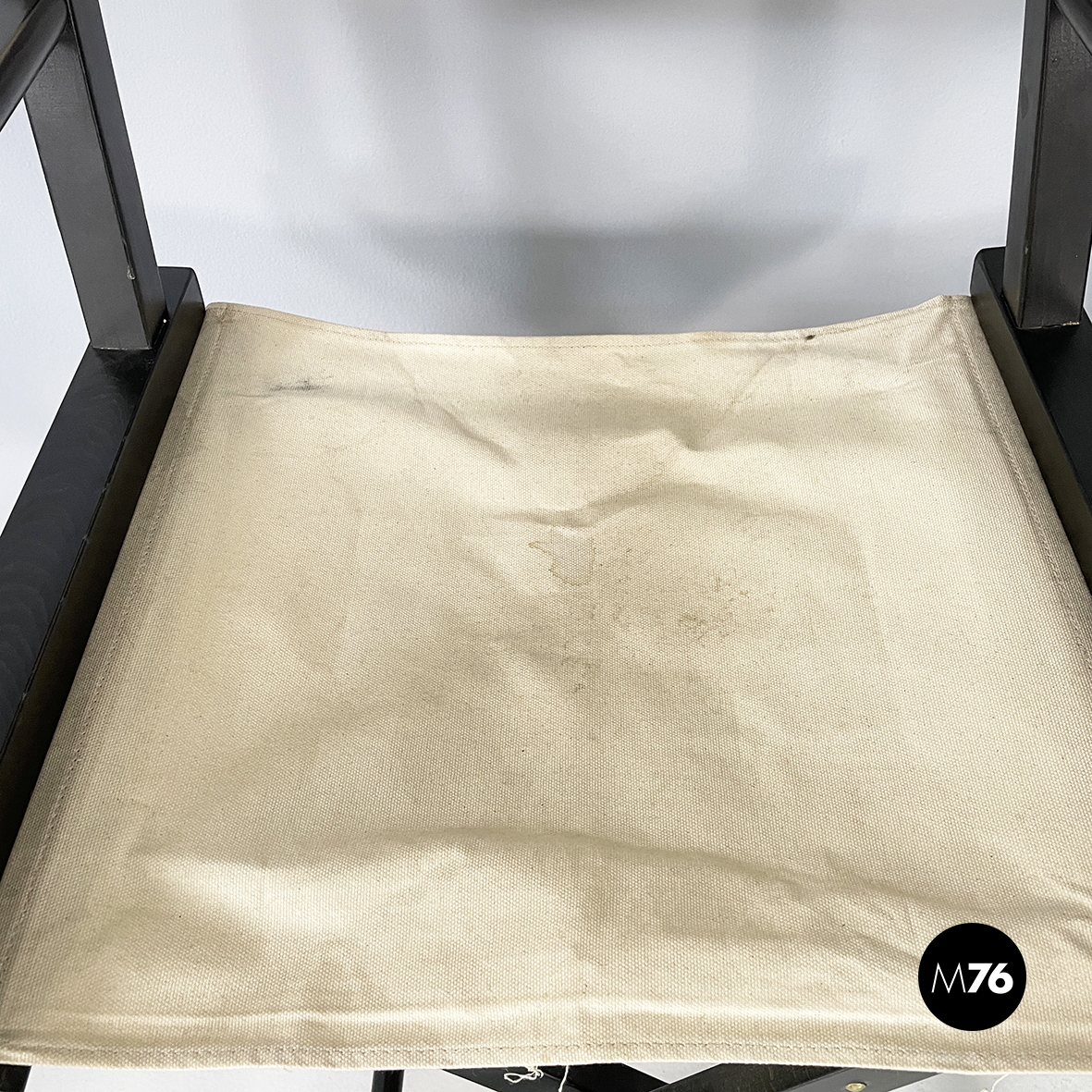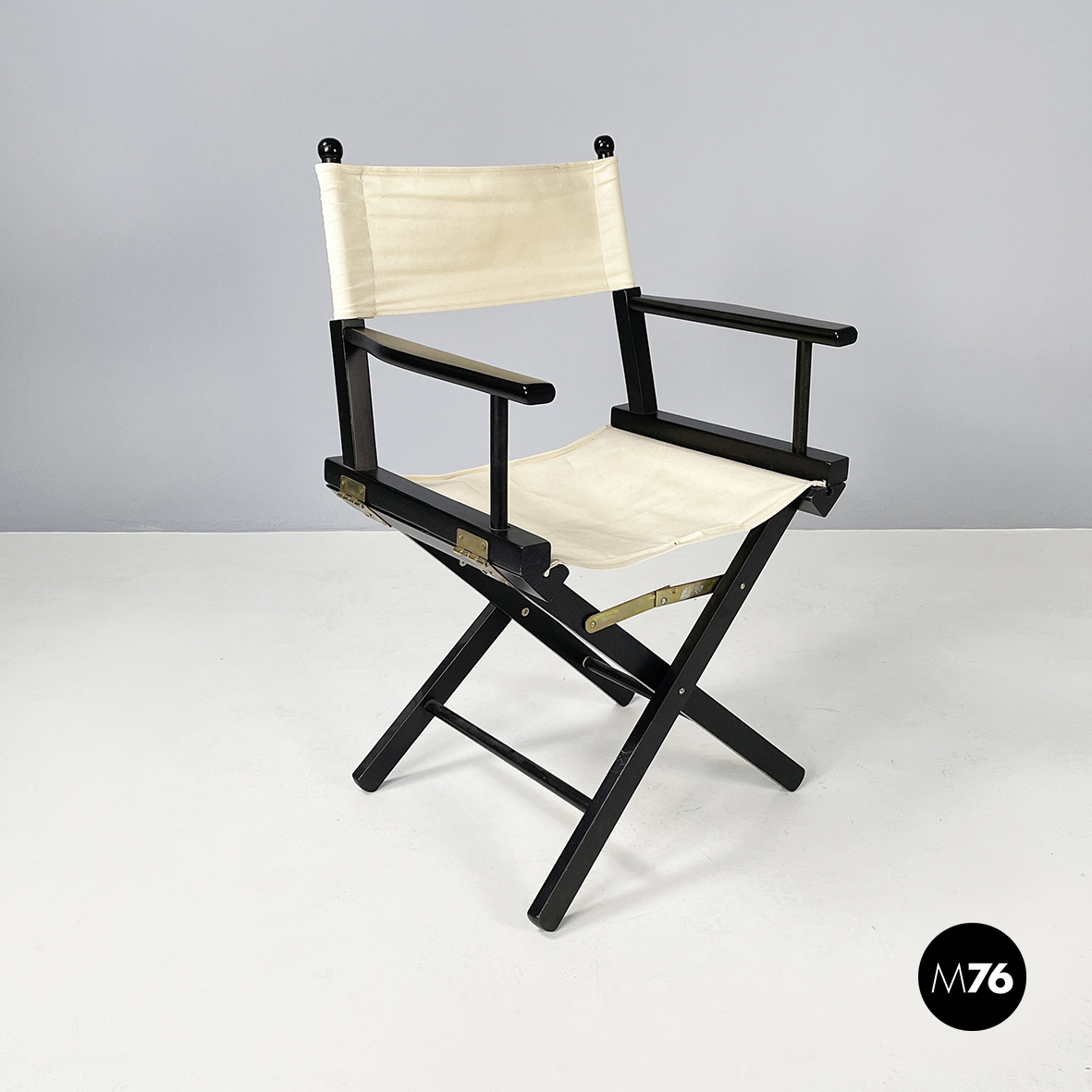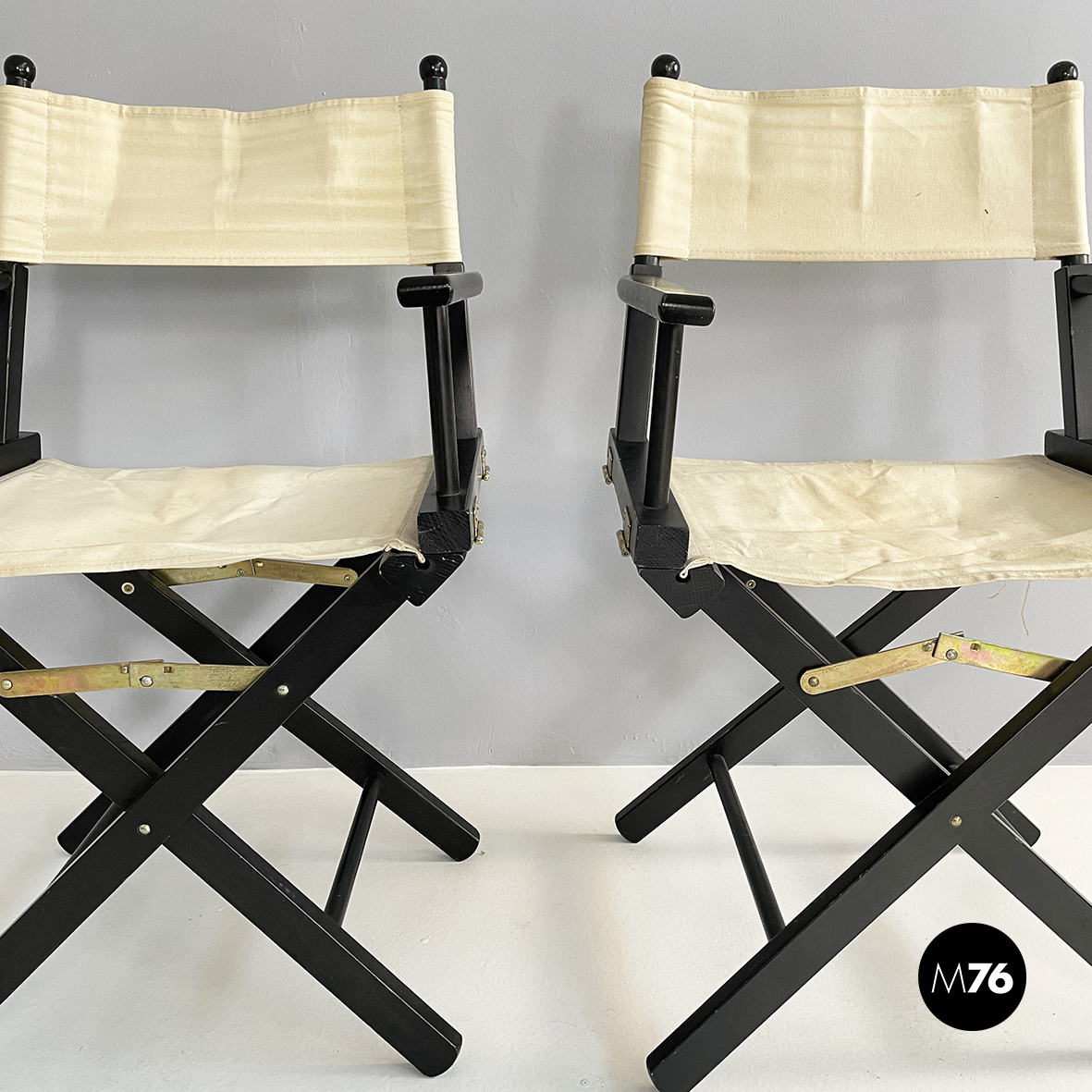 Set di otto sedie da regista pieghevoli con struttura in legno verniciato nero. La seduta squadrata e schienale rettangolare sono composti da un lembo di tessuto bianco, incastrato nella struttura. Sfere decorative alla fine dello schienale. Braccioli squadrati. Le zampe sono a X con un piccolo inserto in metallo, il quale permette la chiusura della sedia.