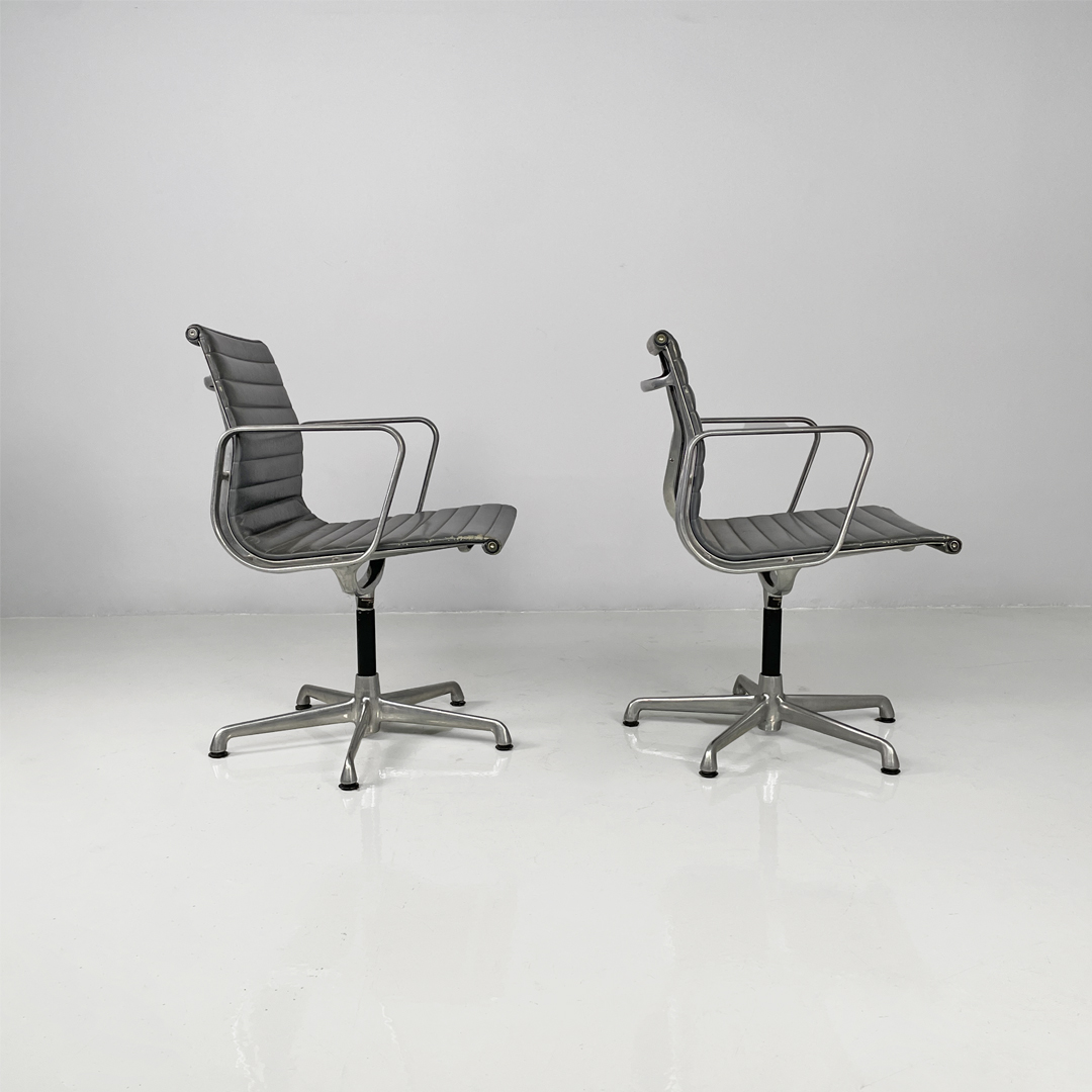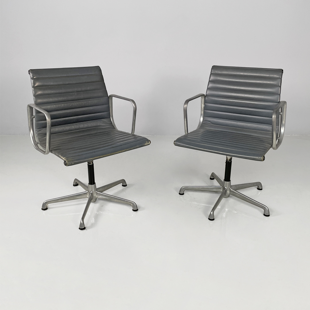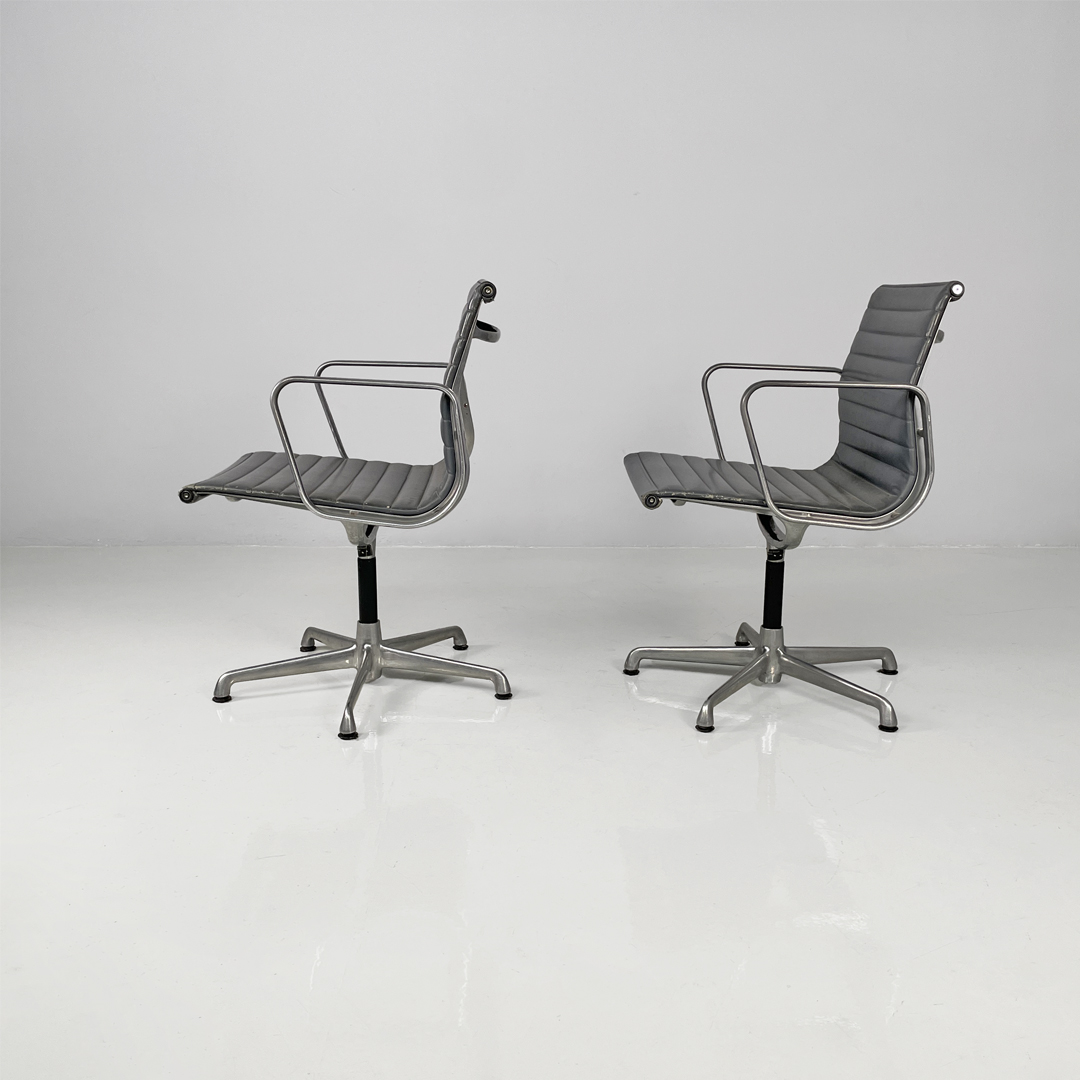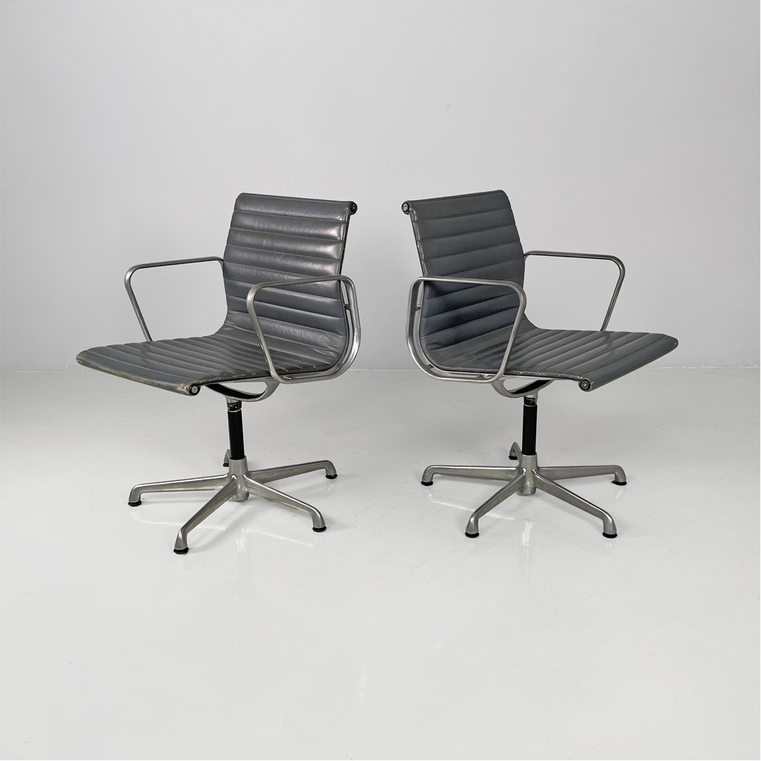 Coppia di sedie da ufficio modello EA108 in metallo e pelle. La seduta e lo schienale sono rivestite in grigio scuro con cuciture orizzontali. La struttura è in metallo argentato e presenta cinque razze che terminano con gommini.