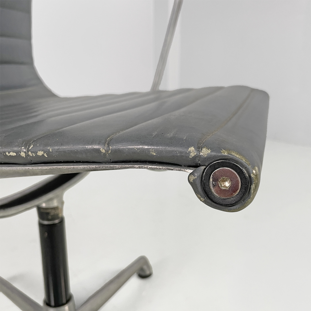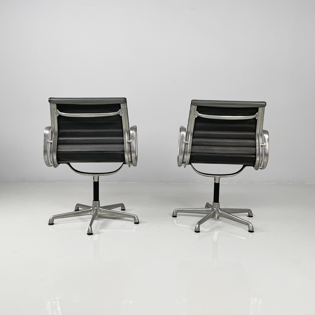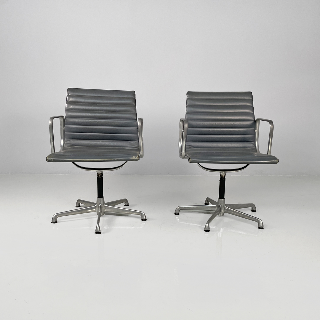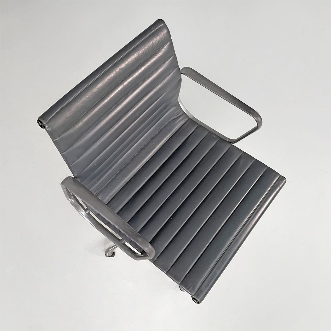 Coppia di sedie da ufficio modello EA108 in metallo e pelle. La seduta e lo schienale sono rivestite in grigio scuro con cuciture orizzontali. La struttura è in metallo argentato e presenta cinque razze che terminano con gommini.
