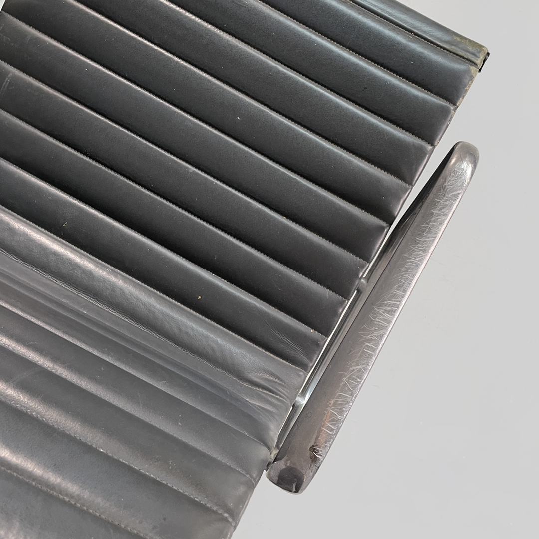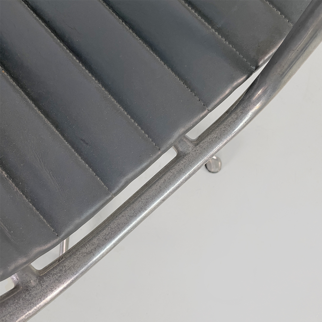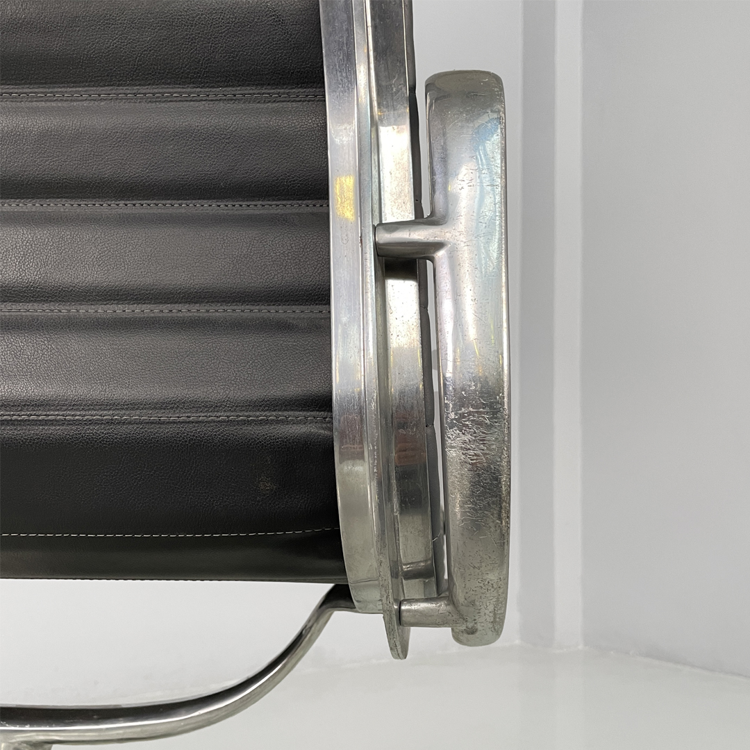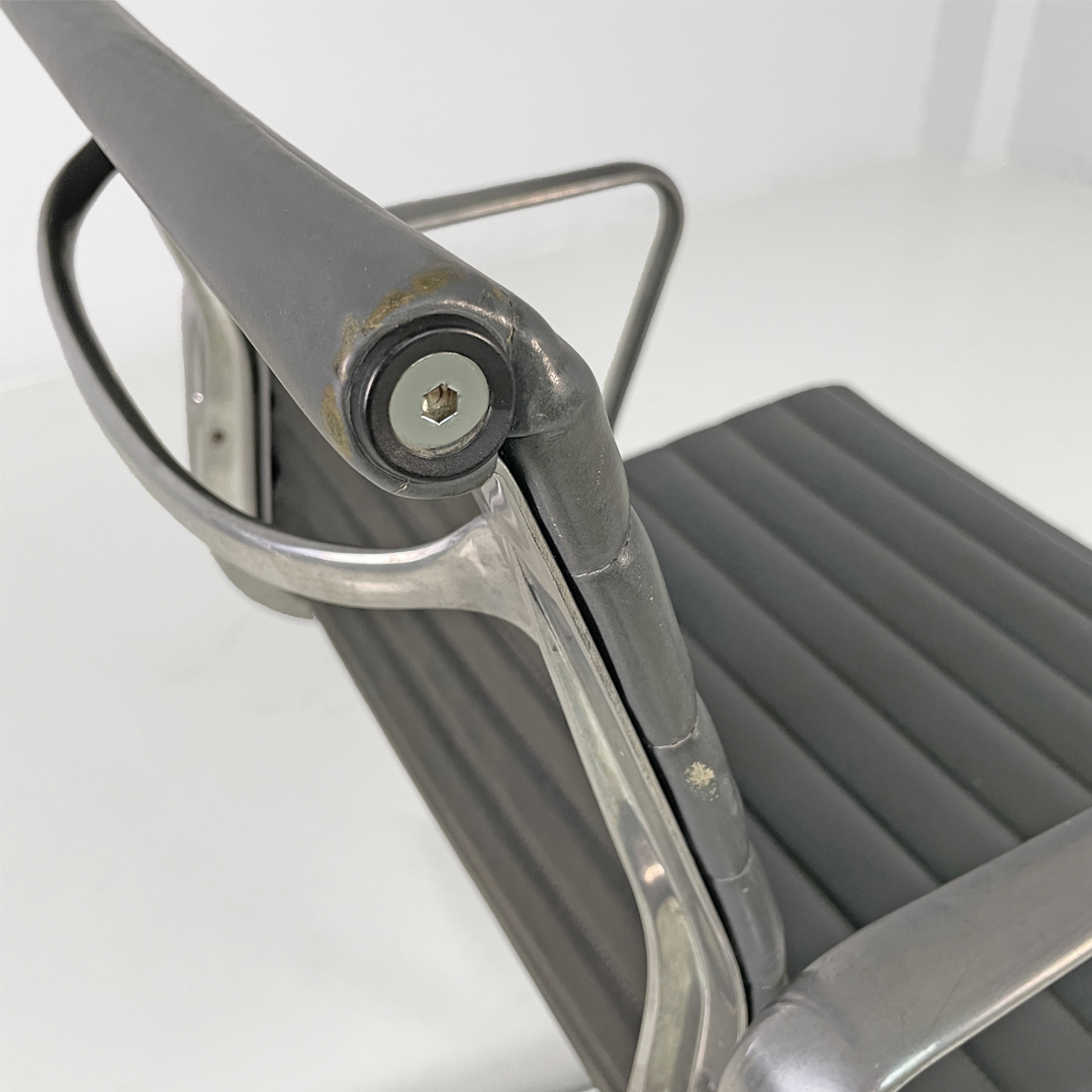 Coppia di sedie da ufficio modello EA108 in metallo e pelle. La seduta e lo schienale sono rivestite in grigio scuro con cuciture orizzontali. La struttura è in metallo argentato e presenta cinque razze che terminano con gommini.