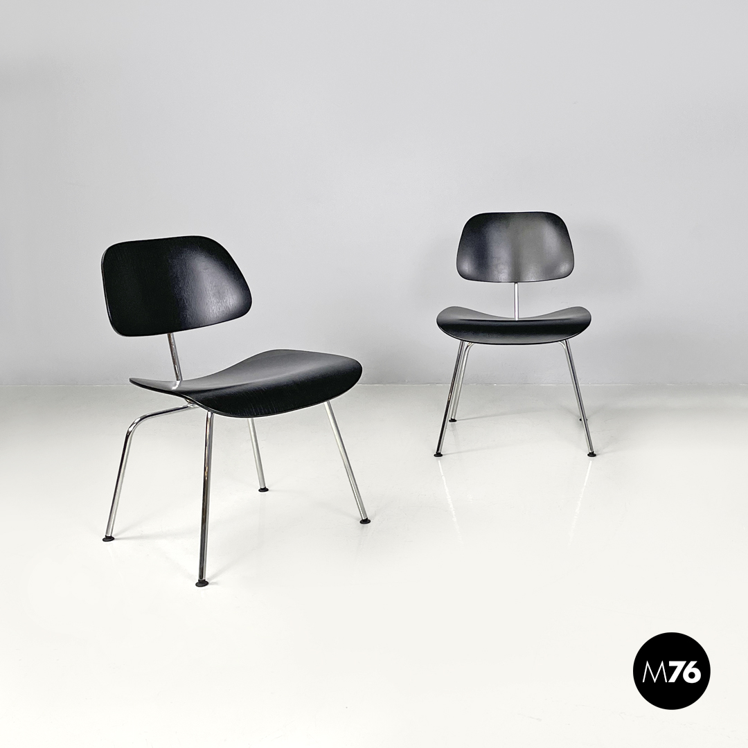 Coppia di sedie modello DCM in legno nero. La seduta e lo schienale sono stondati con lati avvolgenti, la struttura è in tondino di metallo cromato. Con quattro piedini in plastica nera.
