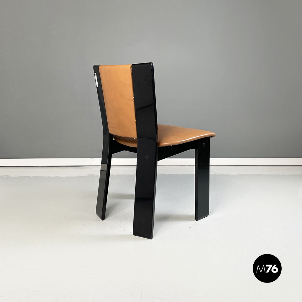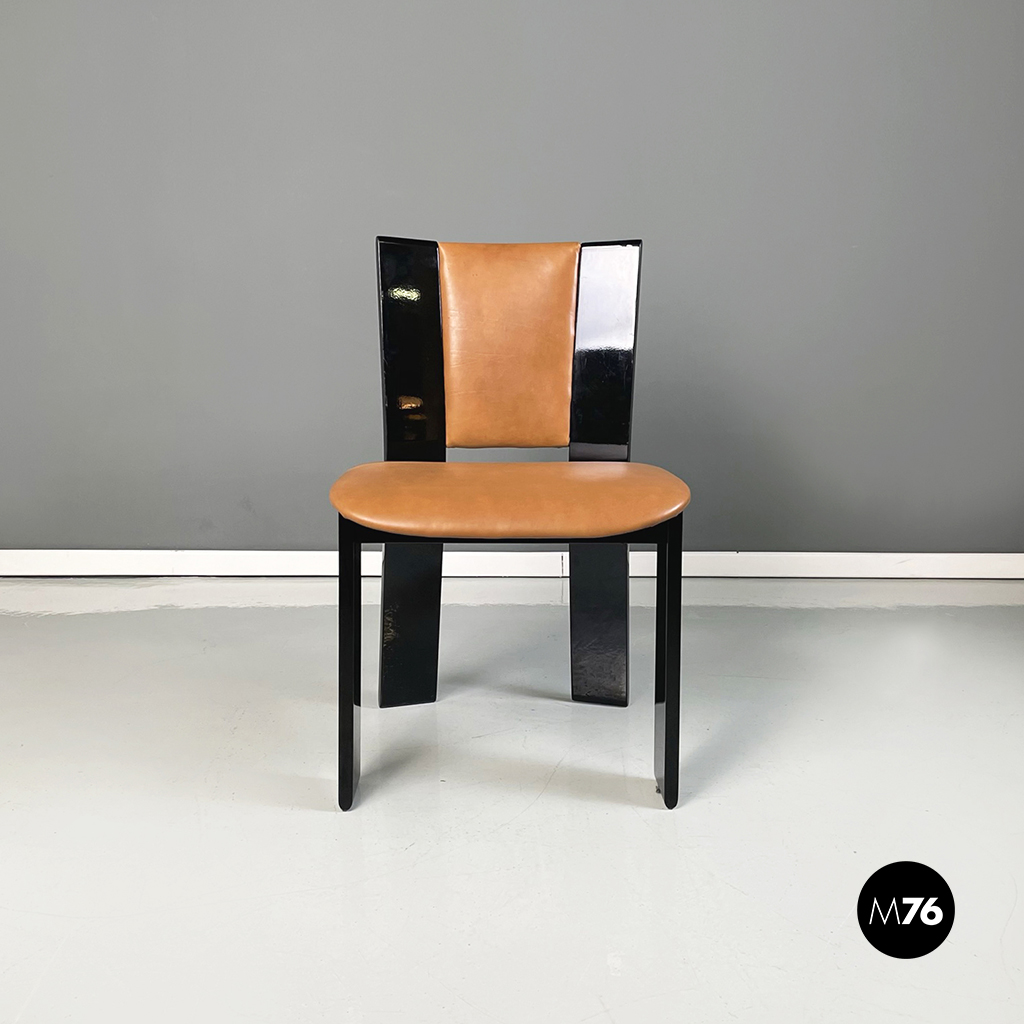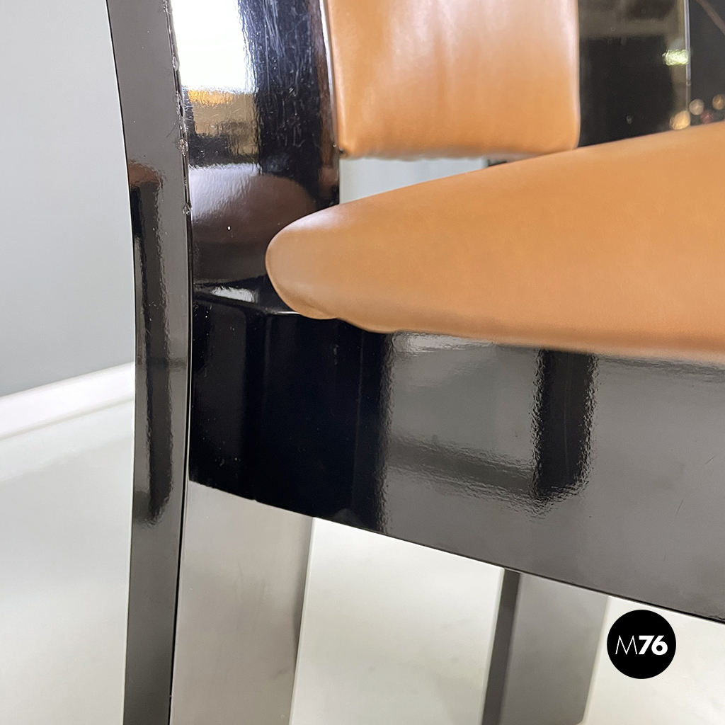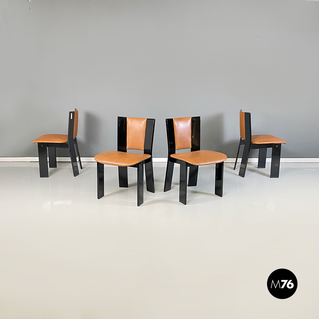 Set di quattro sedie in pelle marrone e legno laccato nero. Lo schienale è composto da due fasce laterali in legno laccato ed una centrale in pelle leggermente imbottita. La seduta è leggermente imbottita e rivestita in pelle marrone. Le zampe a sezione rettangolare sono in legno laccato nero.