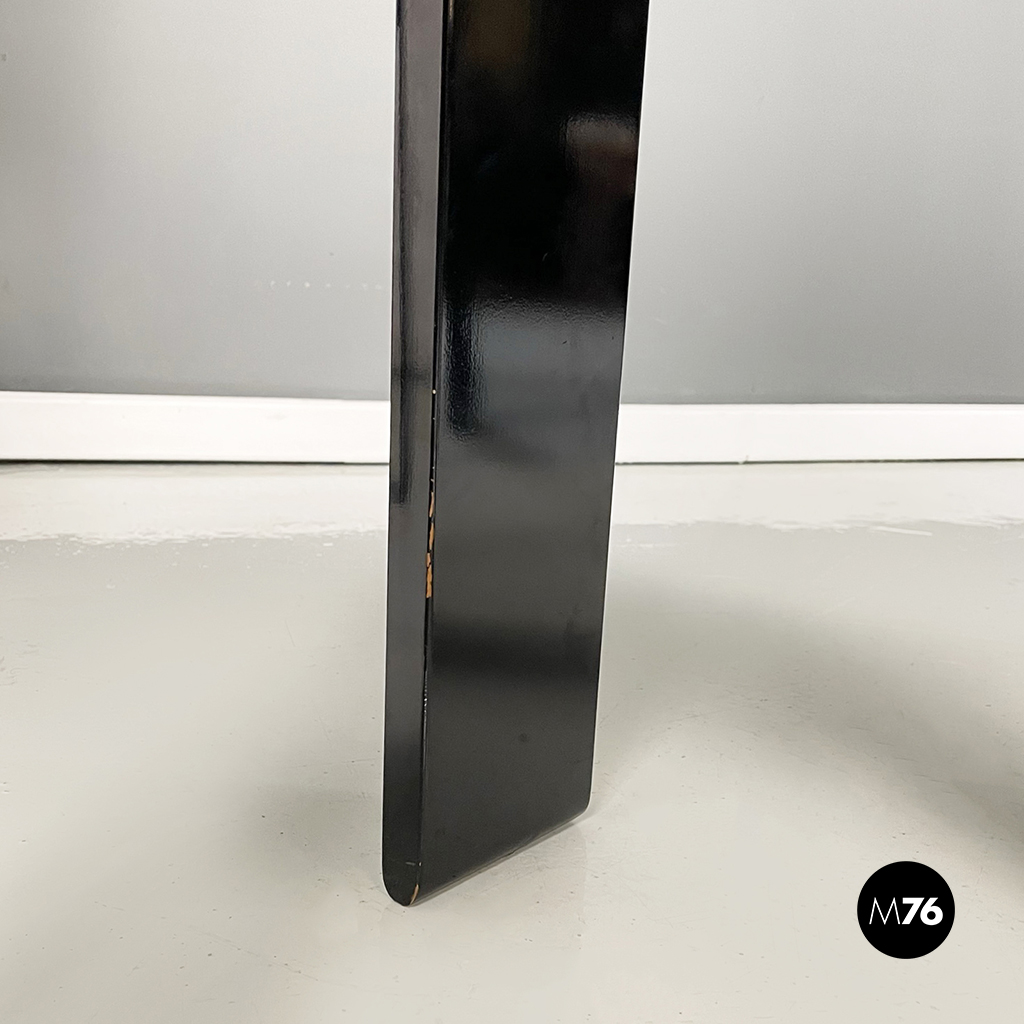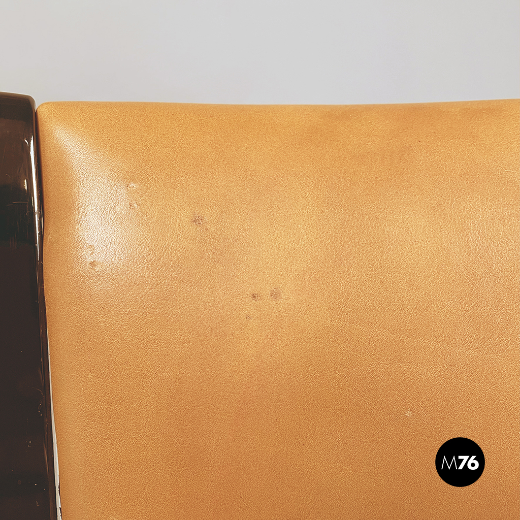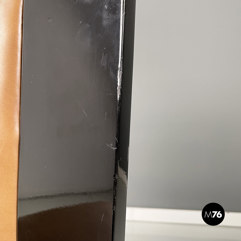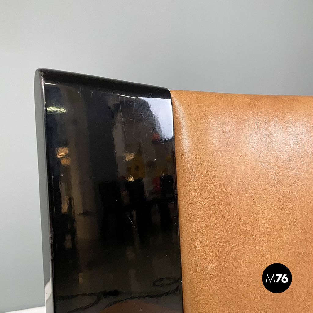 Set di quattro sedie in pelle marrone e legno laccato nero. Lo schienale è composto da due fasce laterali in legno laccato ed una centrale in pelle leggermente imbottita. La seduta è leggermente imbottita e rivestita in pelle marrone. Le zampe a sezione rettangolare sono in legno laccato nero.