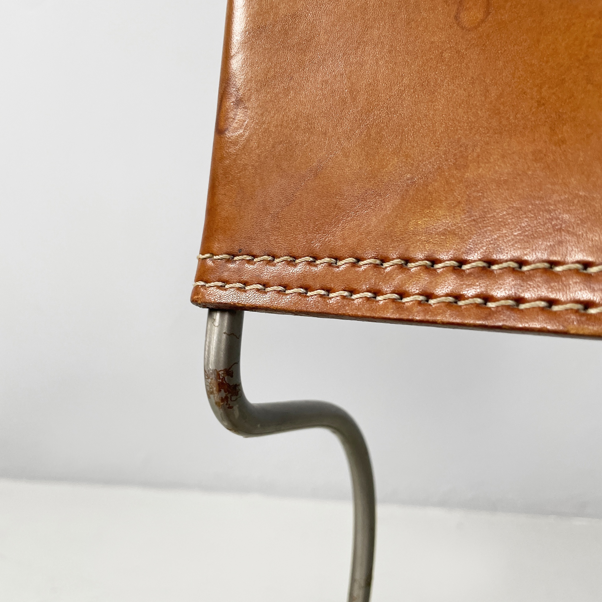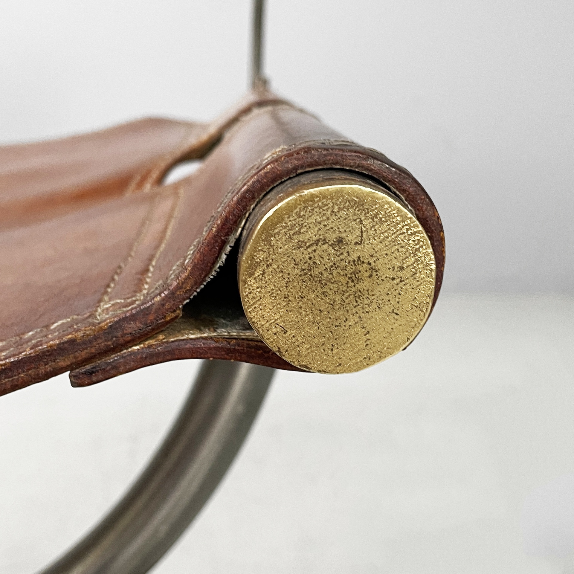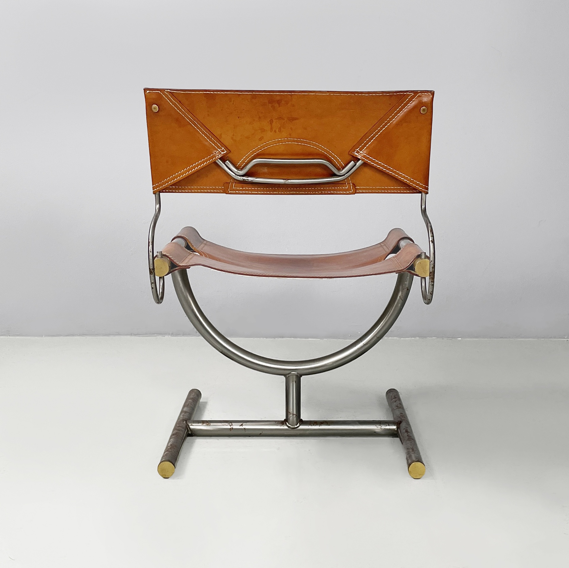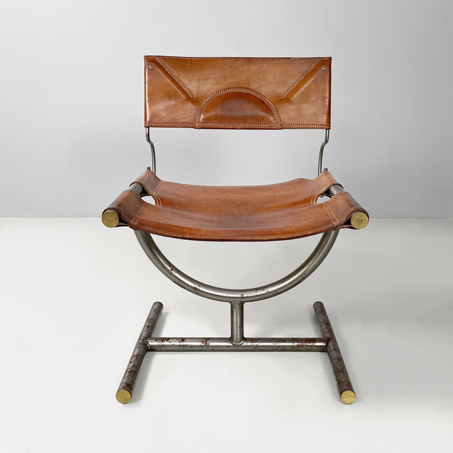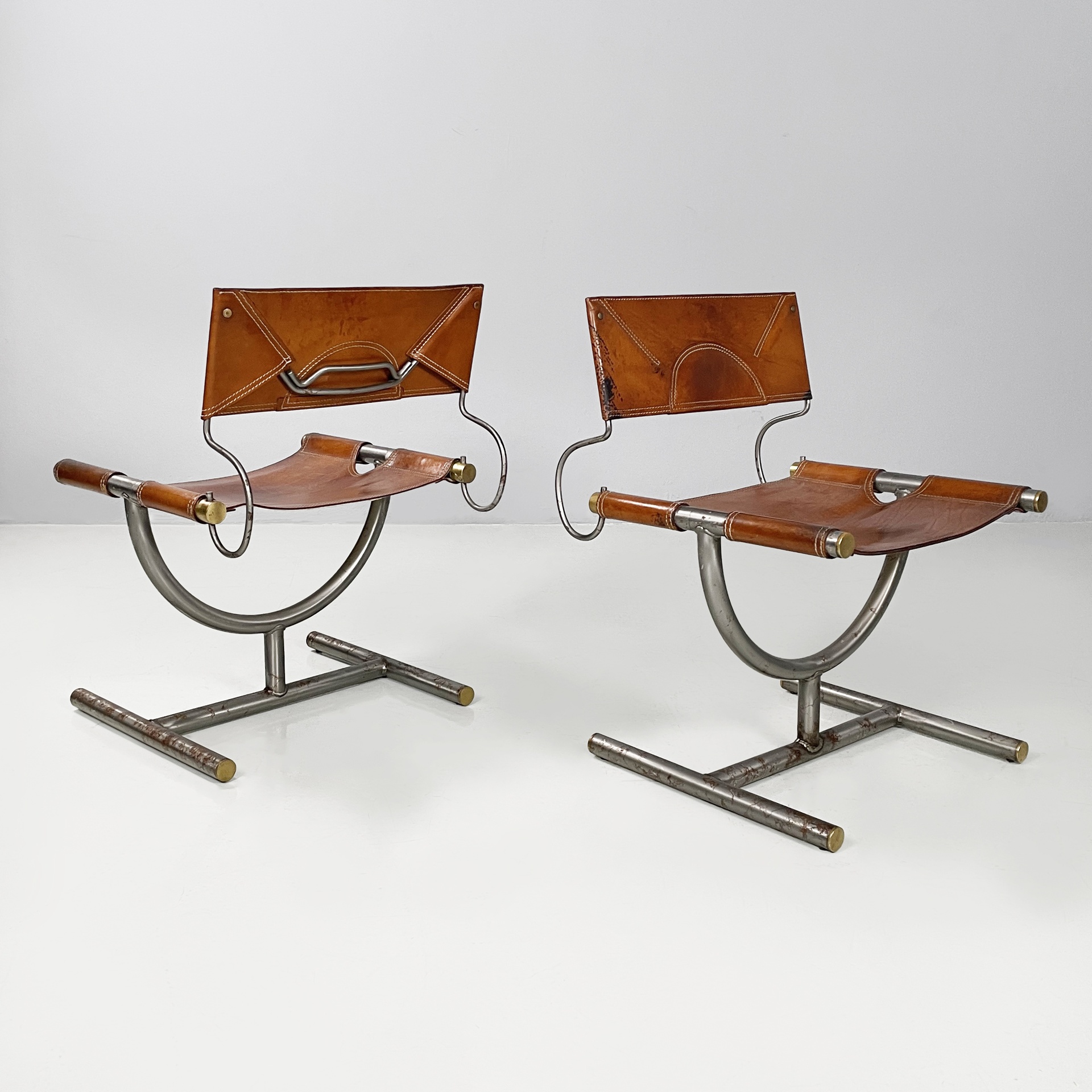 Coppia di sedie con seduta e schienale rettangolari in pelle marrone cognac. La struttura che collega seduta e schienale è in tondino d’acciaio curvato. La seduta è sostenuta da un tubolare a mezzaluna con terminali in ottone. La base è anche essa in tubolare di acciaio con piedini in ottone.