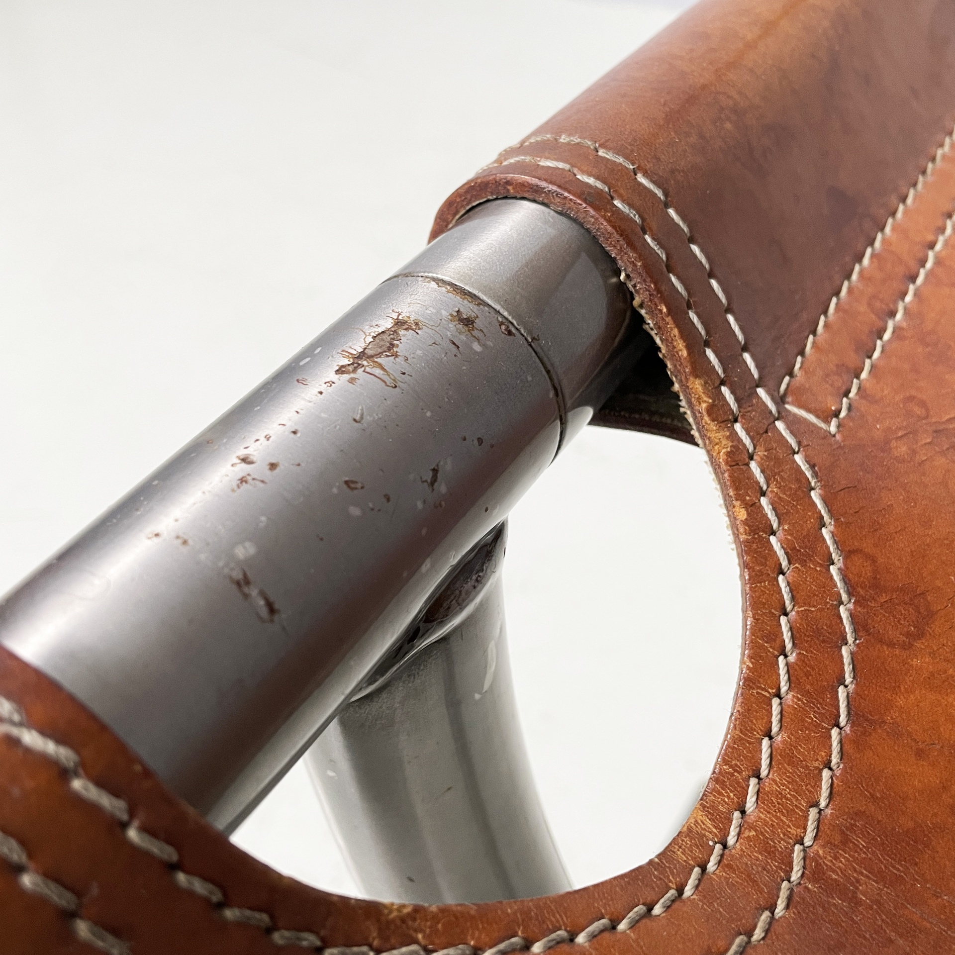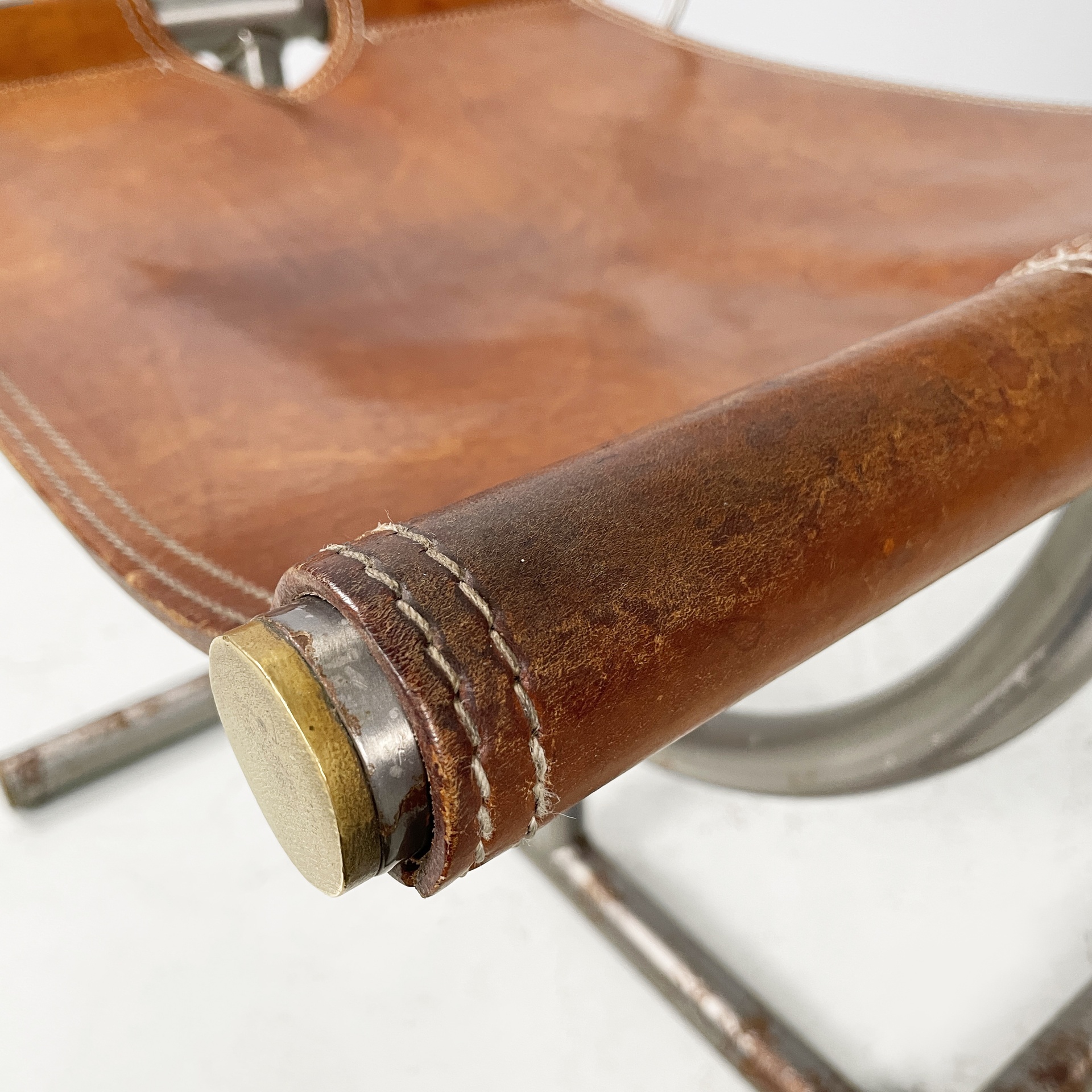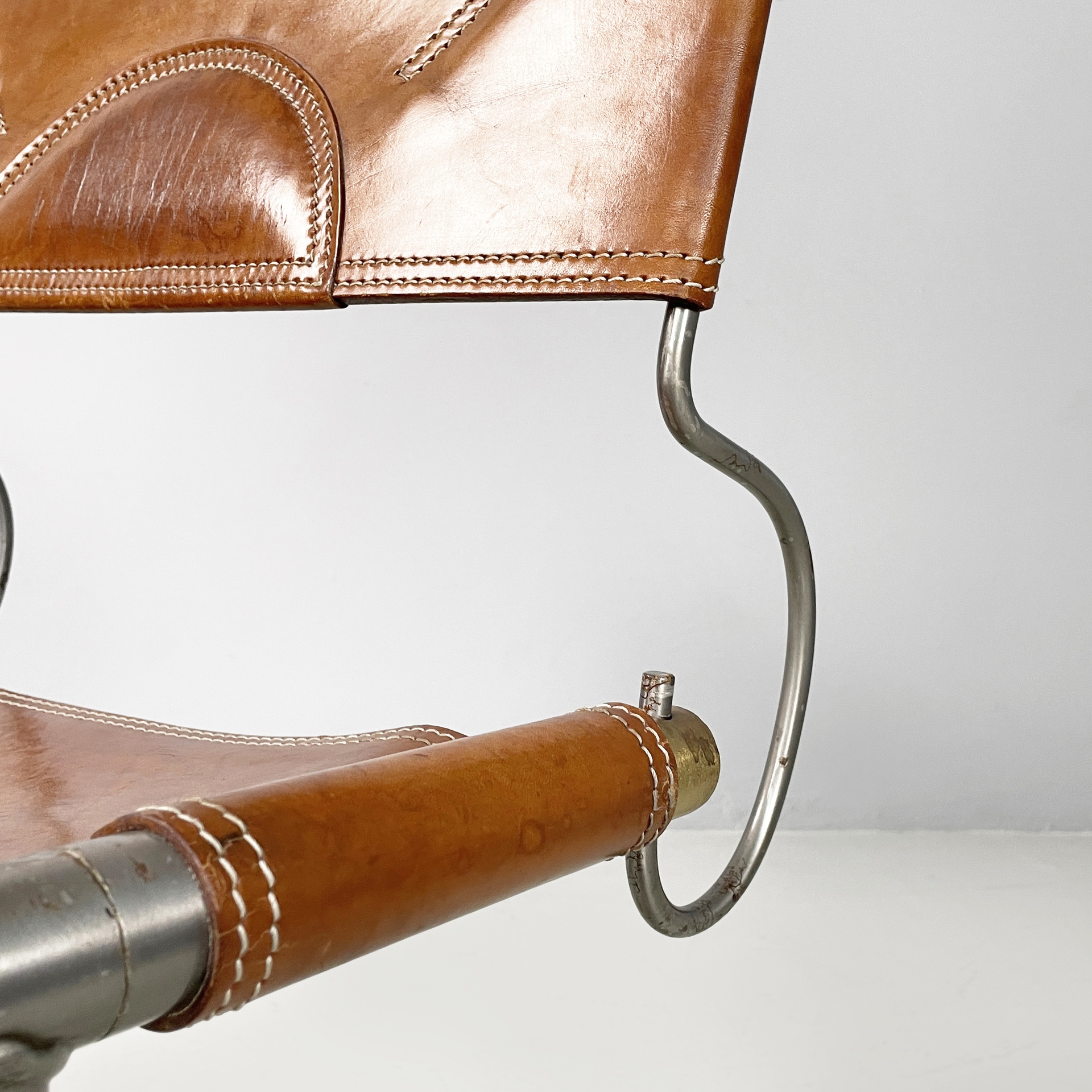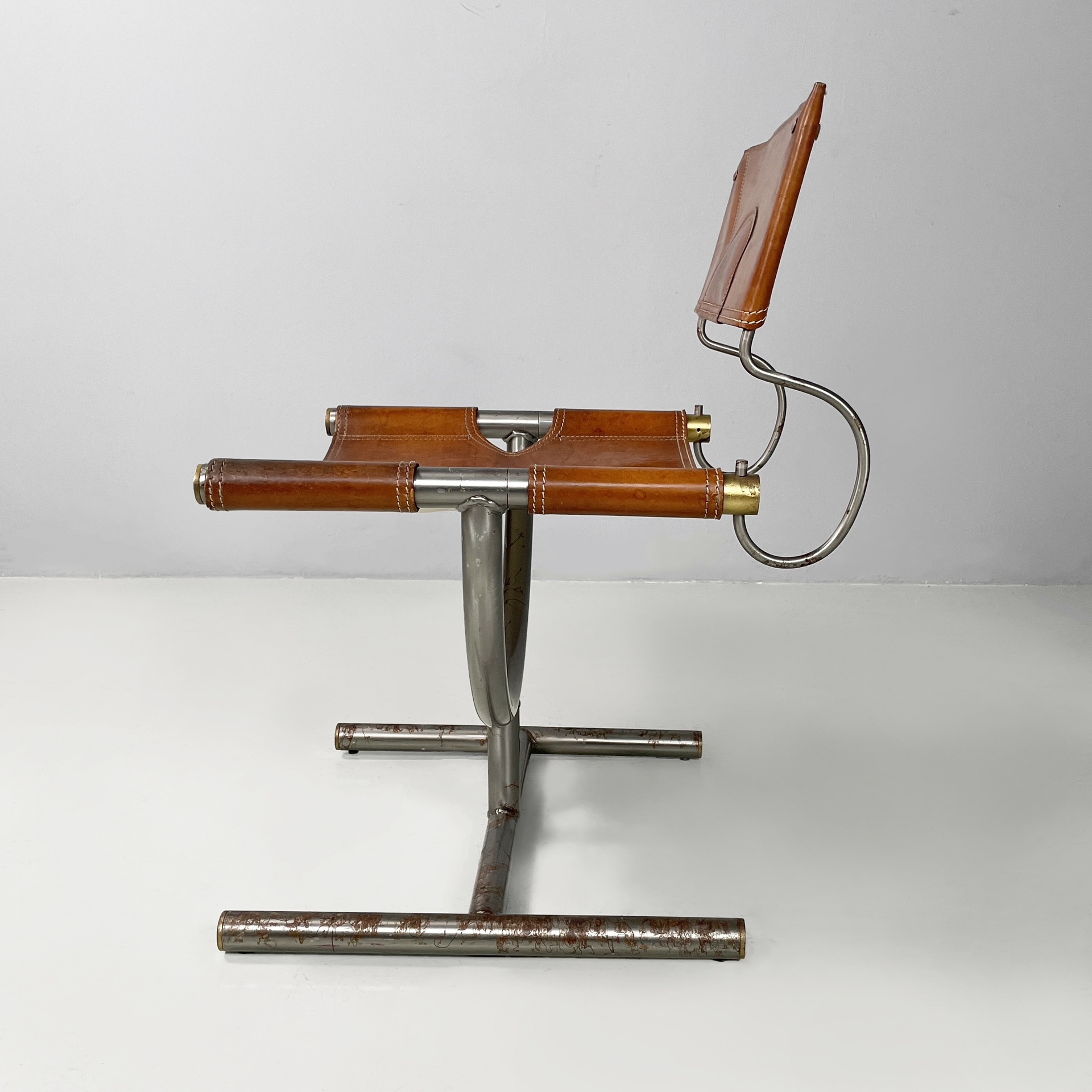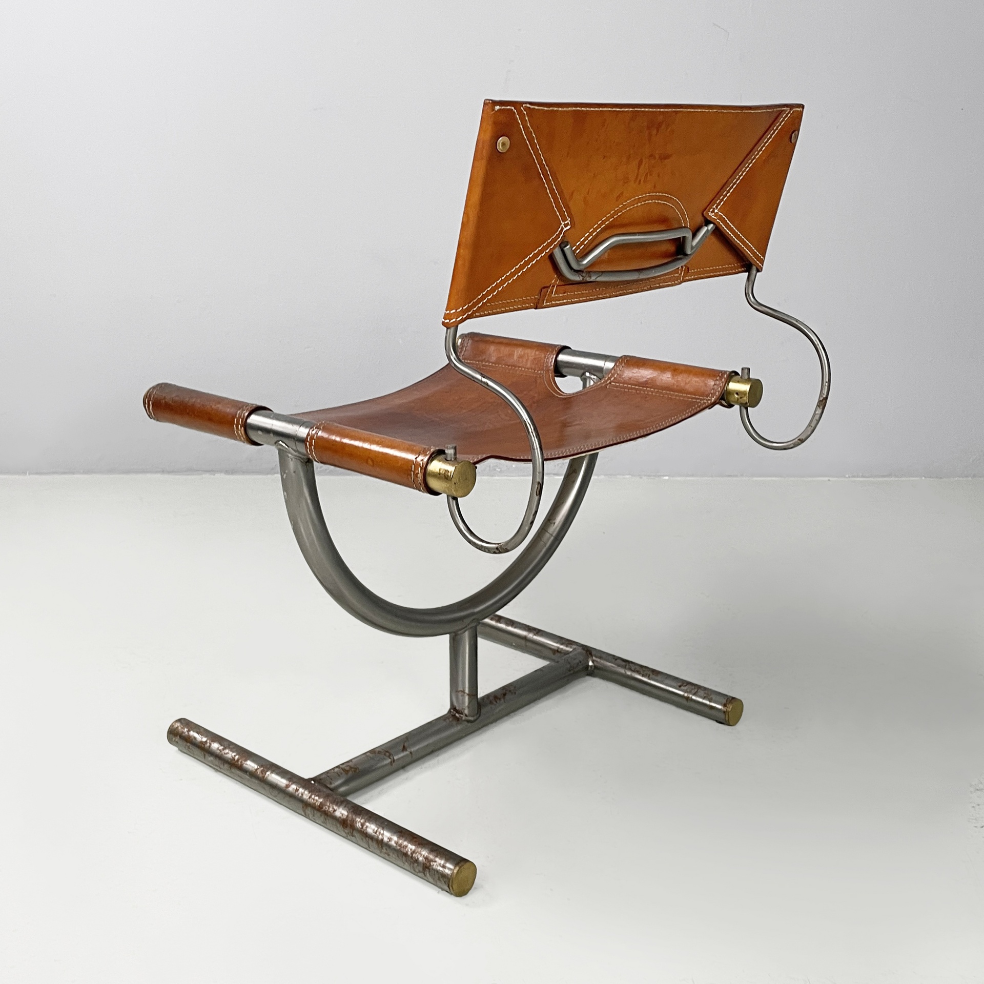 Coppia di sedie con seduta e schienale rettangolari in pelle marrone cognac. La struttura che collega seduta e schienale è in tondino d’acciaio curvato. La seduta è sostenuta da un tubolare a mezzaluna con terminali in ottone. La base è anche essa in tubolare di acciaio con piedini in ottone.