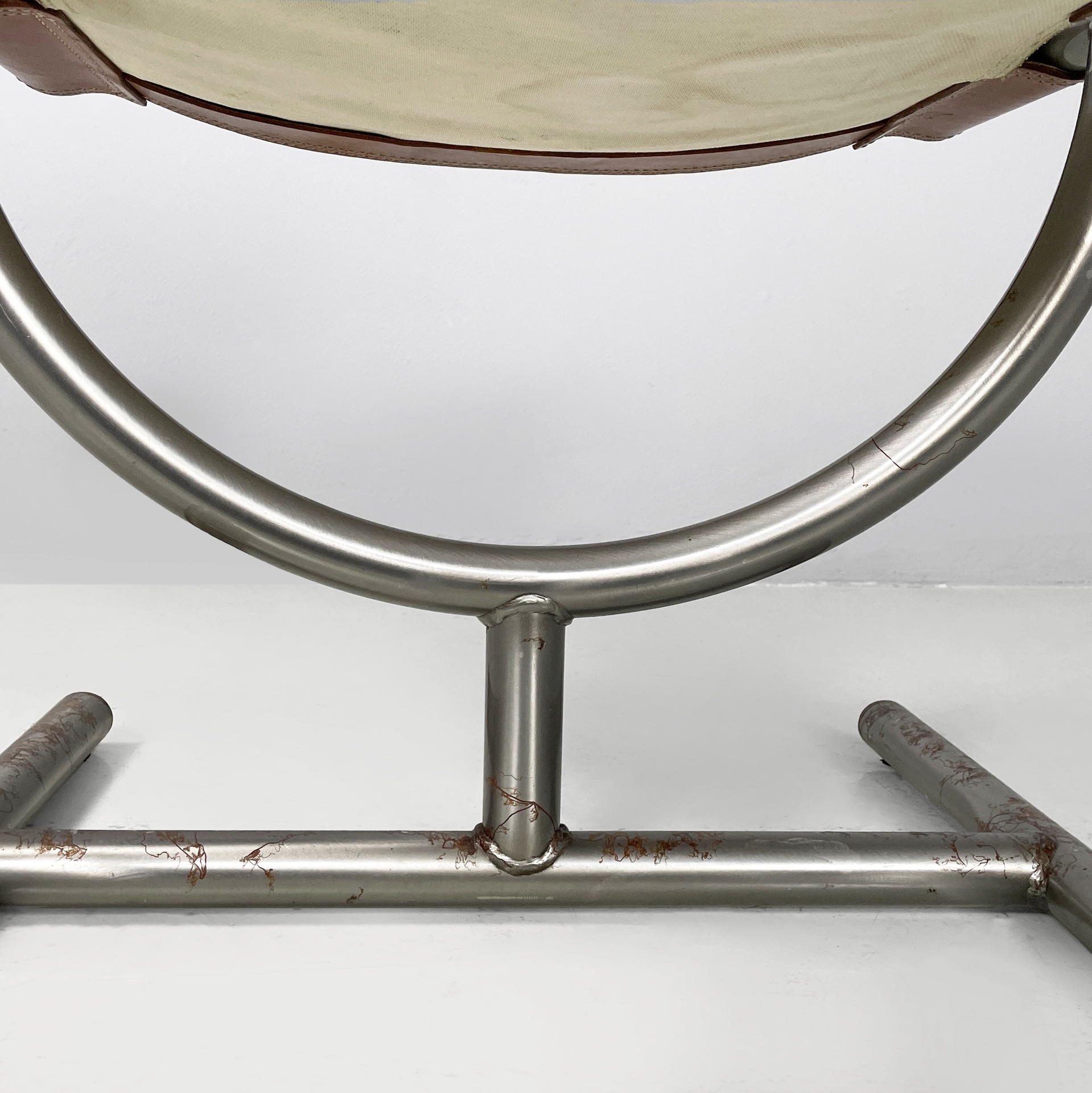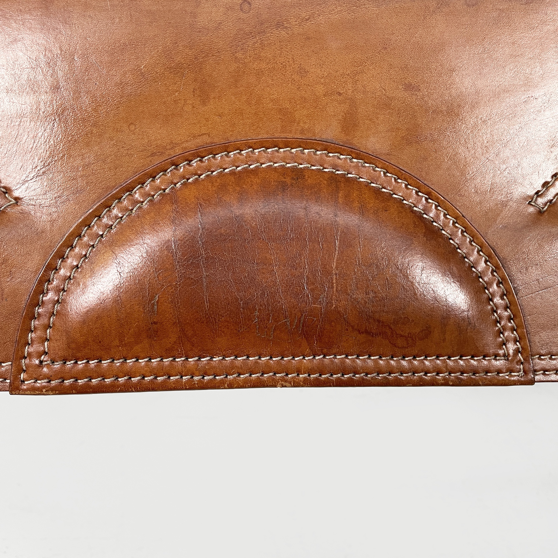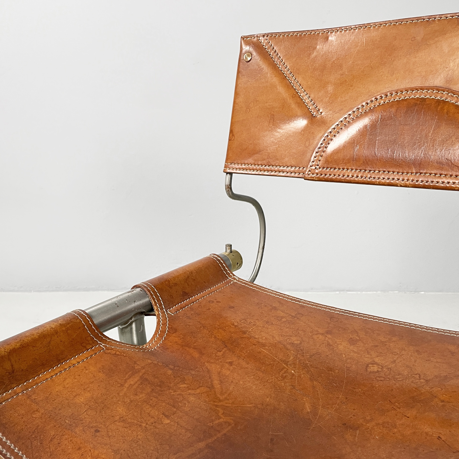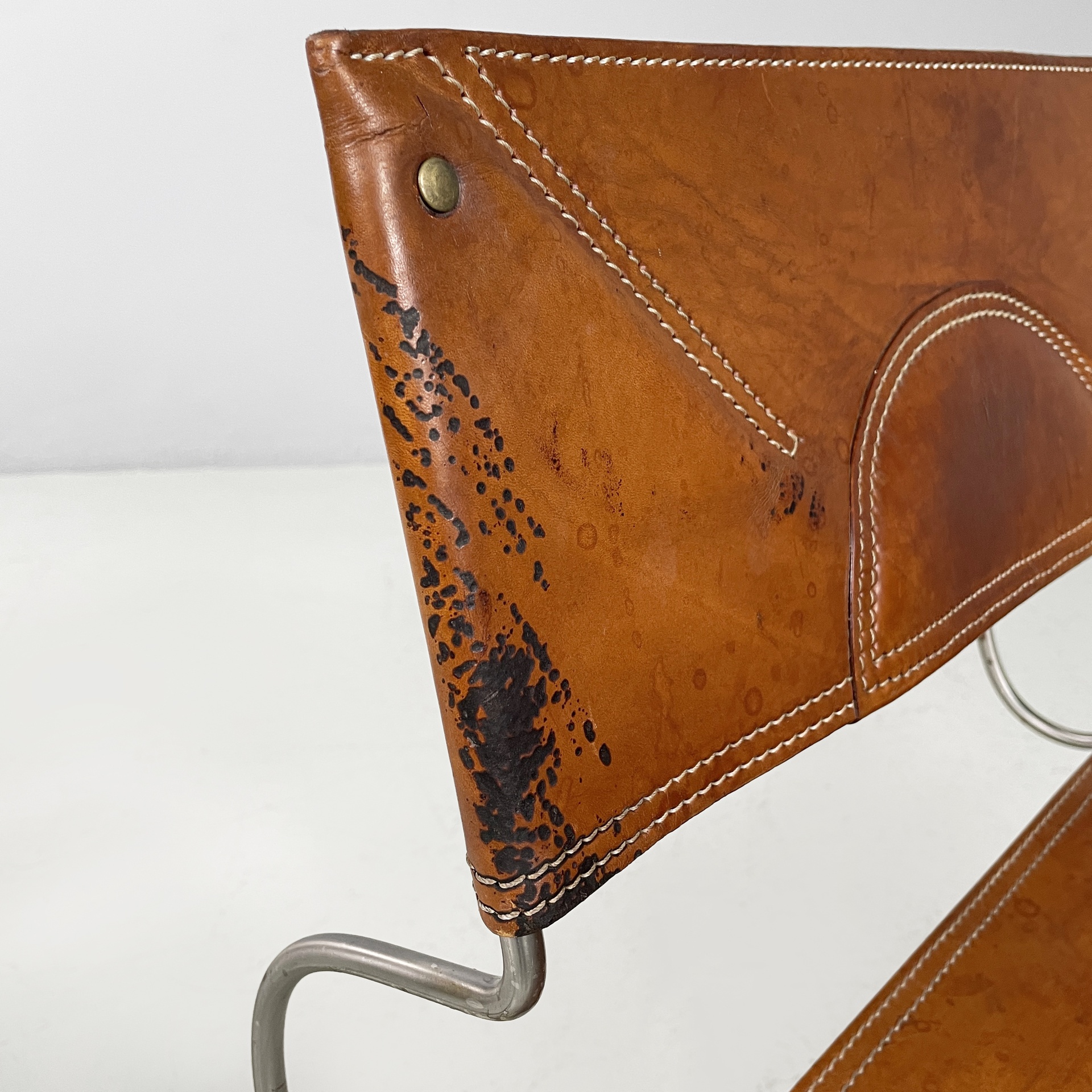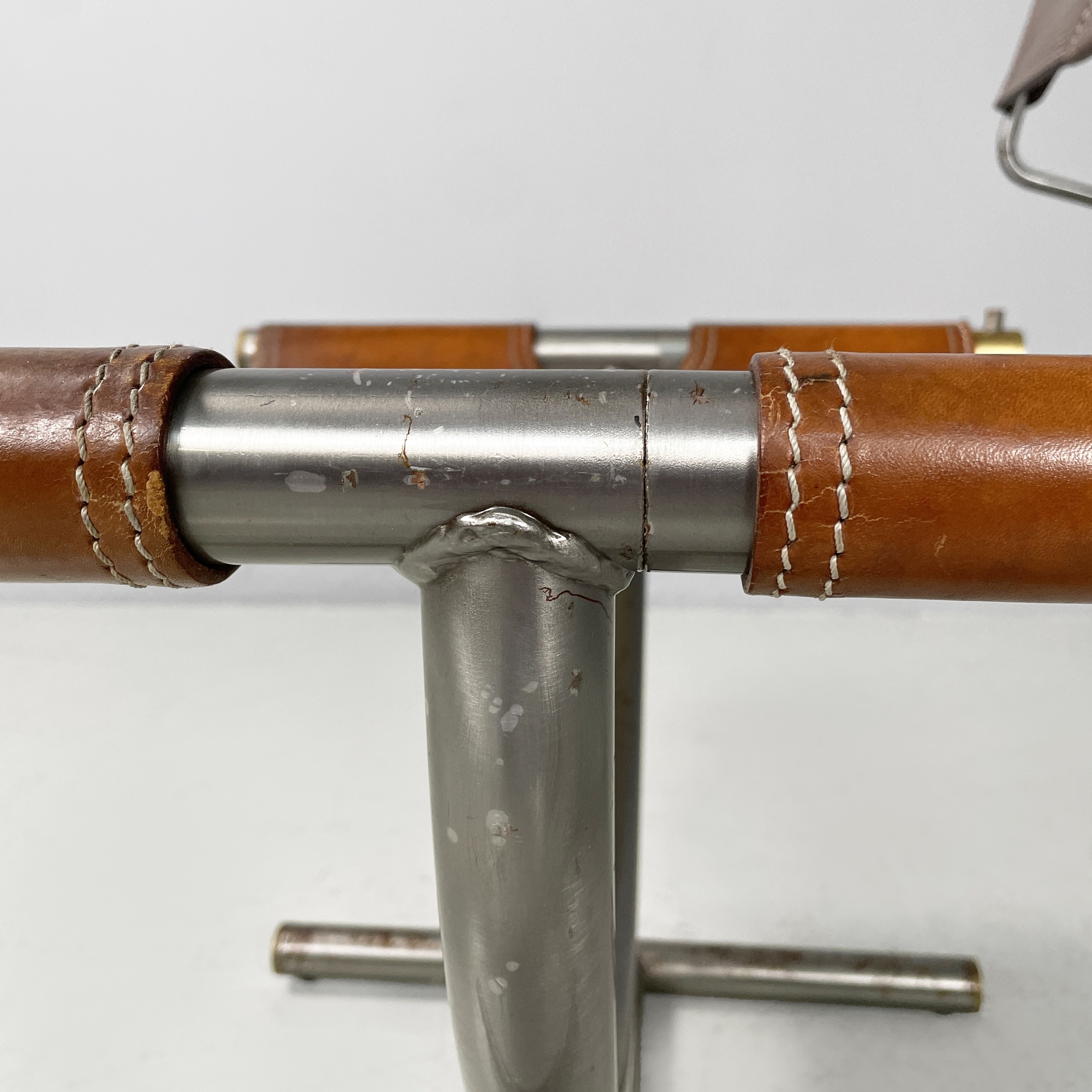 Coppia di sedie con seduta e schienale rettangolari in pelle marrone cognac. La struttura che collega seduta e schienale è in tondino d’acciaio curvato. La seduta è sostenuta da un tubolare a mezzaluna con terminali in ottone. La base è anche essa in tubolare di acciaio con piedini in ottone.