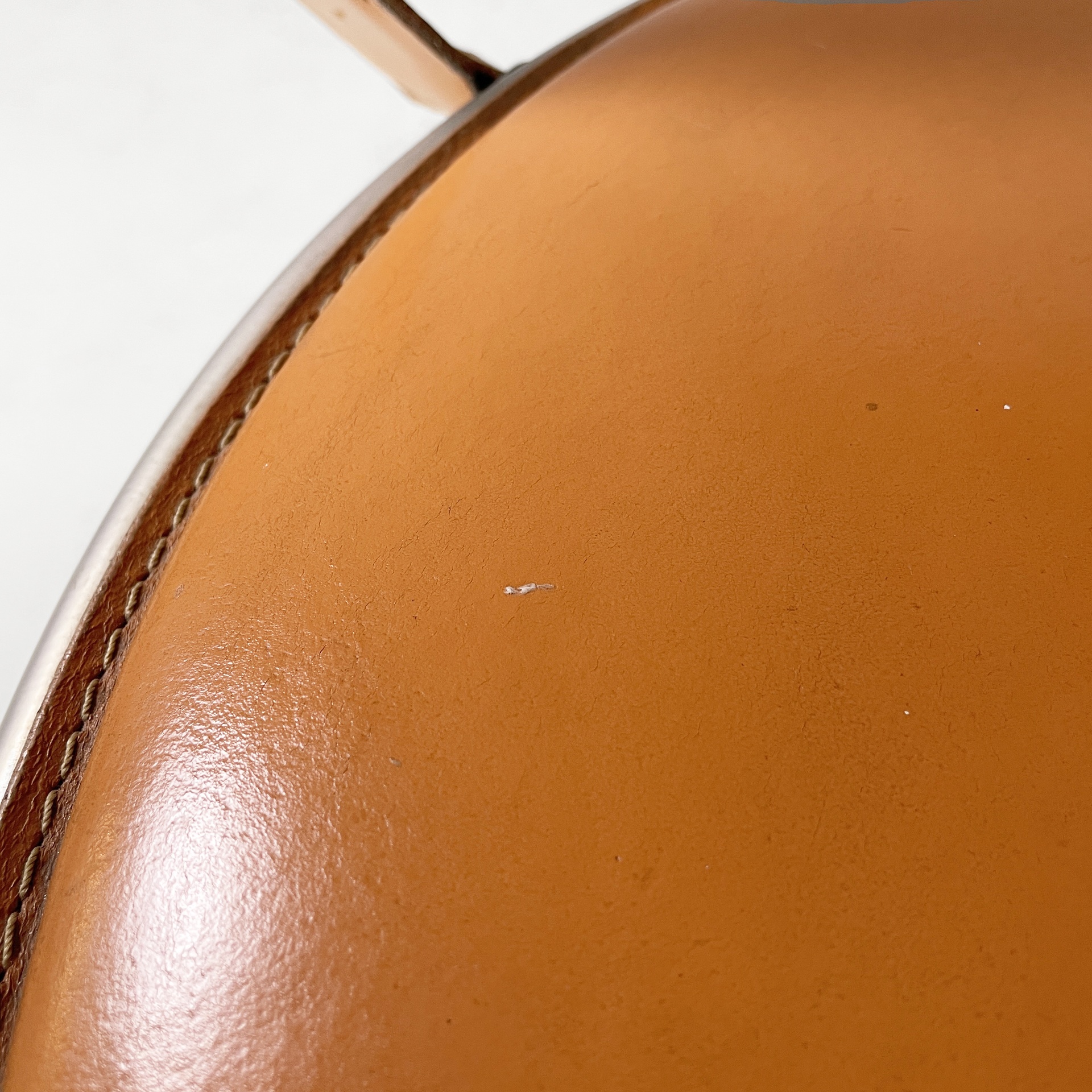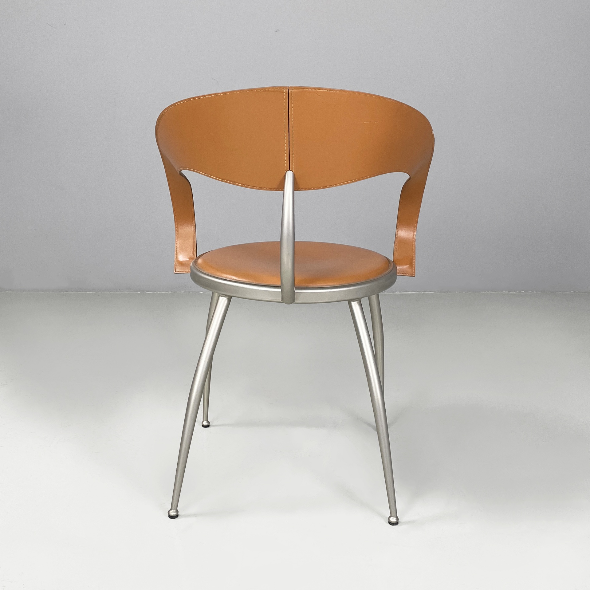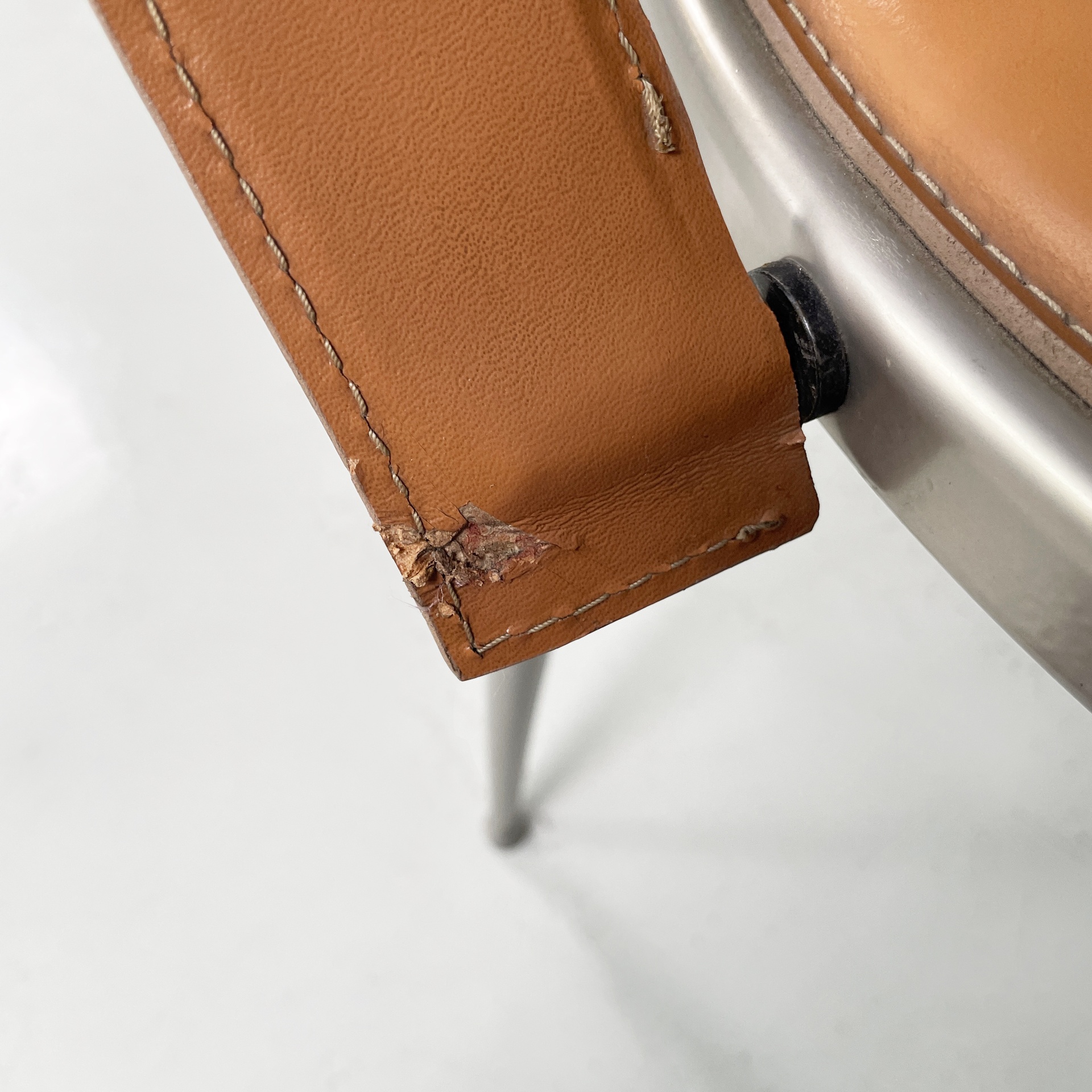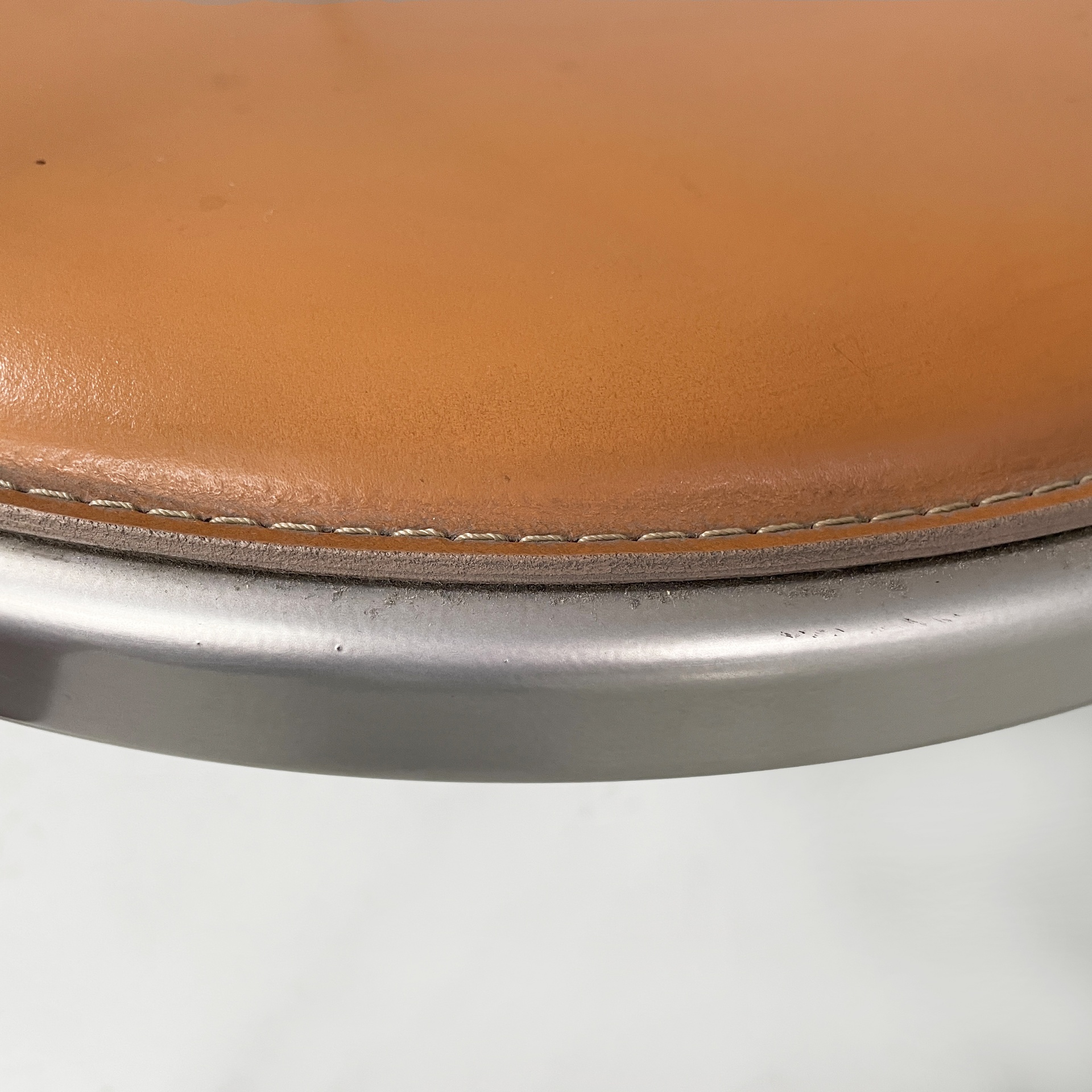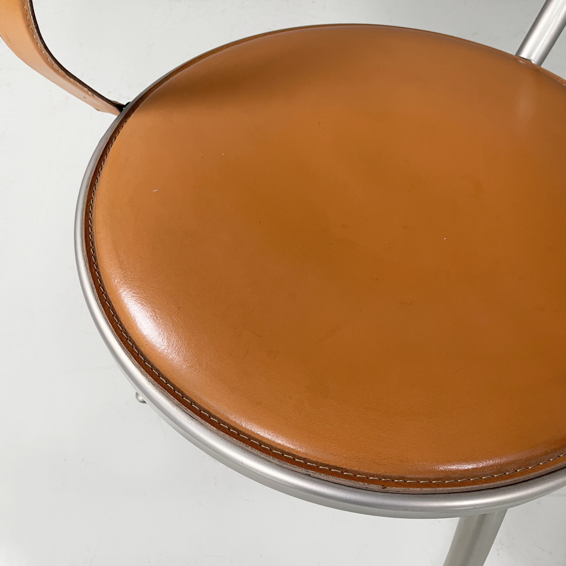 Coppia di sedie con seduta tonda in pelle marrone chiaro. Lo schienale curvo è in cuoio, mentre la struttura e le zampe è in tondino di metallo con piedini tondi.
