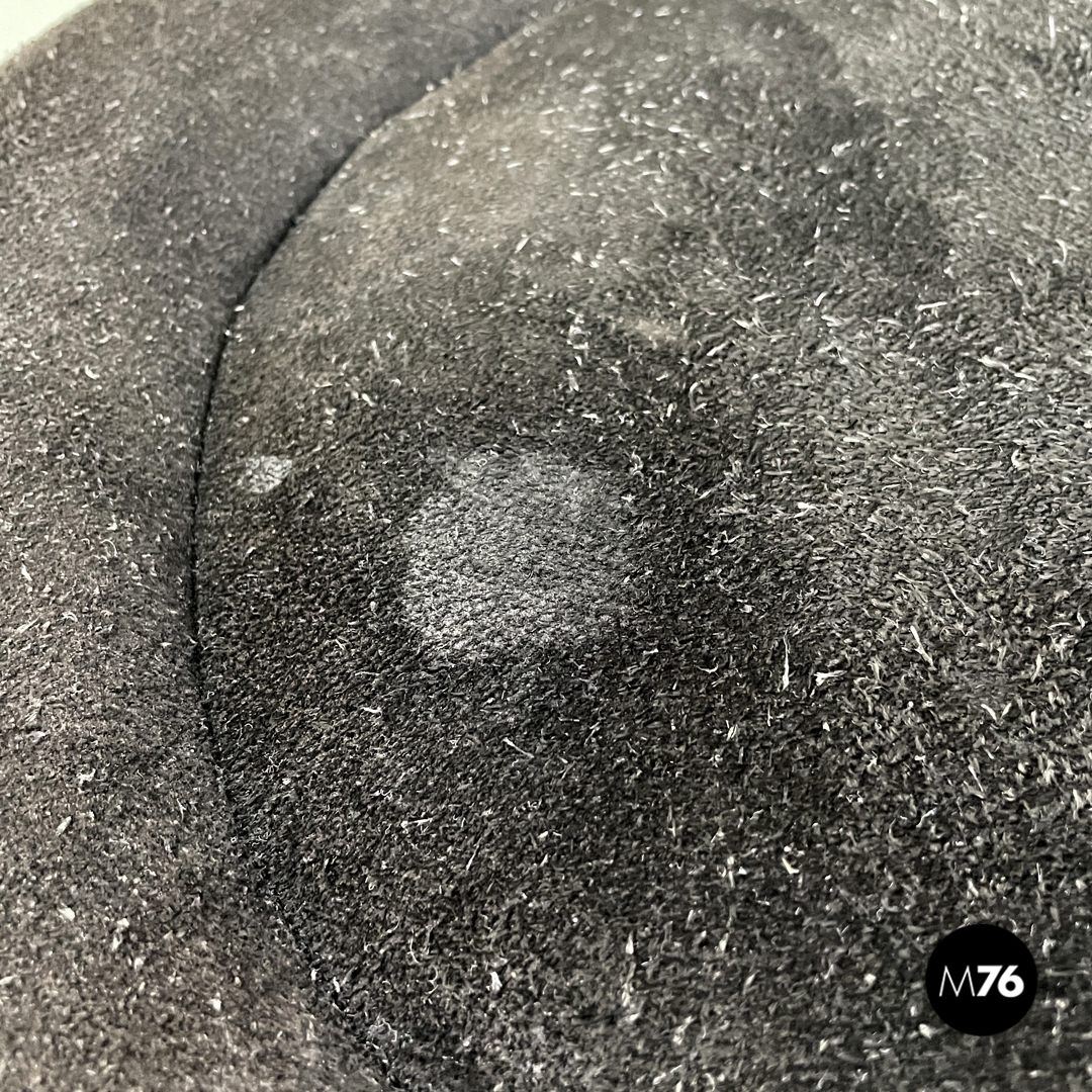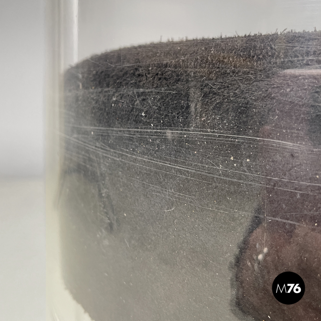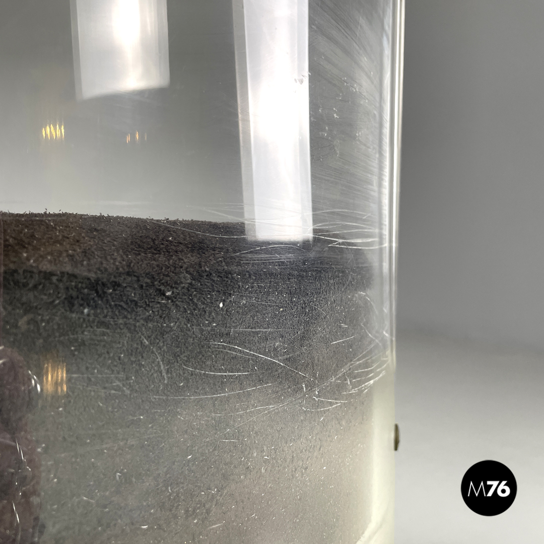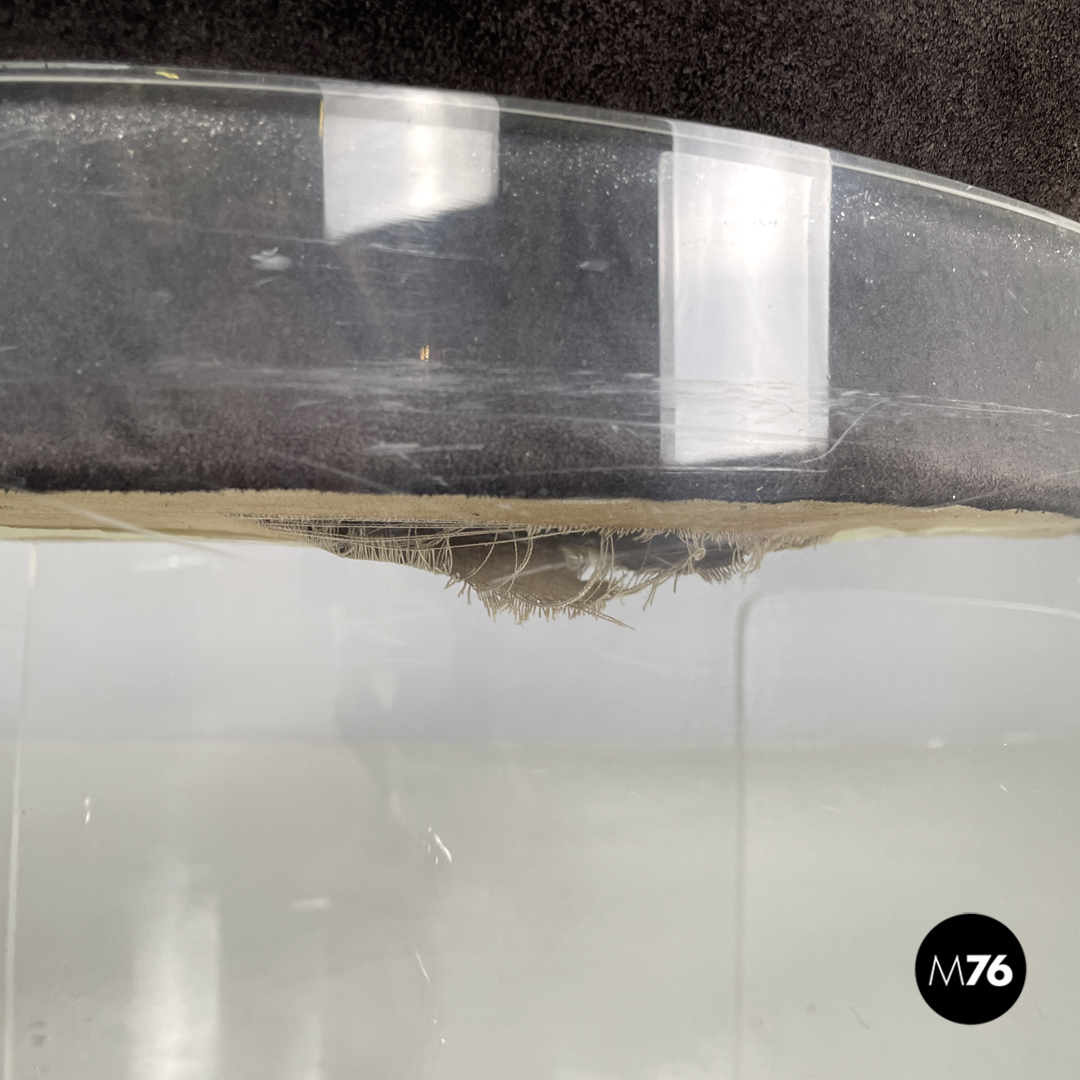 Buone condizioni, con segni dell’uso e del tempo e graffi sul plexiglass e sul camoscio. Presenti ossidazioni e uno strappo nella stoffa sotto una seduta.