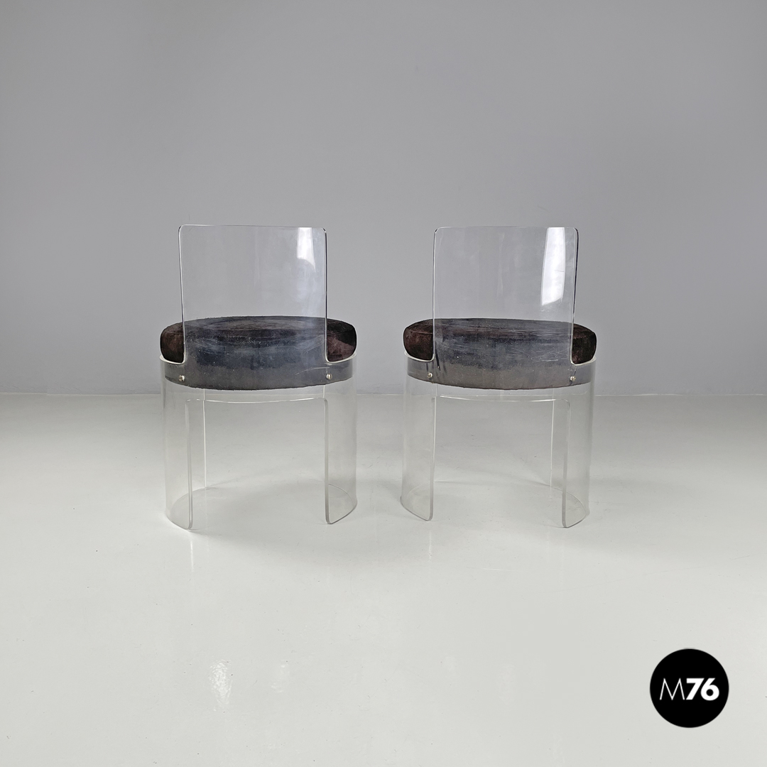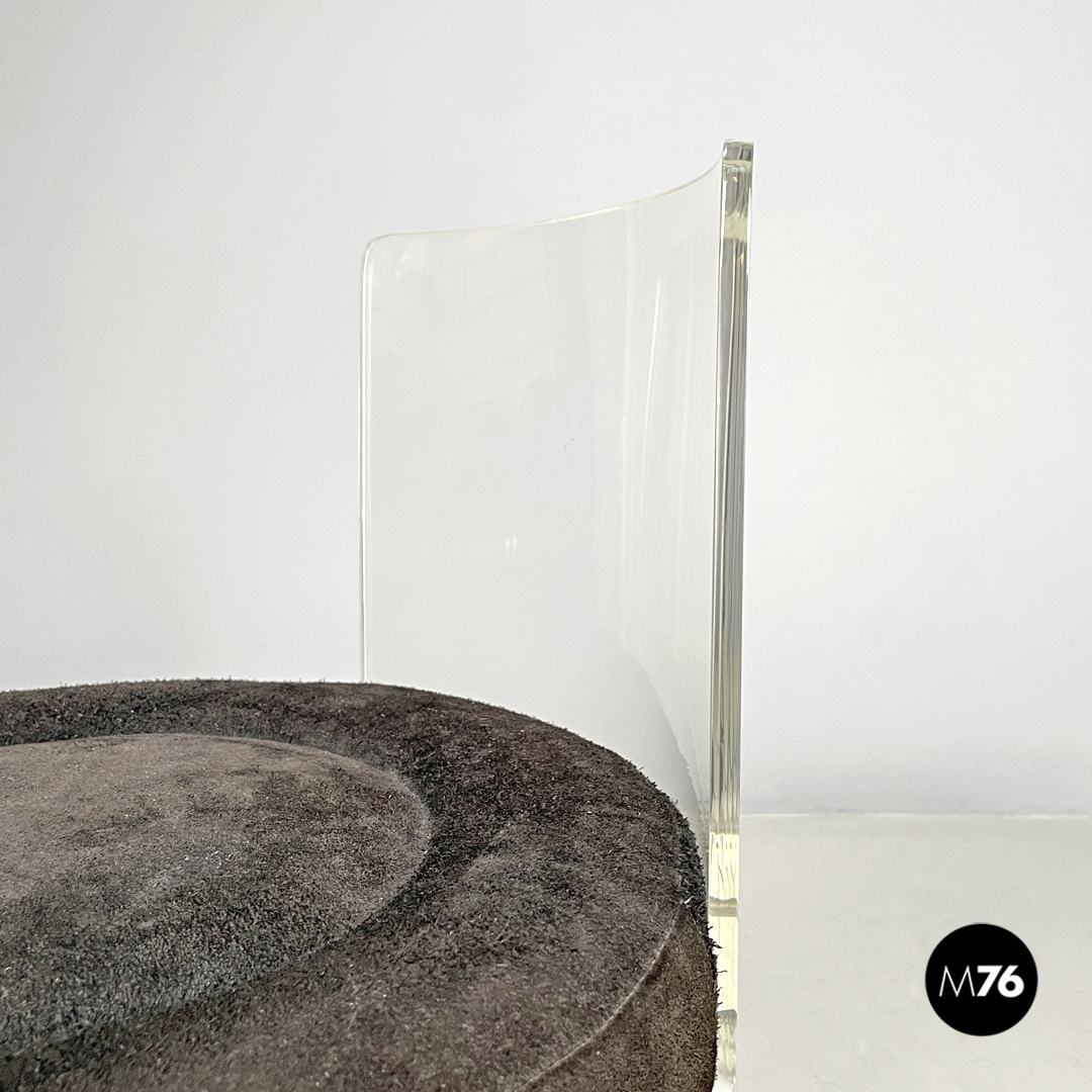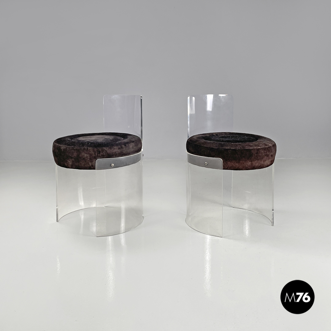 Coppia di sedie a base tonda. La struttura è in plexiglass trasparente, le gambe e lo schienale seguono la forma circolare. La seduta tonda è imbottita e rivestita di camoscio marrone.
