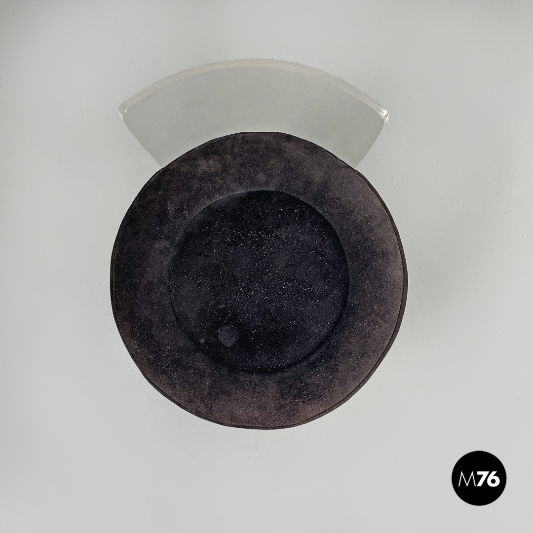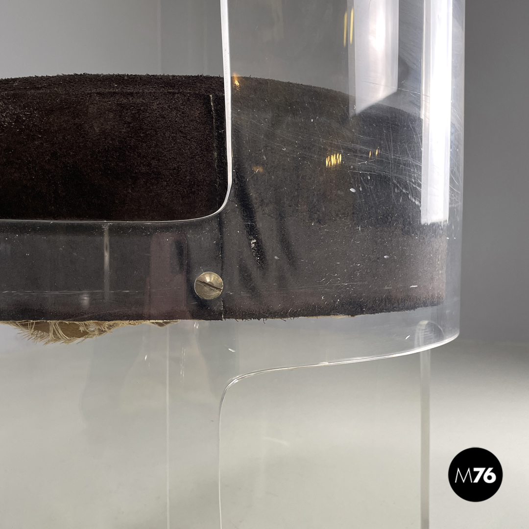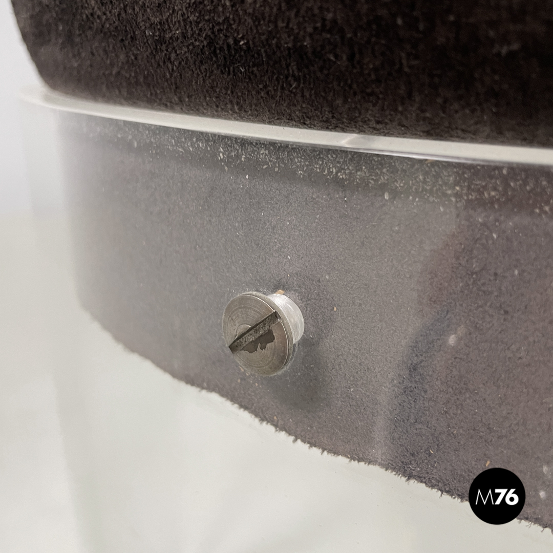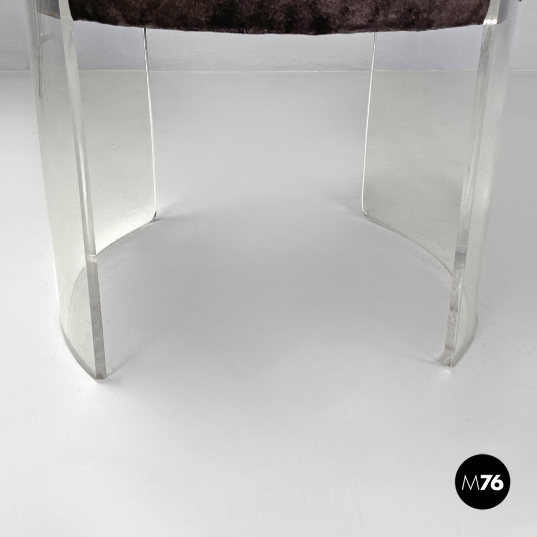 Coppia di sedie a base tonda. La struttura è in plexiglass trasparente, le gambe e lo schienale seguono la forma circolare. La seduta tonda è imbottita e rivestita di camoscio marrone.