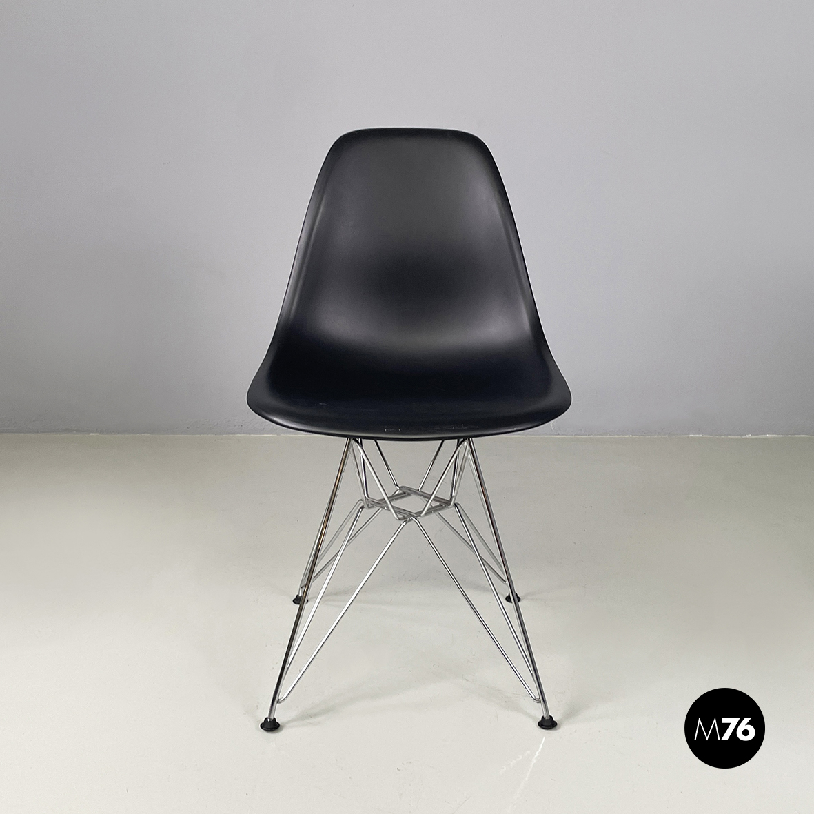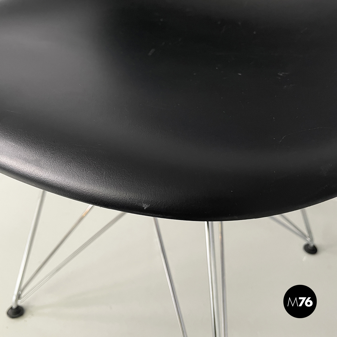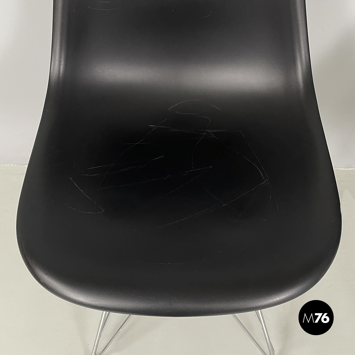 Set di dieci sedie con seduta e schienale in plastica monoscocca curvata nera. Le zampe sono in tondino di metallo cromato con piedini tondi neri.