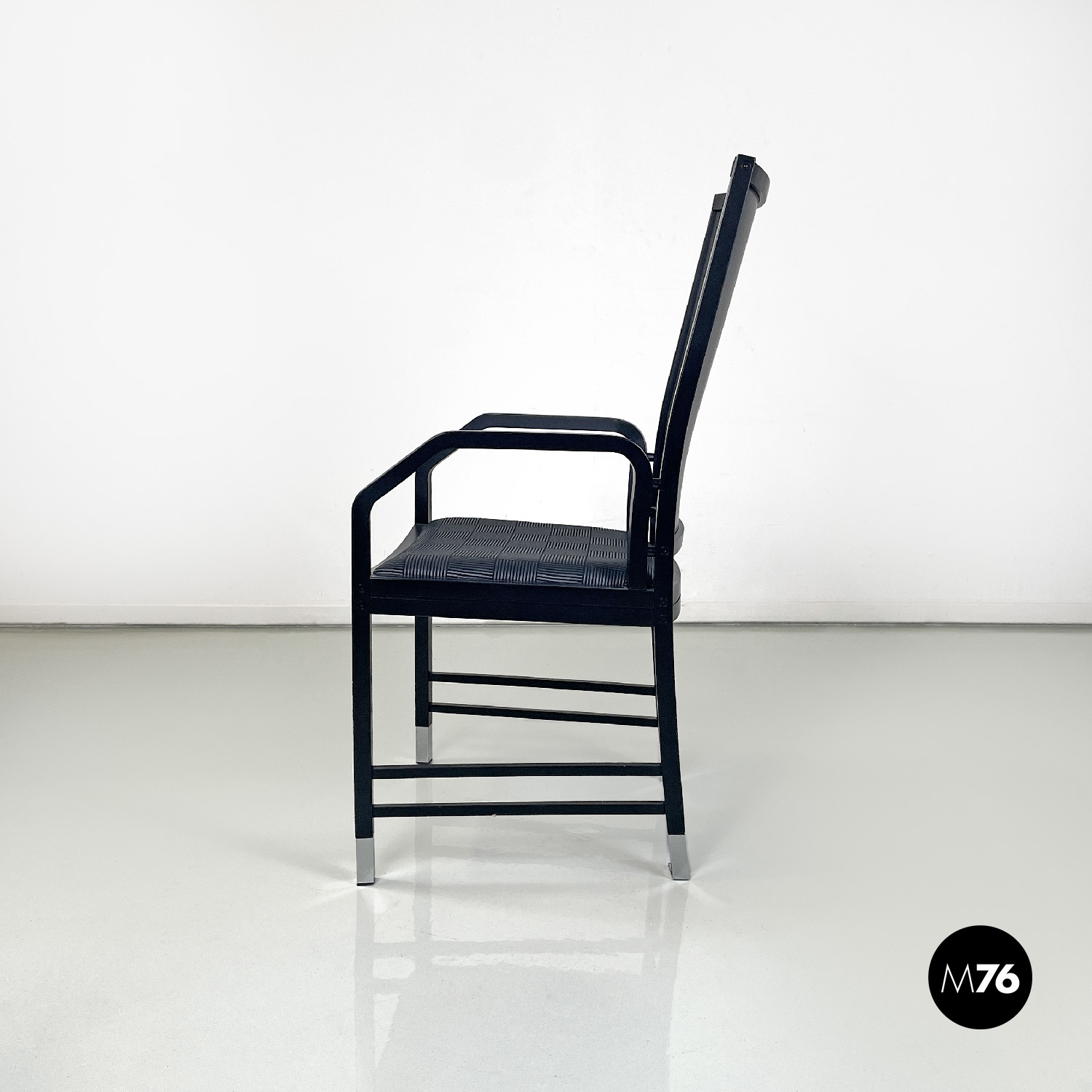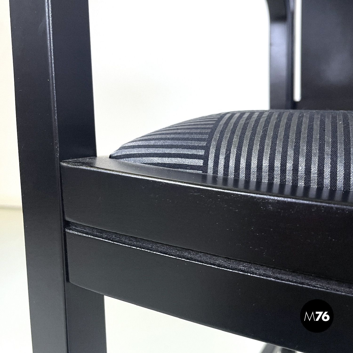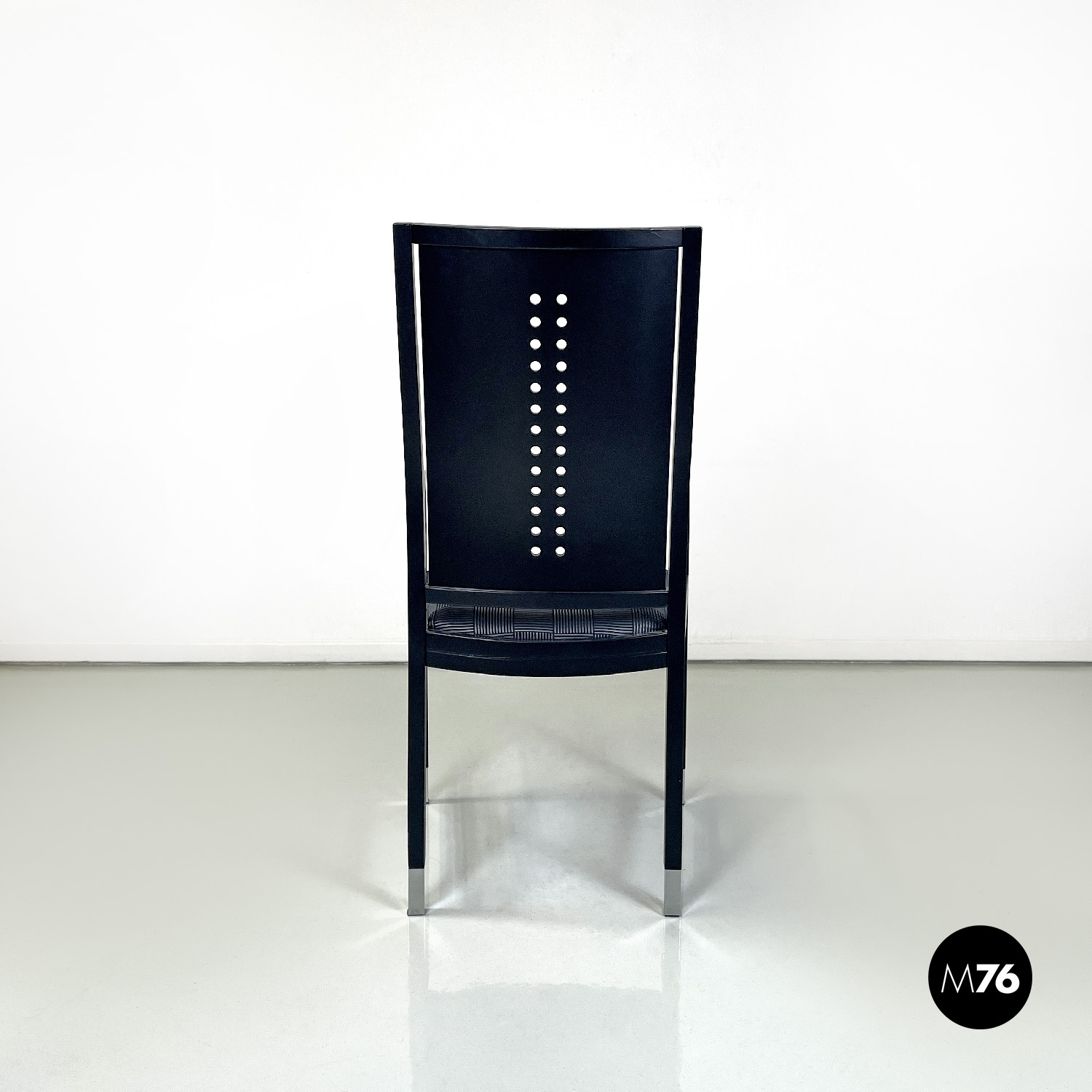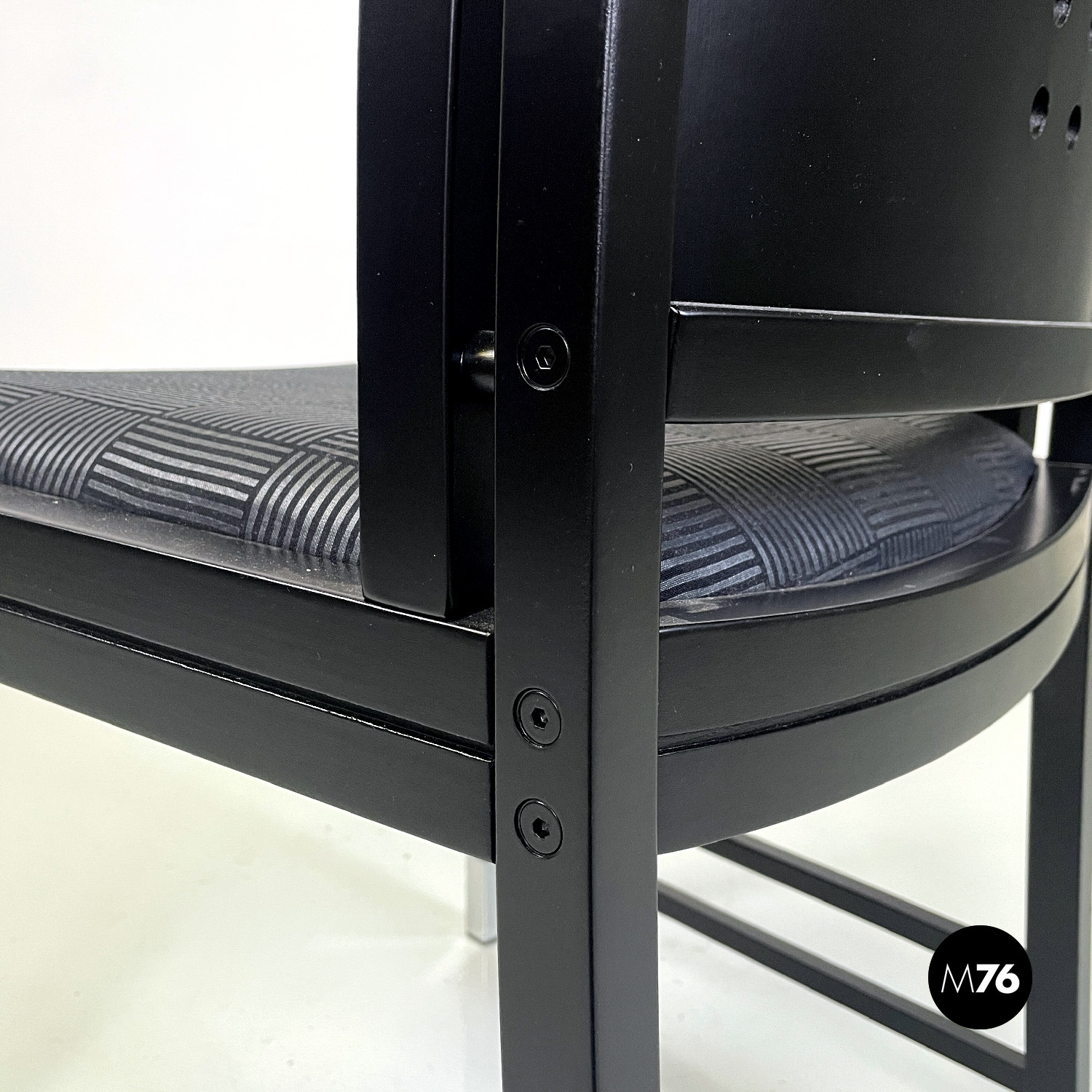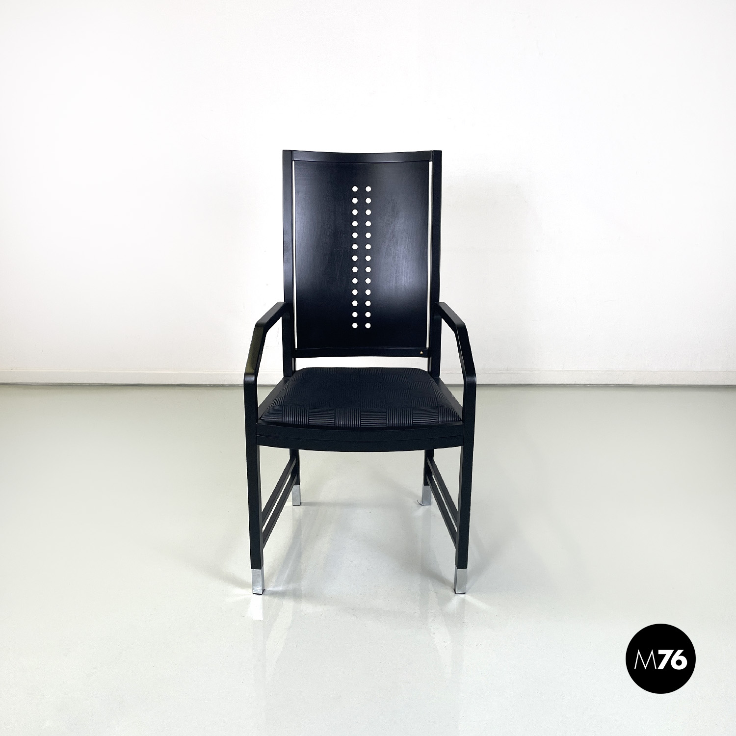 Set di cinque sedie con braccioli in legno laccato nero con finitura opaca. La seduta è imbottita e rivestita di un tessuto nero con decorazioni geometriche argentate, lo schienale è in legno della stessa finitura della struttura e presenta due file di piccoli fori decorativi. Le quattro gambe sono a sezione quadrata e all’appoggio a terra sono rivestite di una fascia in metallo argentato.