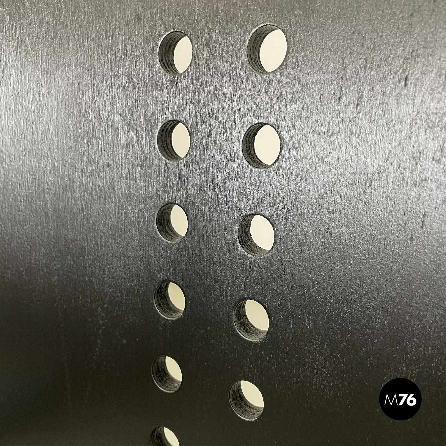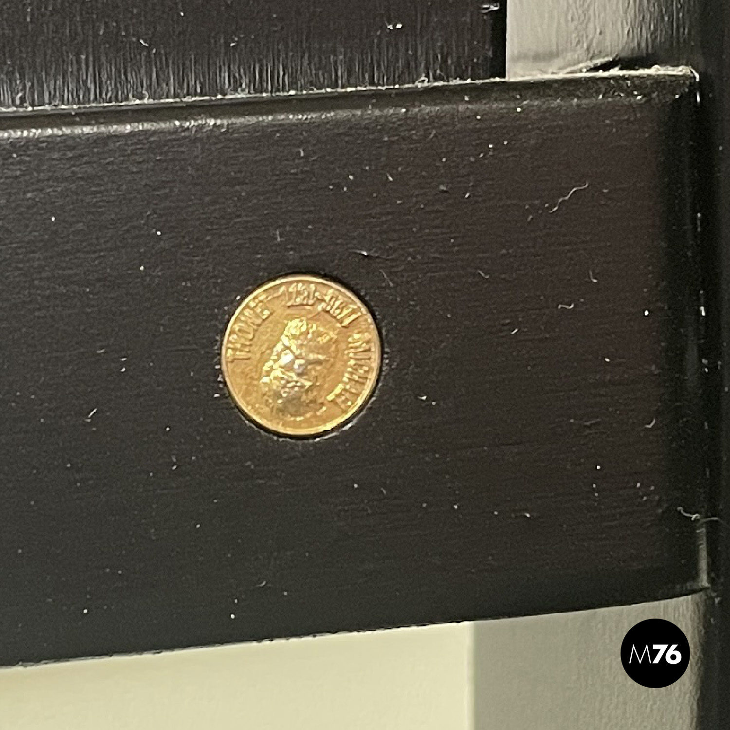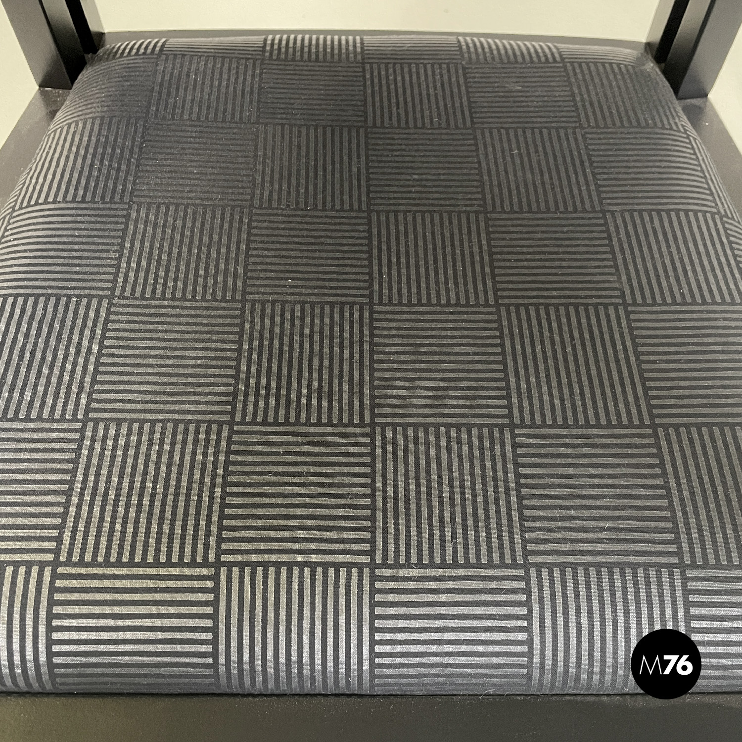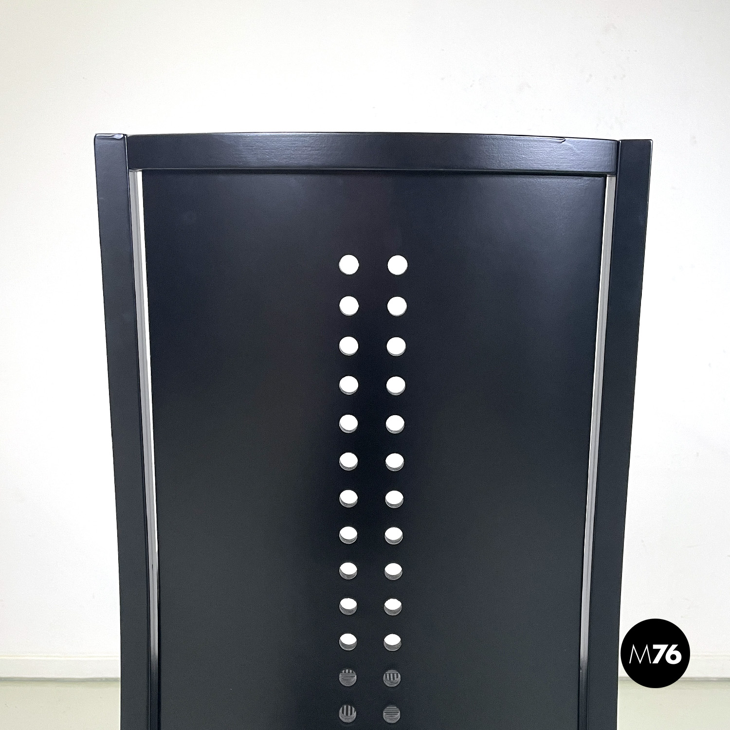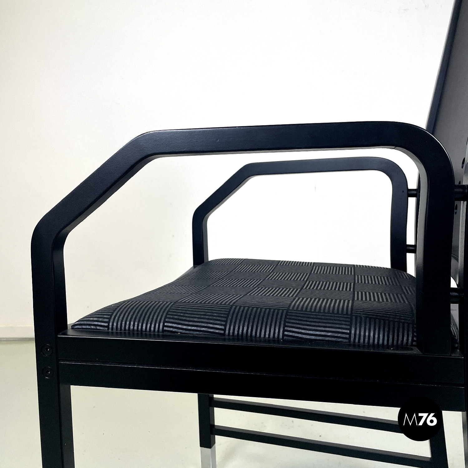 Set di cinque sedie con braccioli in legno laccato nero con finitura opaca. La seduta è imbottita e rivestita di un tessuto nero con decorazioni geometriche argentate, lo schienale è in legno della stessa finitura della struttura e presenta due file di piccoli fori decorativi. Le quattro gambe sono a sezione quadrata e all’appoggio a terra sono rivestite di una fascia in metallo argentato.
