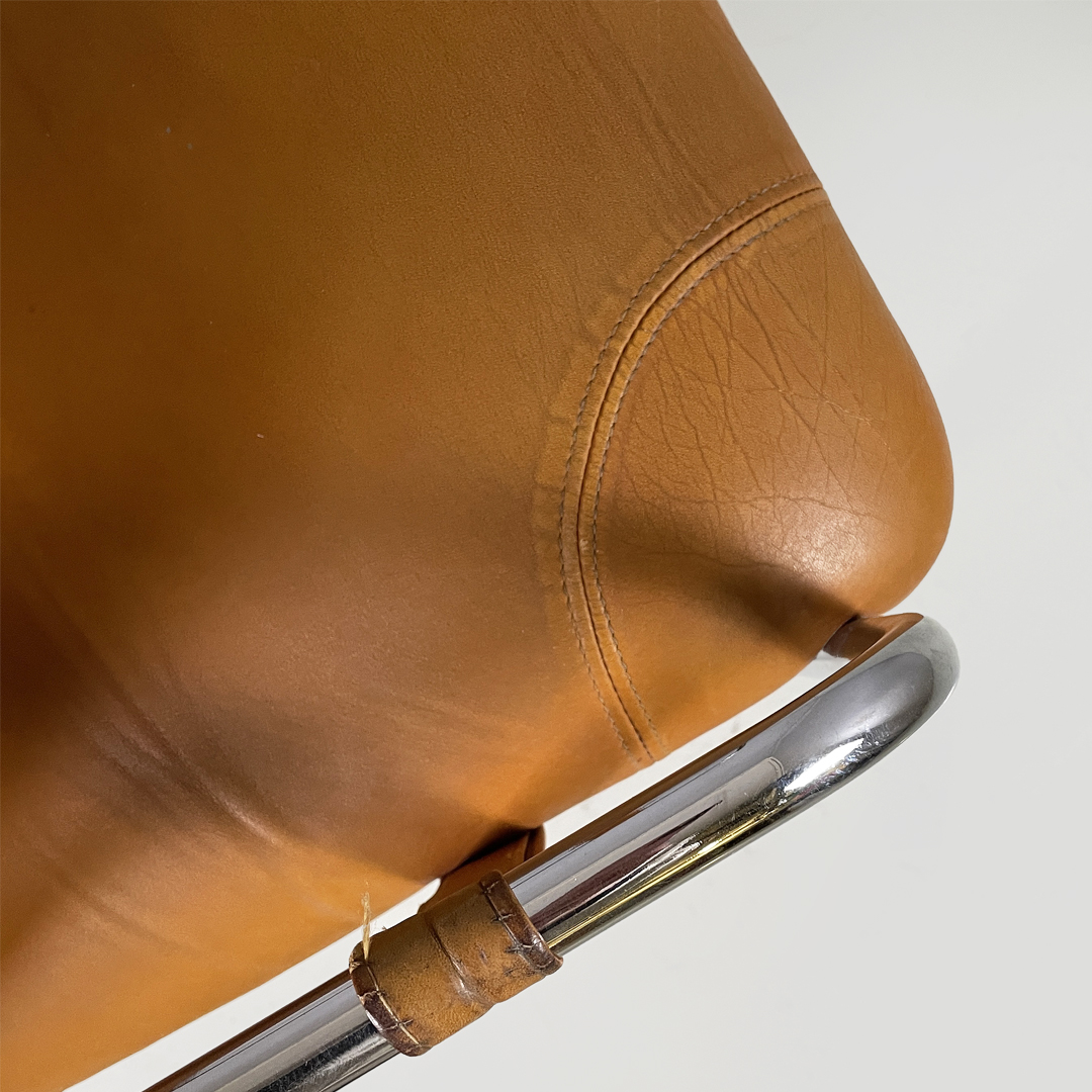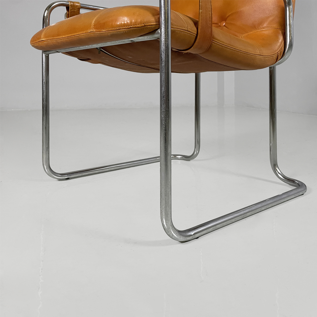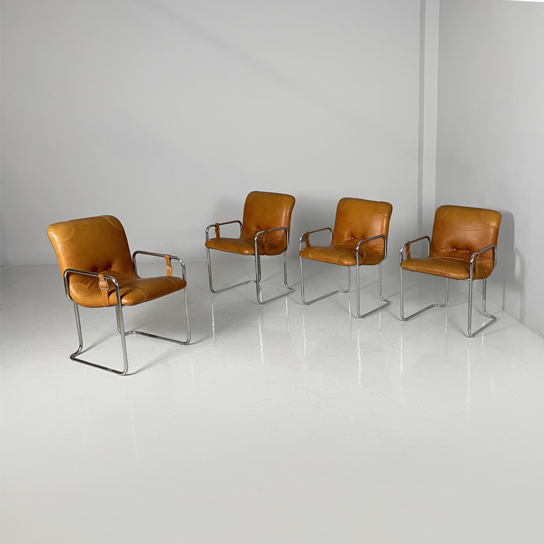Set di quattro sedie con seduta e schienale squadrati, imbottiti e rivestiti in pelle marrone. Sullo schienale sono presenti due bottoni rivestiti in pelle marrone. La struttura, i braccioli e le zampe sono composte da un unico tubolare di metallo cromato. La seduta è collegata al bracciolo grazie a delle cinghie in cuoio con fibbia metallica. Utilizzabili come piccole poltrone.