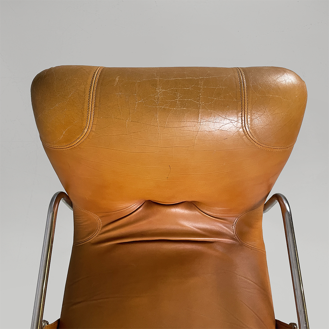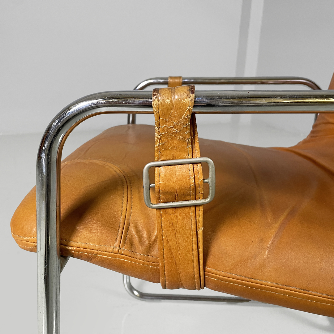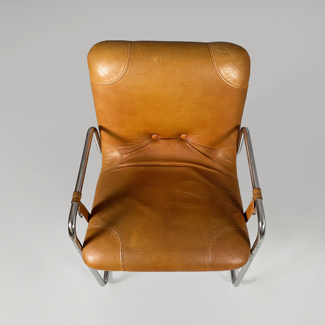 Set di quattro sedie con seduta e schienale squadrati, imbottiti e rivestiti in pelle marrone. Sullo schienale sono presenti due bottoni rivestiti in pelle marrone. La struttura, i braccioli e le zampe sono composte da un unico tubolare di metallo cromato. La seduta è collegata al bracciolo grazie a delle cinghie in cuoio con fibbia metallica. Utilizzabili come piccole poltrone.