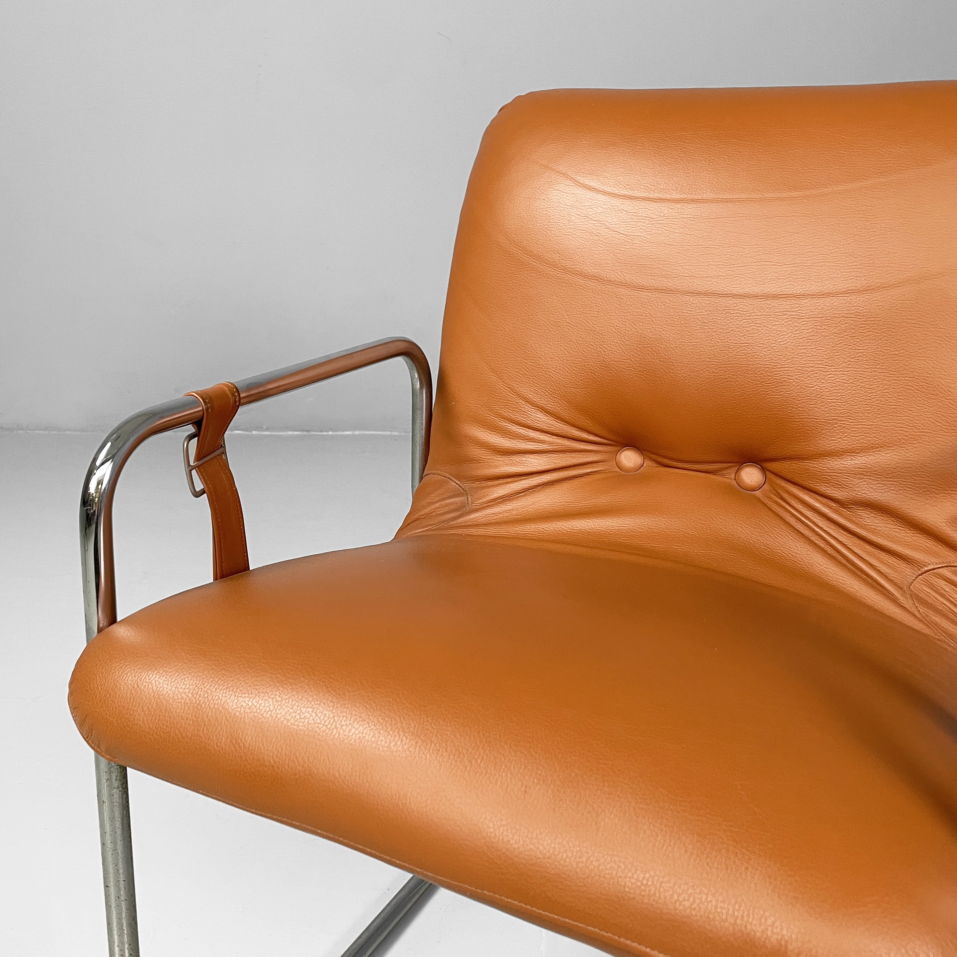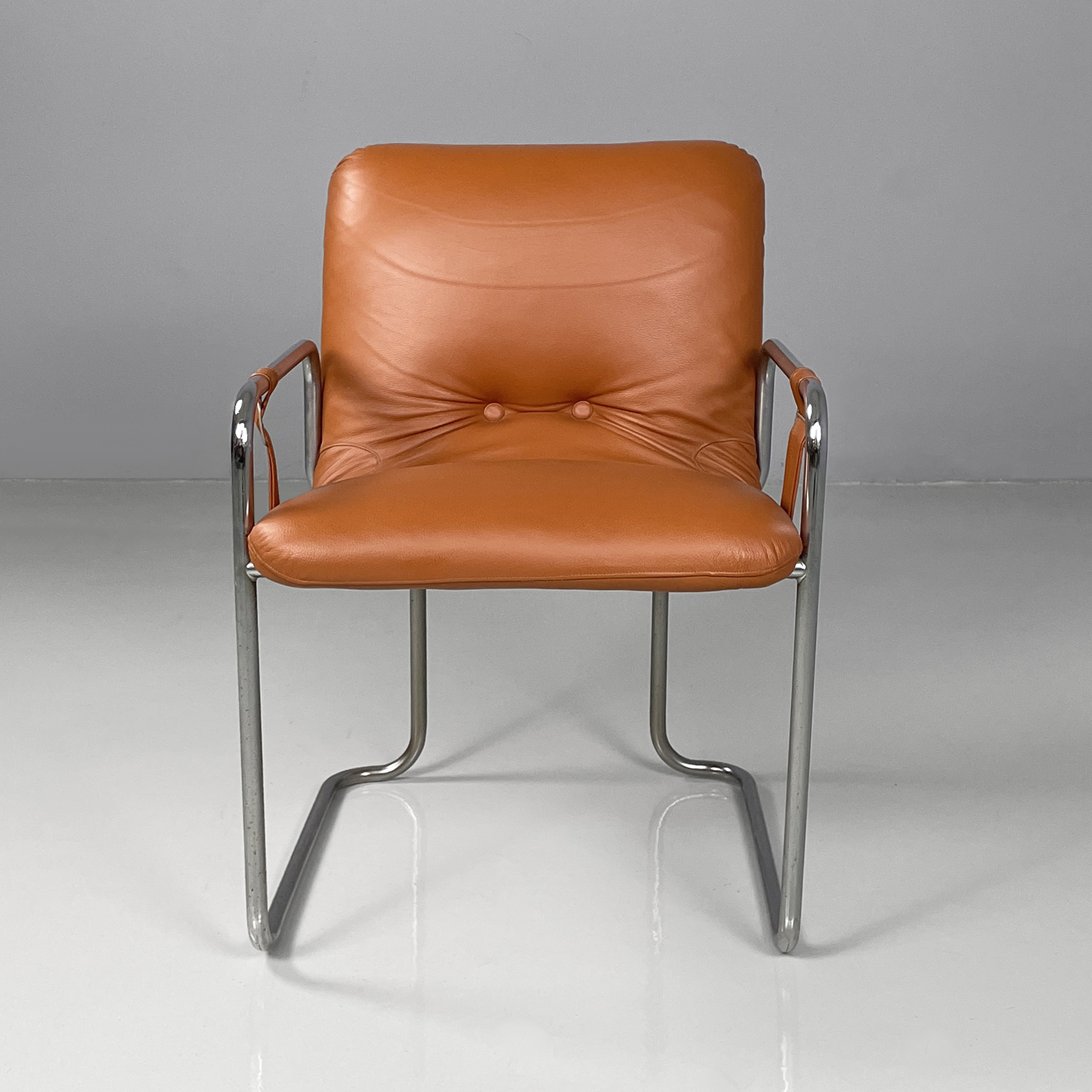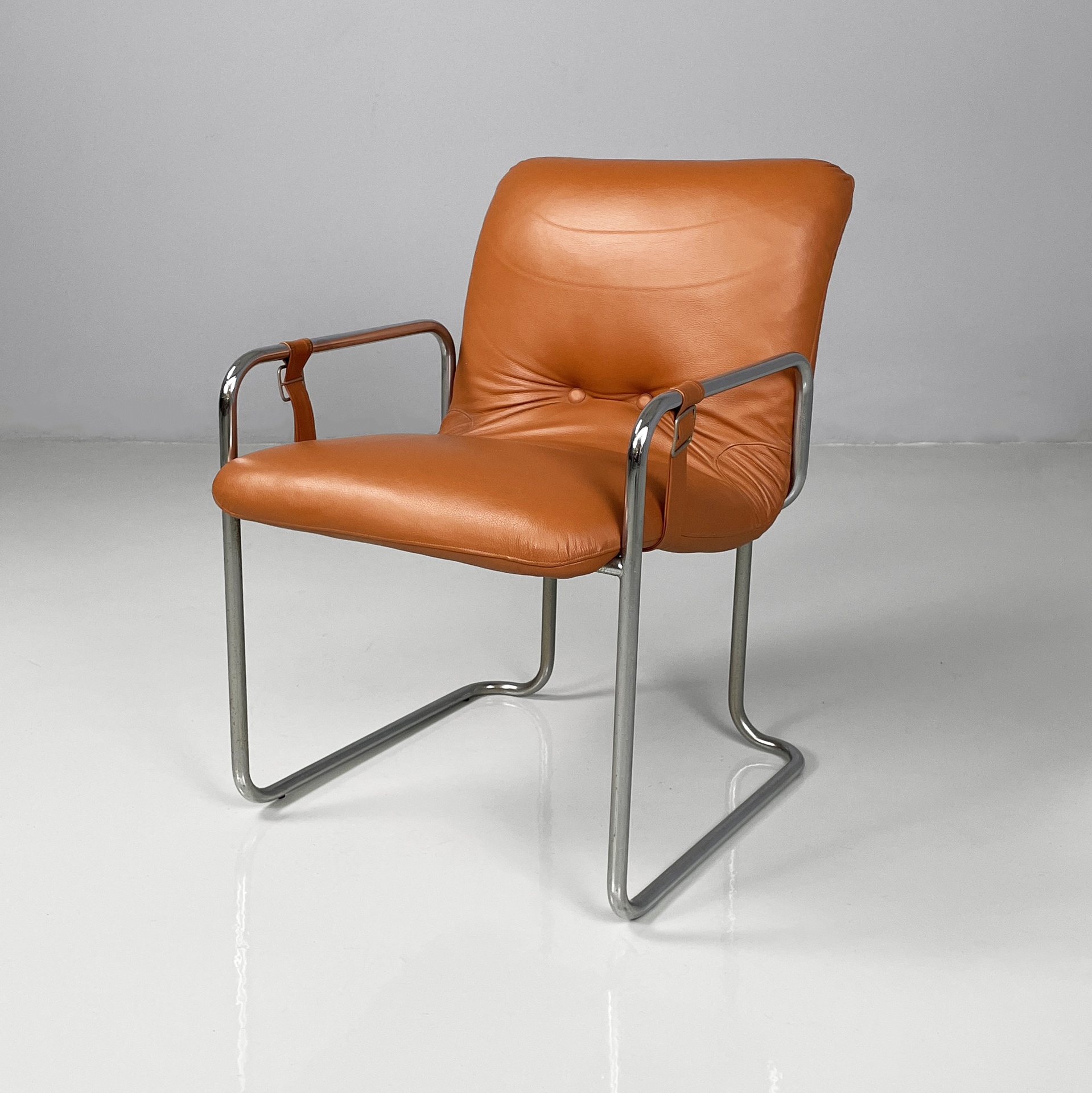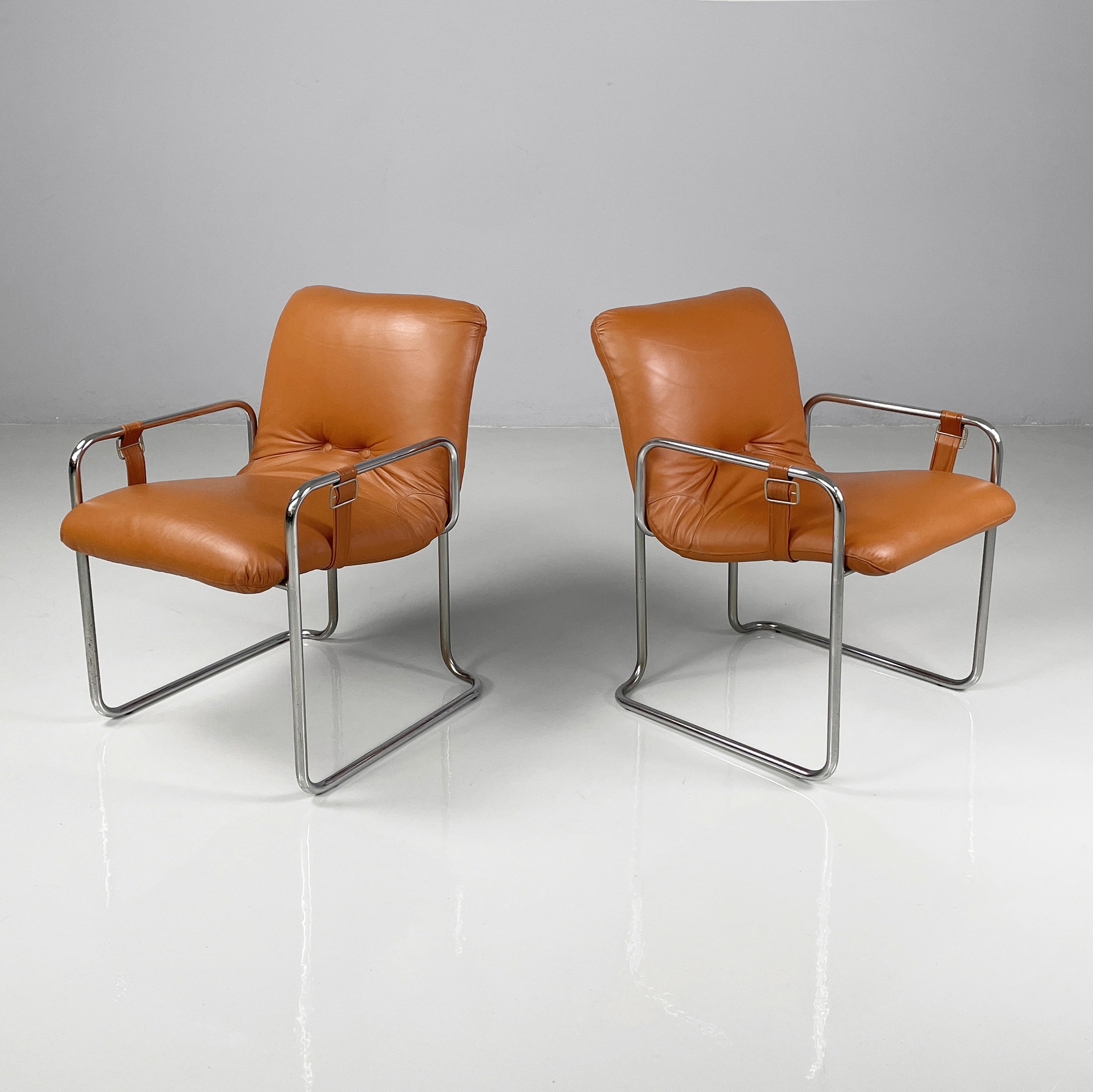 Coppia di sedie con seduta e schienale squadrati, imbottiti e rivestiti in pelle marrone. Sullo schienale sono presenti due bottoni rivestiti in pelle marrone. La struttura, i braccioli e le zampe sono composte da un unico tubolare di metallo cromato. La seduta è collegata al bracciolo grazie a delle cinghie in cuoio con fibbia metallica. Utilizzabili come piccole poltrone.