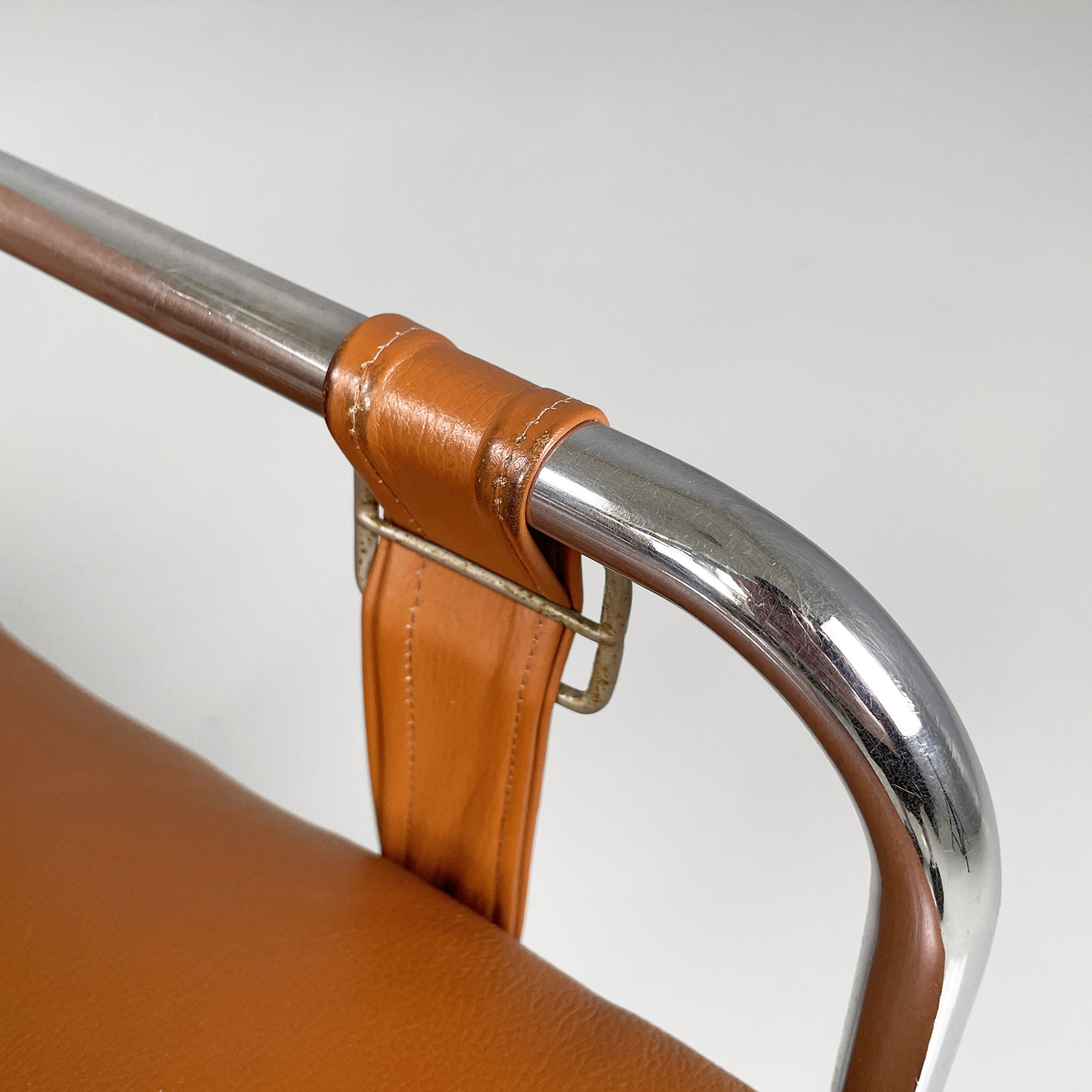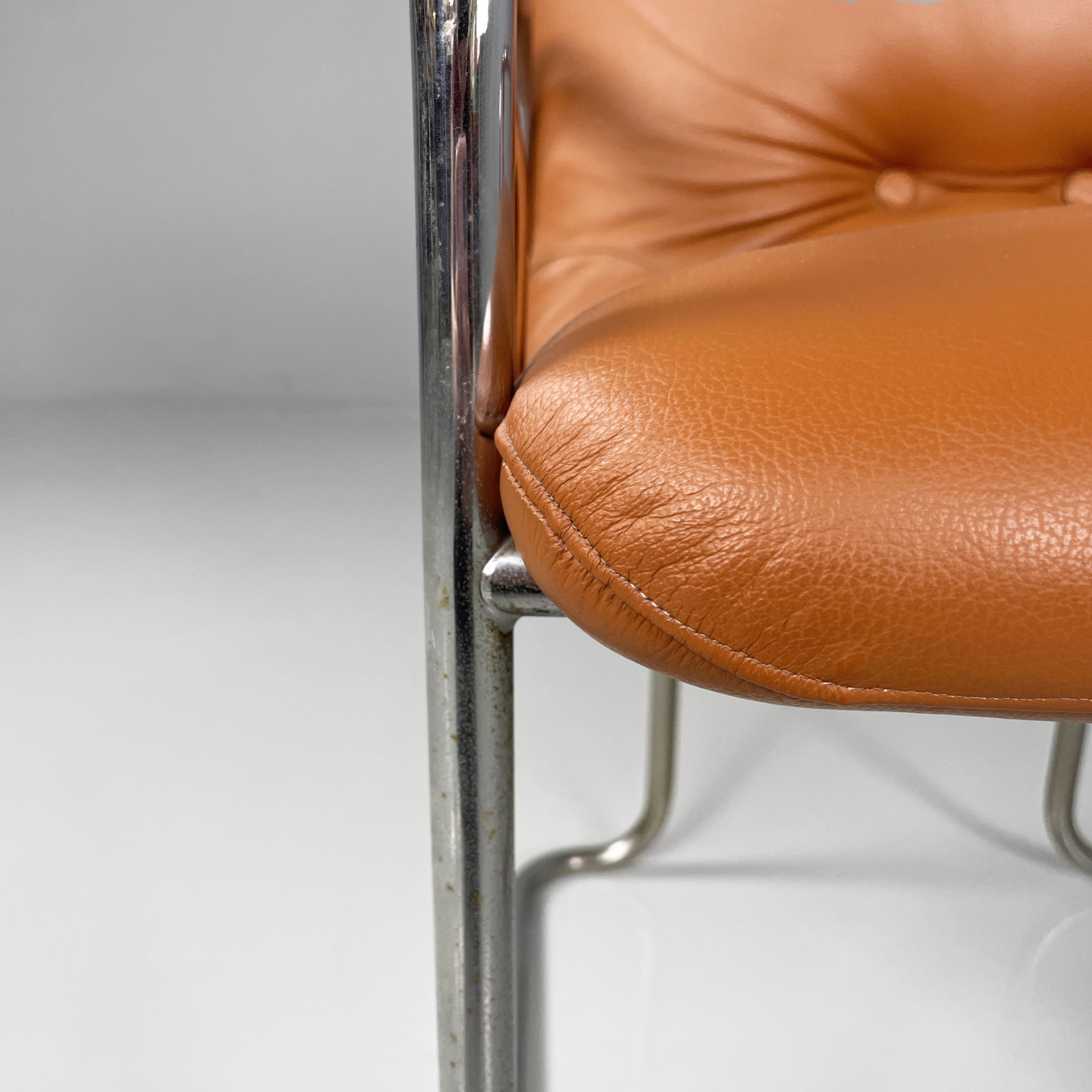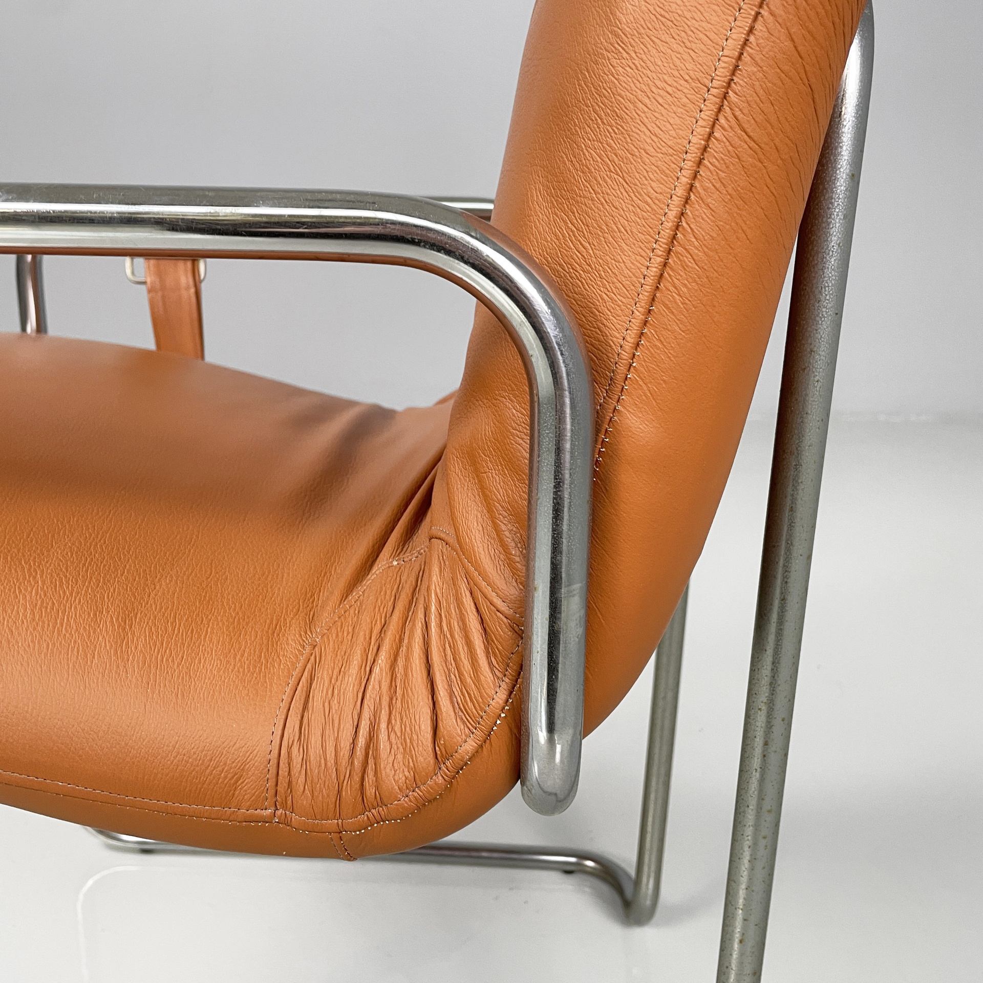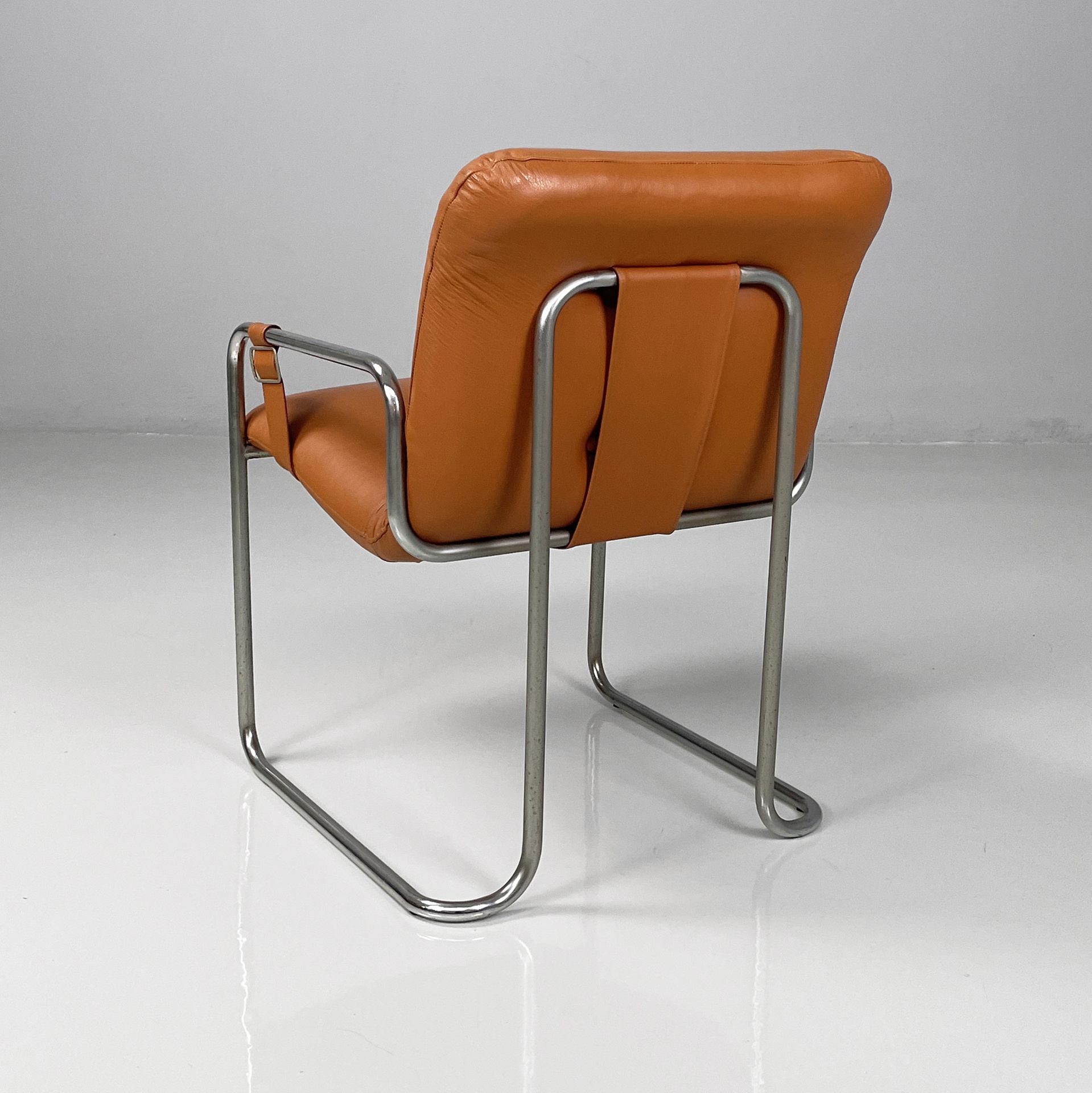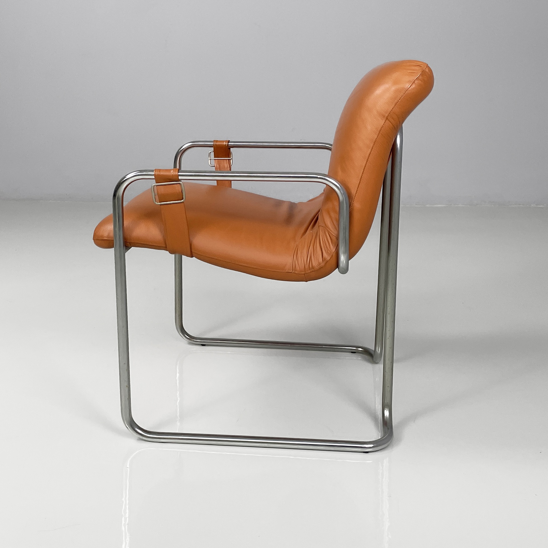 Coppia di sedie con seduta e schienale squadrati, imbottiti e rivestiti in pelle marrone. Sullo schienale sono presenti due bottoni rivestiti in pelle marrone. La struttura, i braccioli e le zampe sono composte da un unico tubolare di metallo cromato. La seduta è collegata al bracciolo grazie a delle cinghie in cuoio con fibbia metallica. Utilizzabili come piccole poltrone.