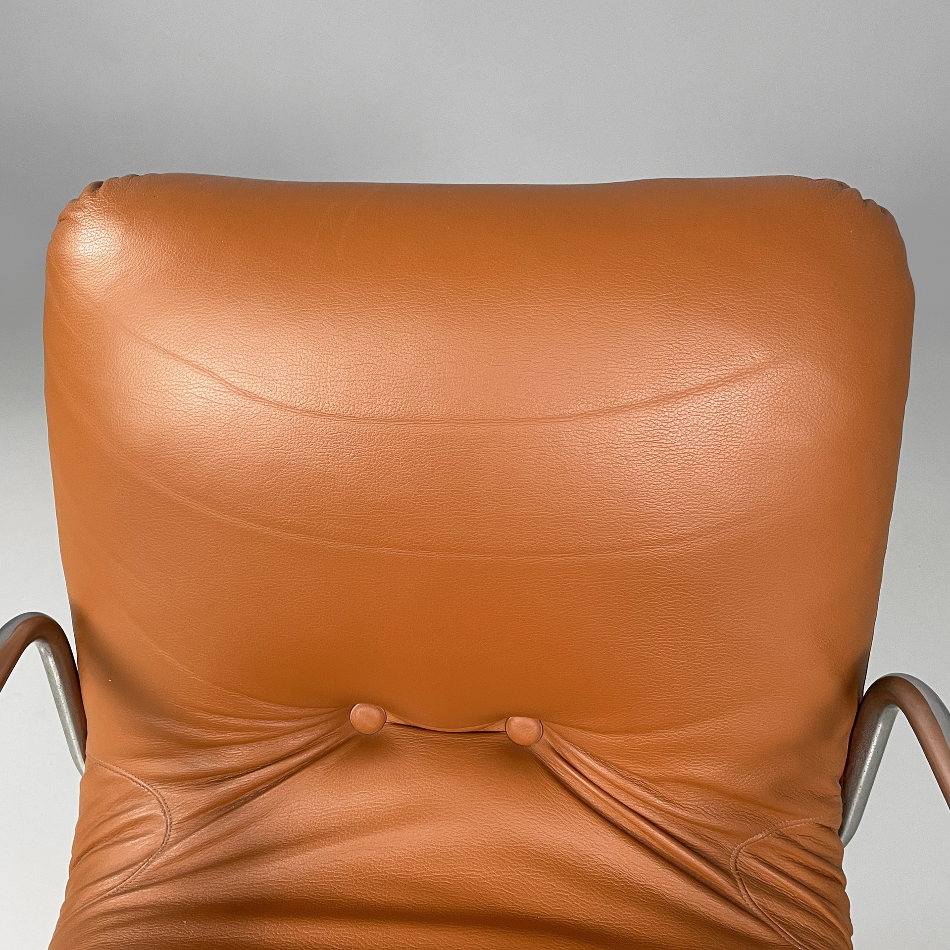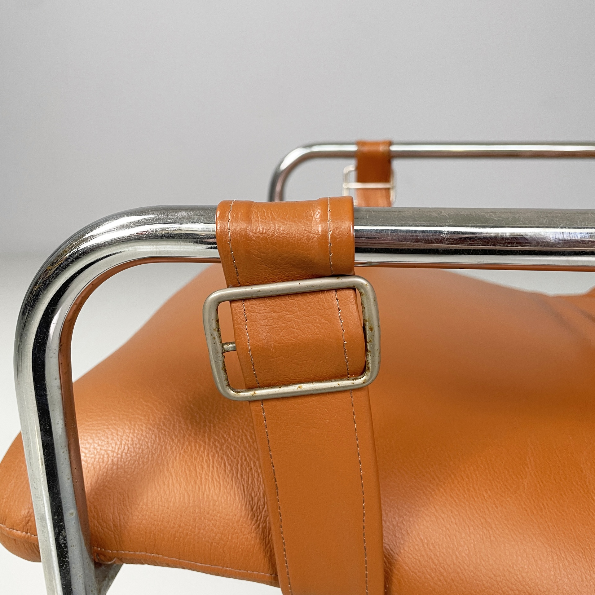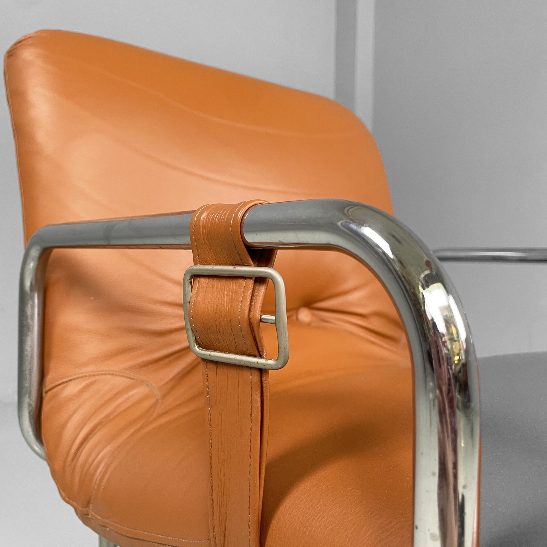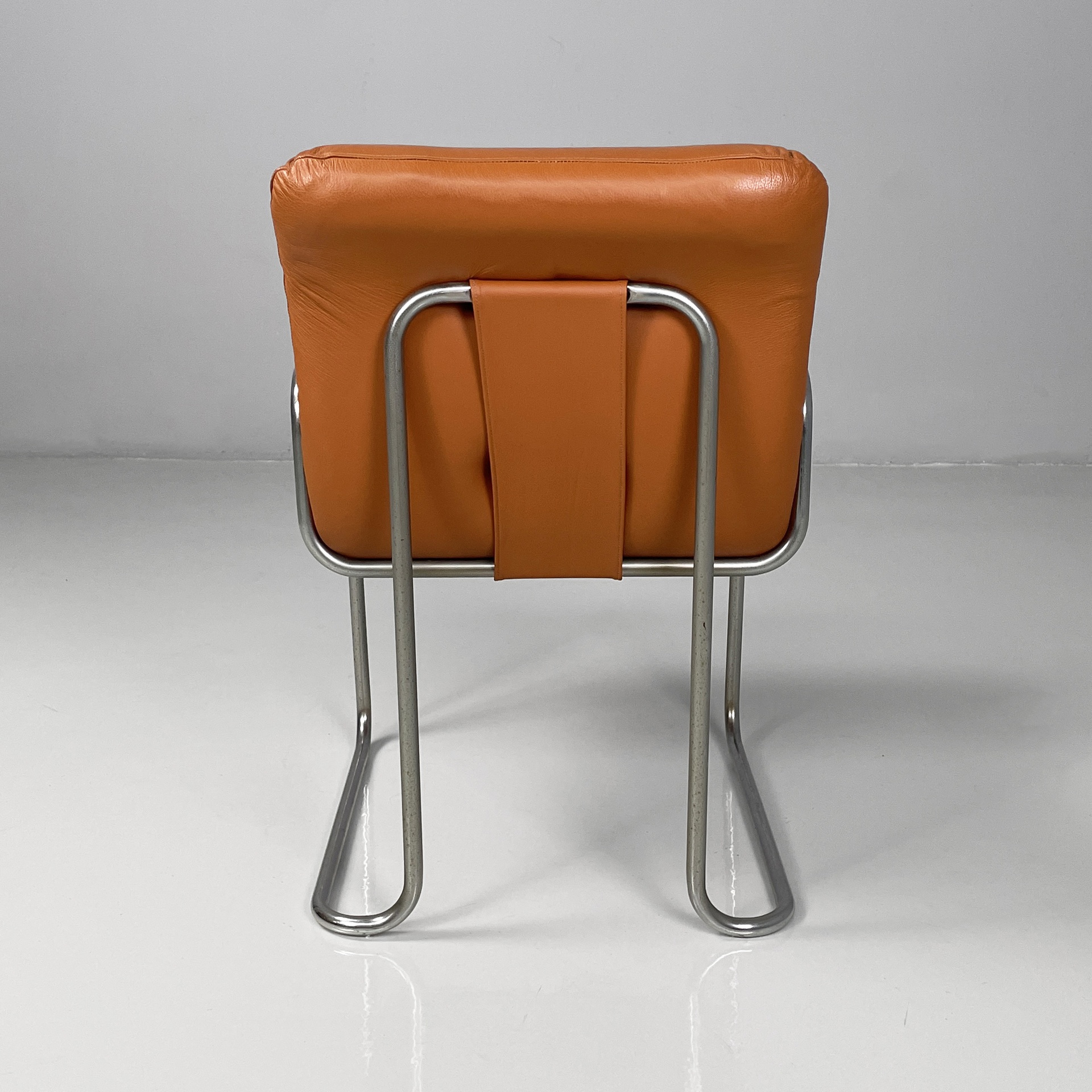 Coppia di sedie con seduta e schienale squadrati, imbottiti e rivestiti in pelle marrone. Sullo schienale sono presenti due bottoni rivestiti in pelle marrone. La struttura, i braccioli e le zampe sono composte da un unico tubolare di metallo cromato. La seduta è collegata al bracciolo grazie a delle cinghie in cuoio con fibbia metallica. Utilizzabili come piccole poltrone.