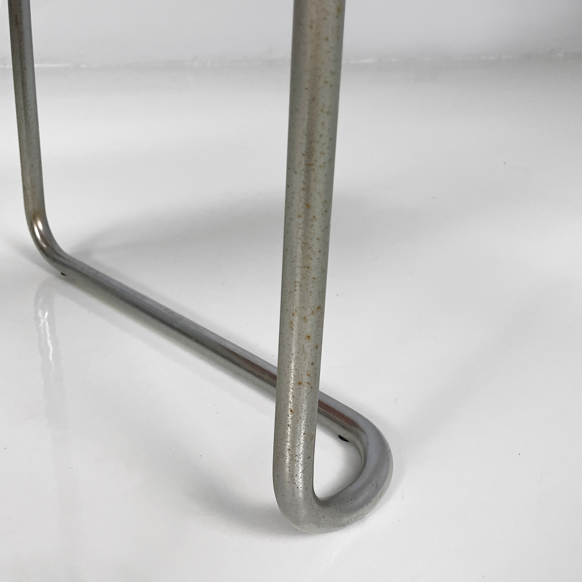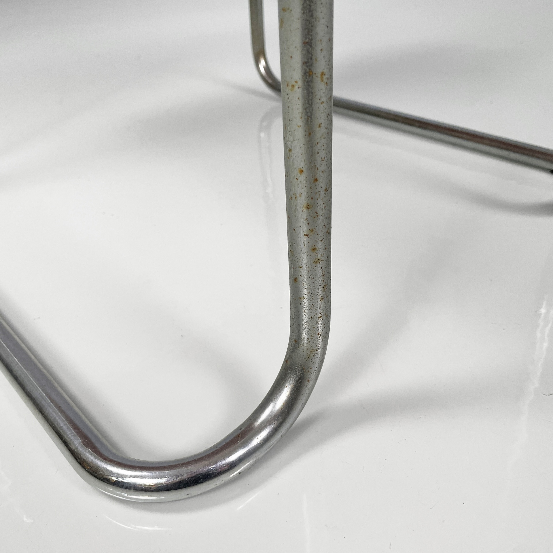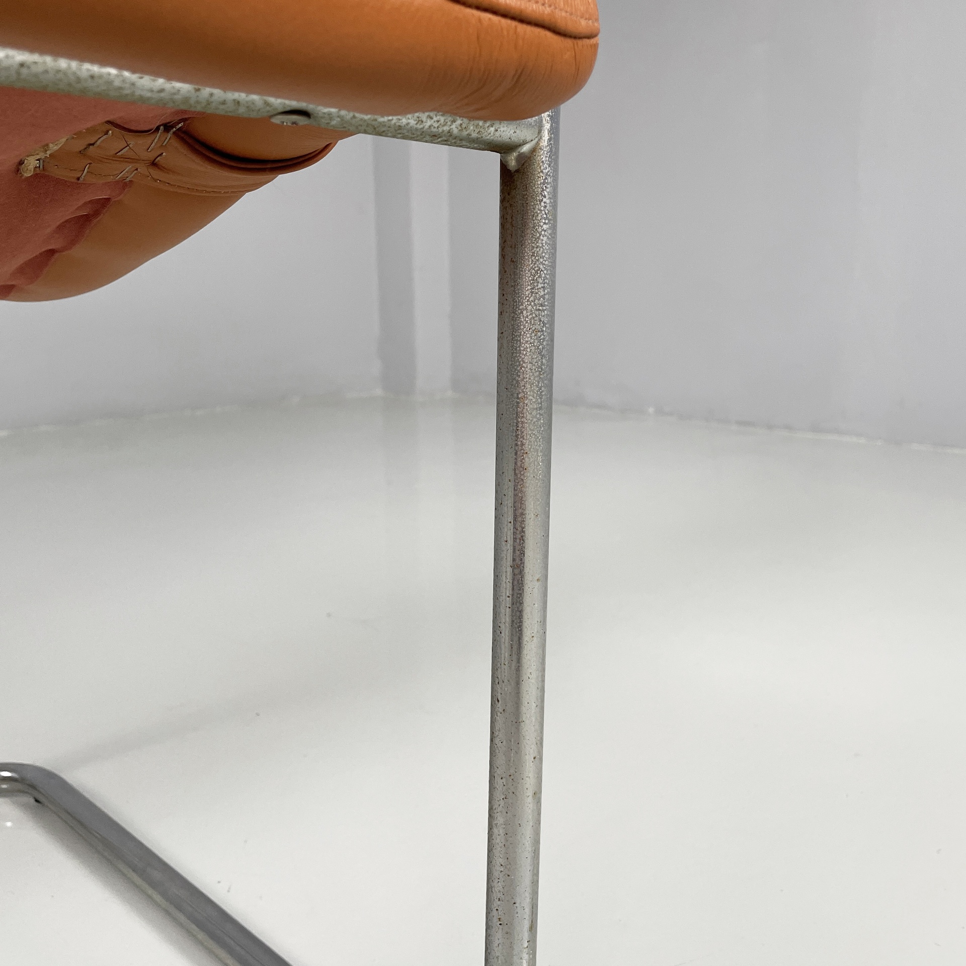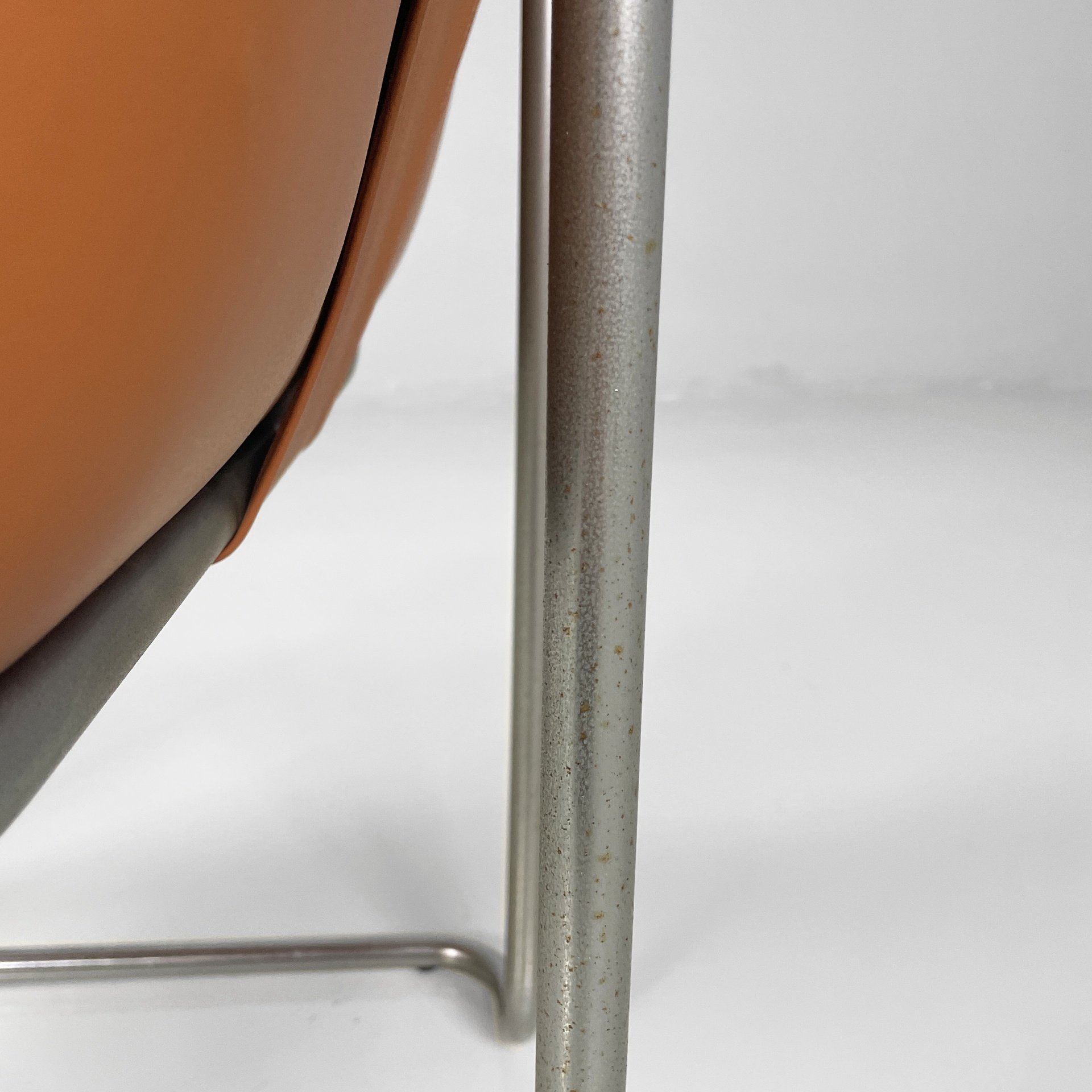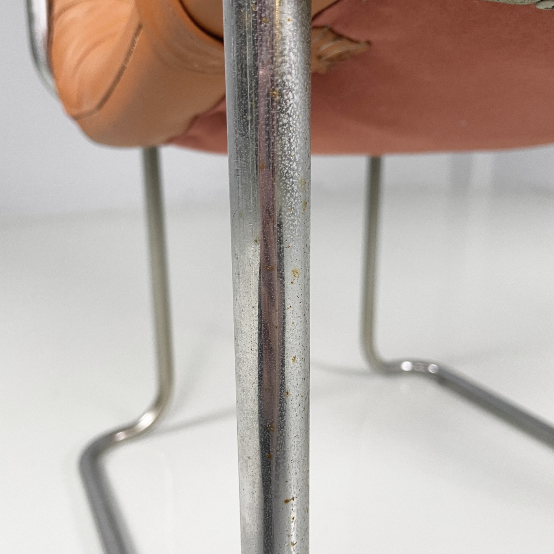 Coppia di sedie con seduta e schienale squadrati, imbottiti e rivestiti in pelle marrone. Sullo schienale sono presenti due bottoni rivestiti in pelle marrone. La struttura, i braccioli e le zampe sono composte da un unico tubolare di metallo cromato. La seduta è collegata al bracciolo grazie a delle cinghie in cuoio con fibbia metallica. Utilizzabili come piccole poltrone.