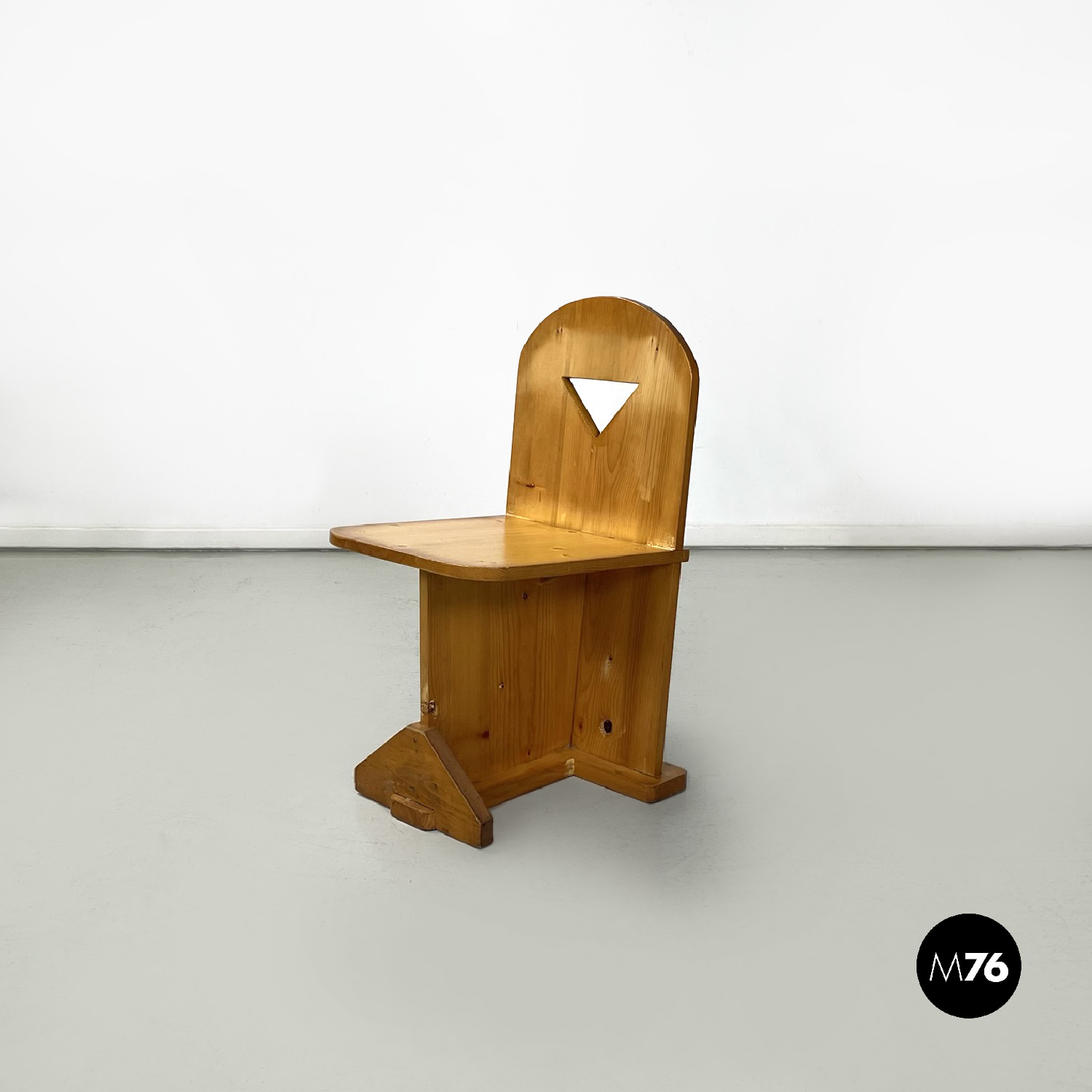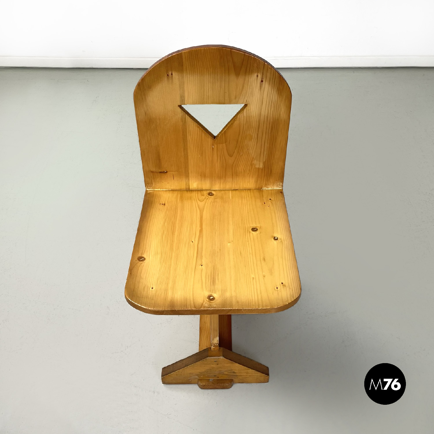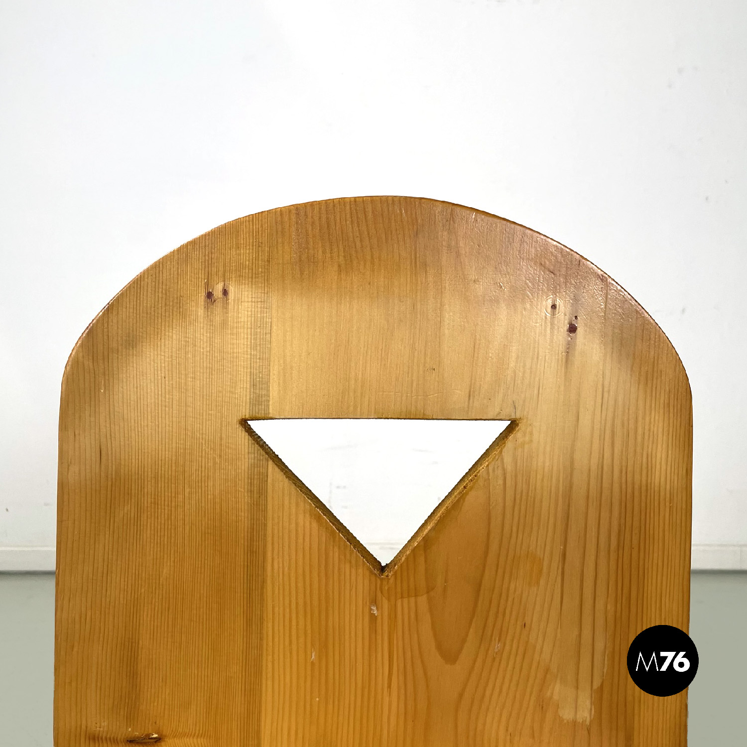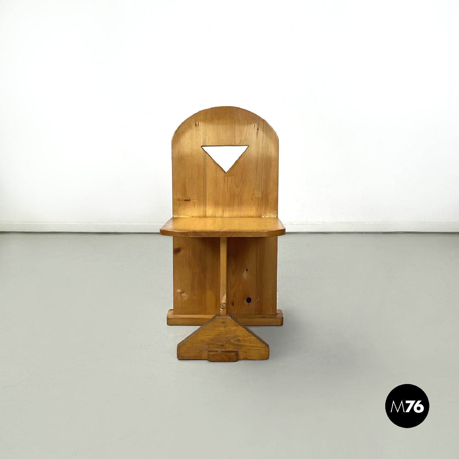 Set di sei sedie interamente in legno. La seduta è rettangolare con i due angoli davanti smussati, lo schienale termina con un semicerchio ed ha un foro a forma di triangolo rovesciato. La base delle sedie è dato dalla stessa struttura dello schienale e da un’altra tavola in legno richiamando la forma di una “T”, con un triangolo sulla parte frontale.
