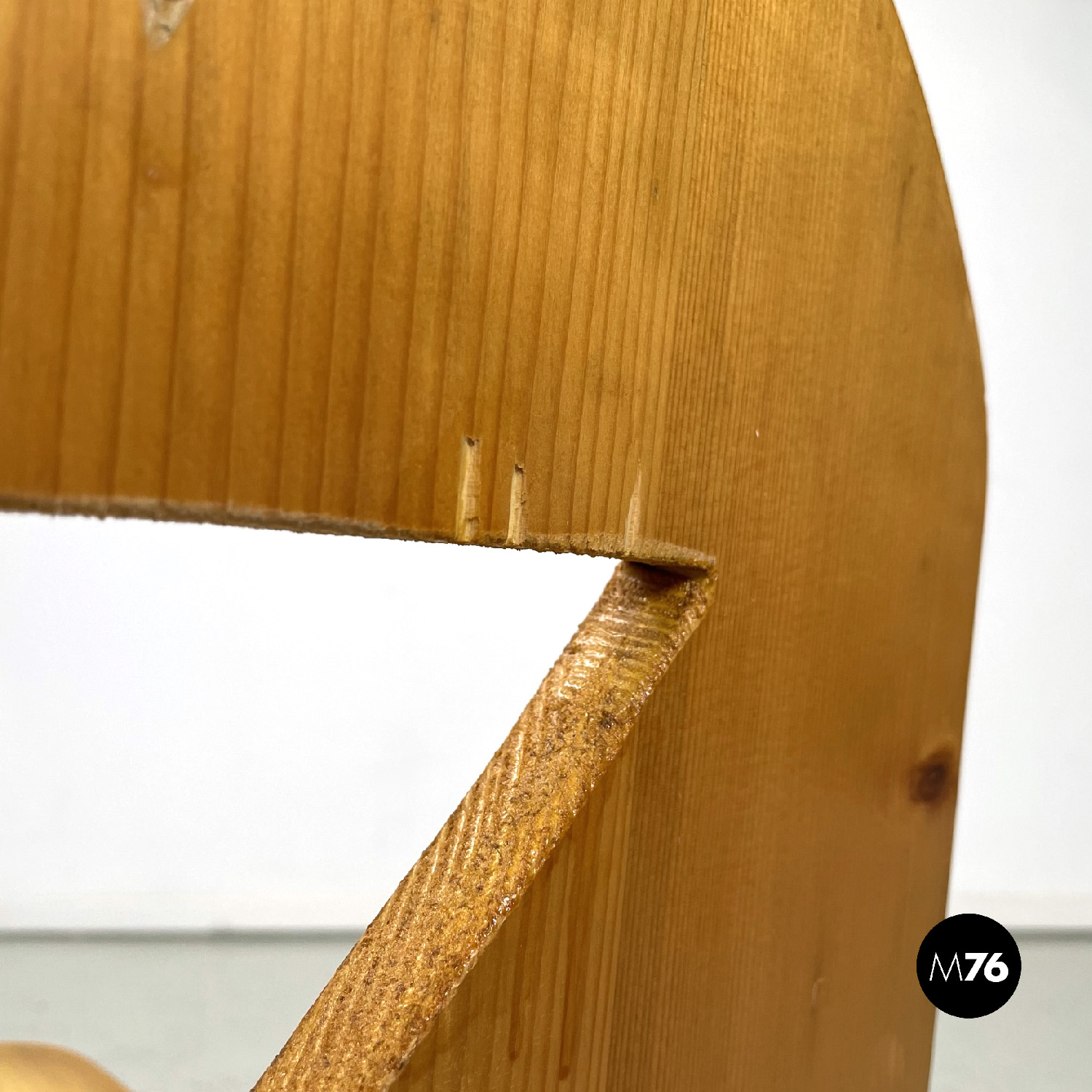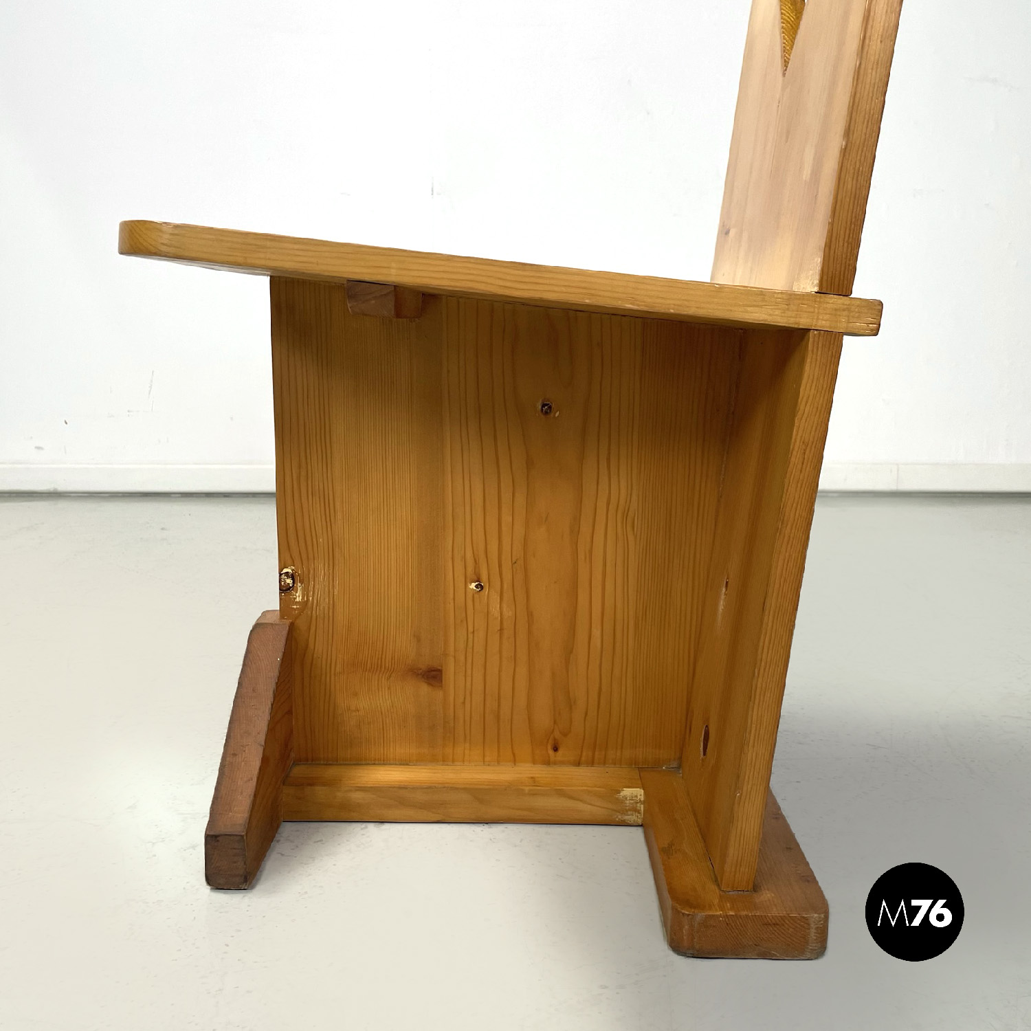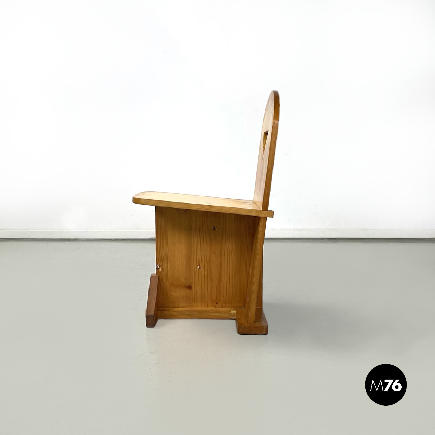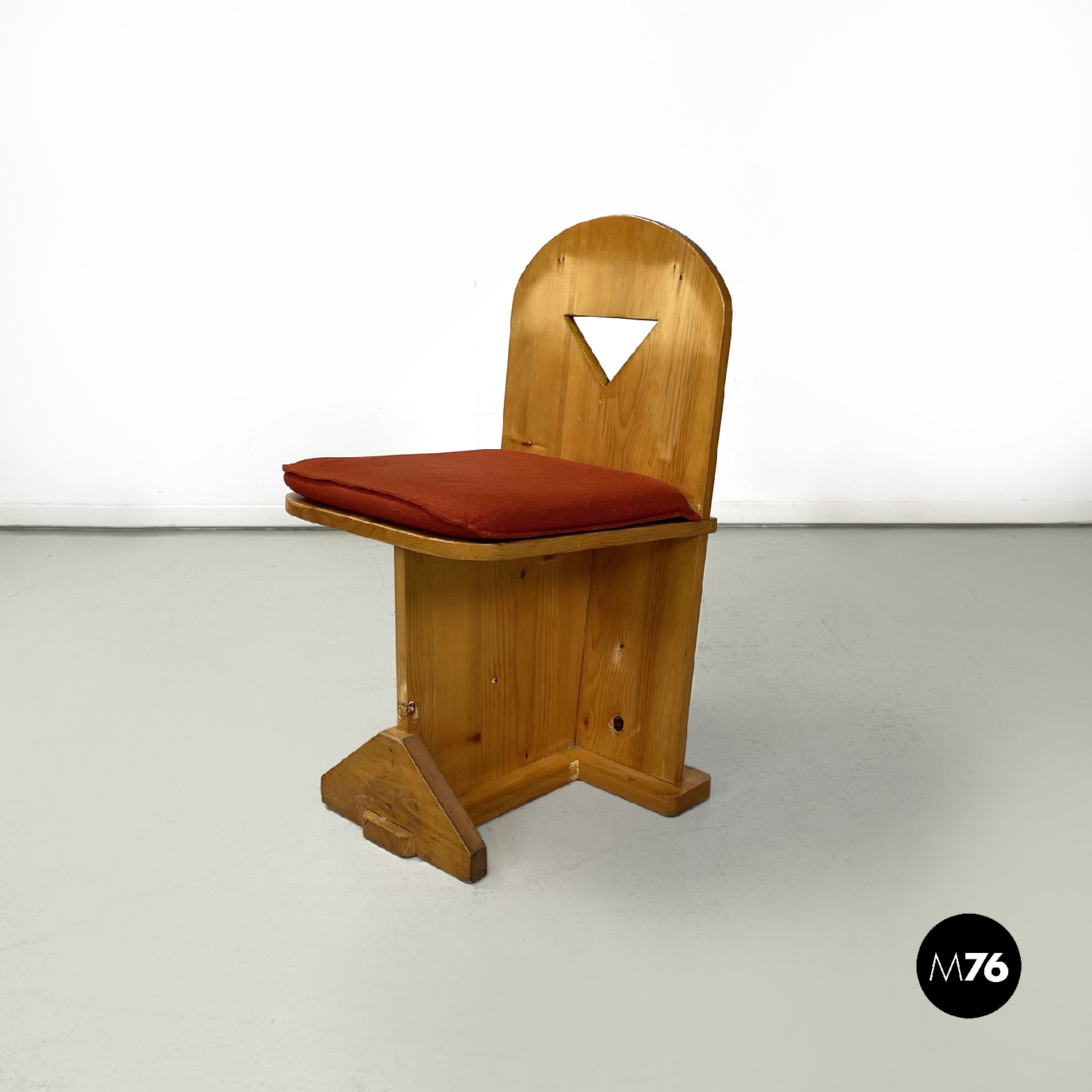 Set di sei sedie interamente in legno. La seduta è rettangolare con i due angoli davanti smussati, lo schienale termina con un semicerchio ed ha un foro a forma di triangolo rovesciato. La base delle sedie è dato dalla stessa struttura dello schienale e da un’altra tavola in legno richiamando la forma di una “T”, con un triangolo sulla parte frontale.