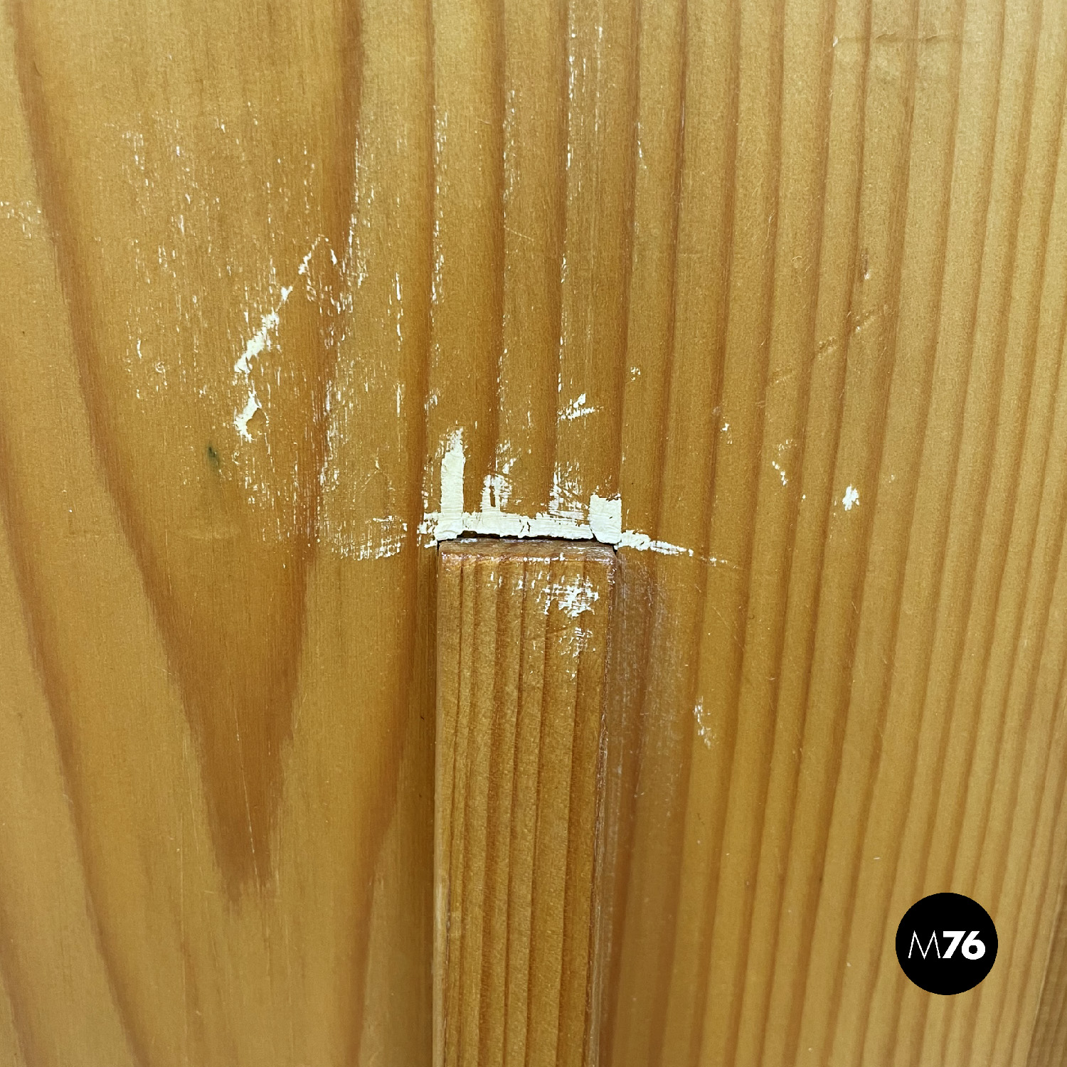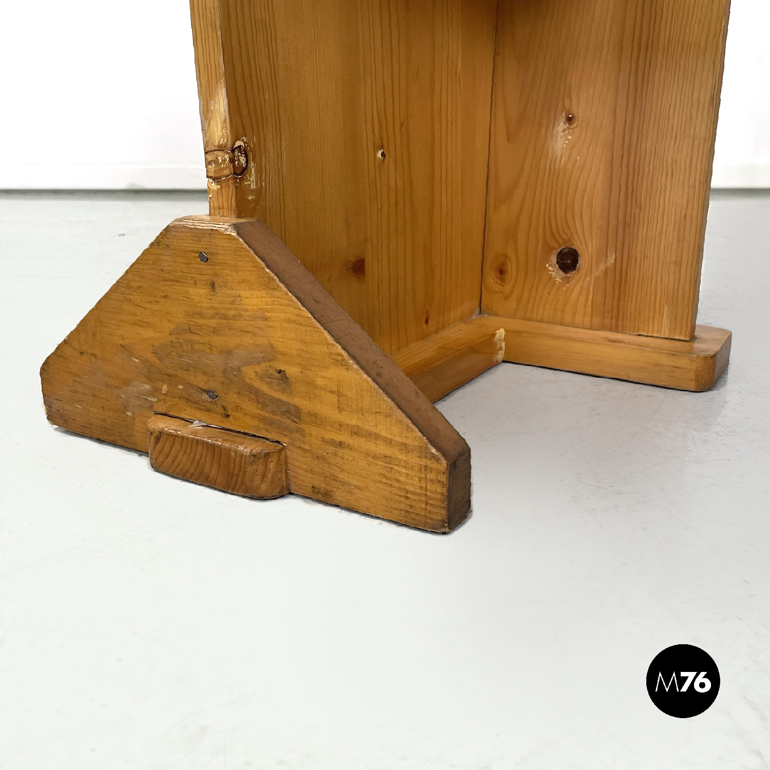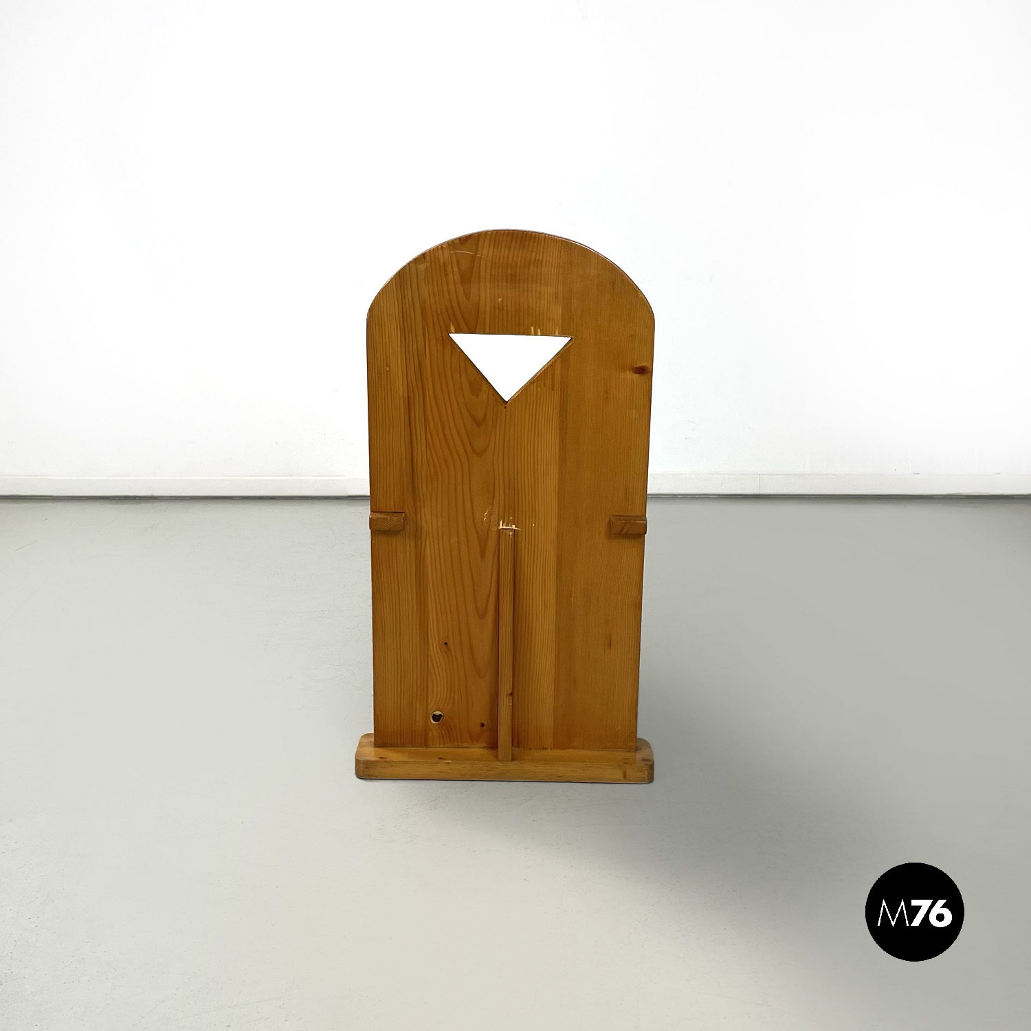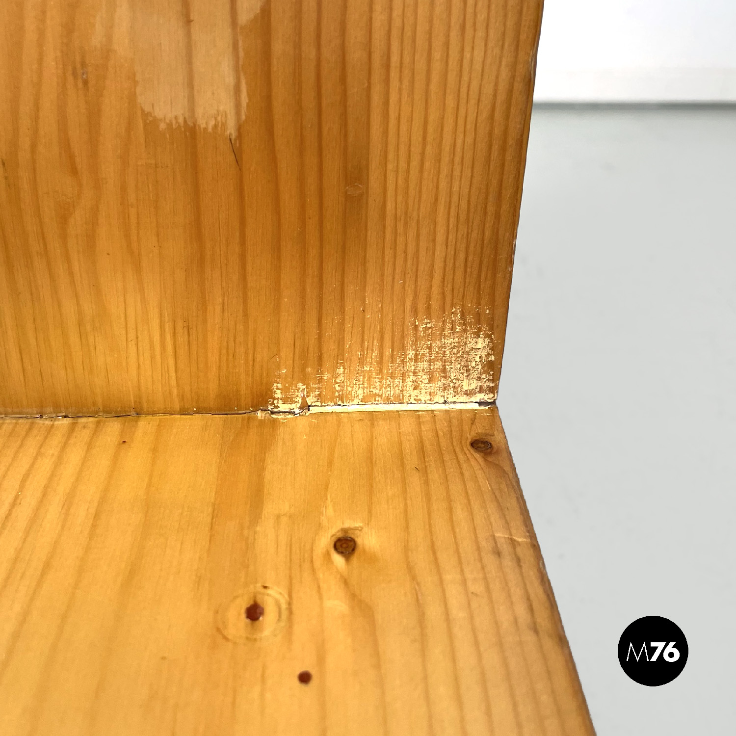 Set di sei sedie interamente in legno. La seduta è rettangolare con i due angoli davanti smussati, lo schienale termina con un semicerchio ed ha un foro a forma di triangolo rovesciato. La base delle sedie è dato dalla stessa struttura dello schienale e da un’altra tavola in legno richiamando la forma di una “T”, con un triangolo sulla parte frontale.