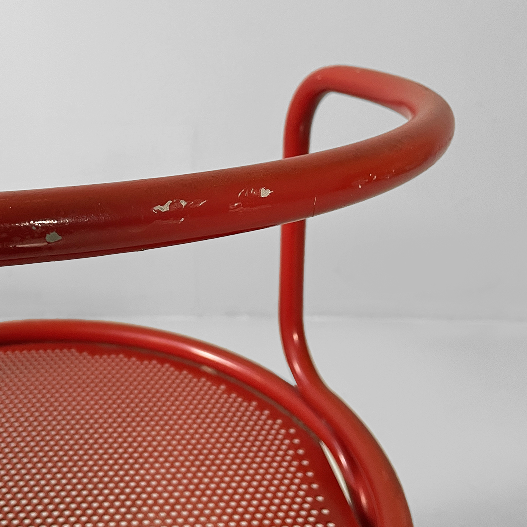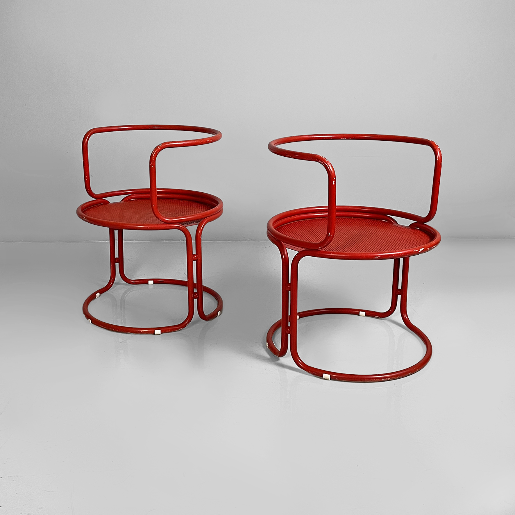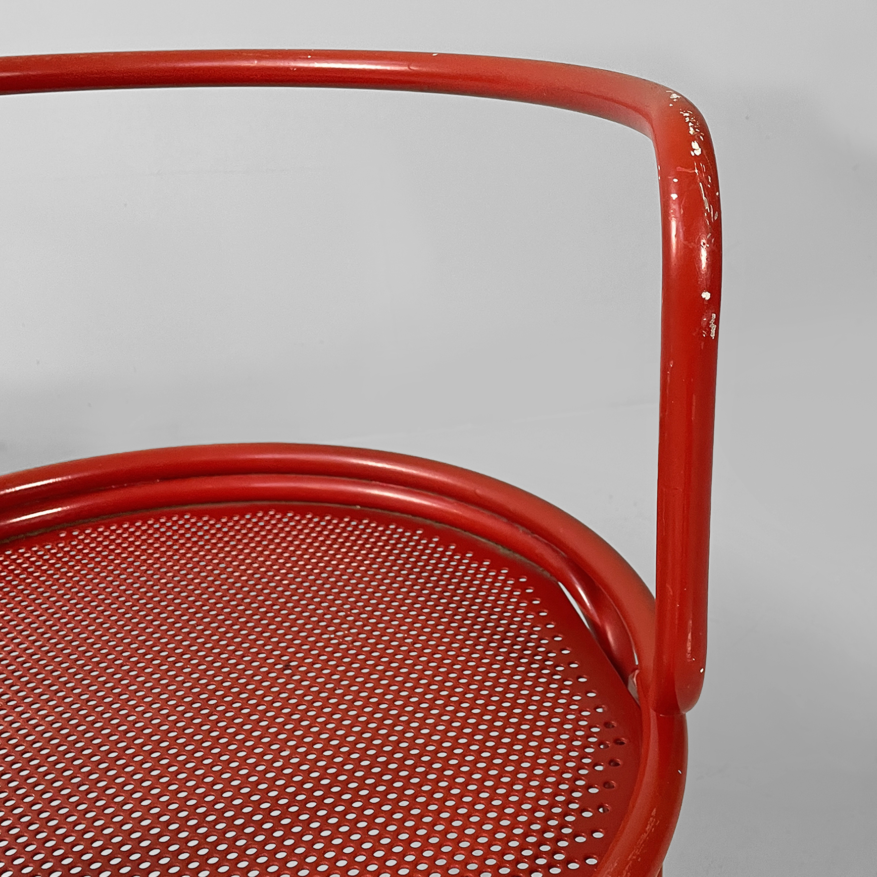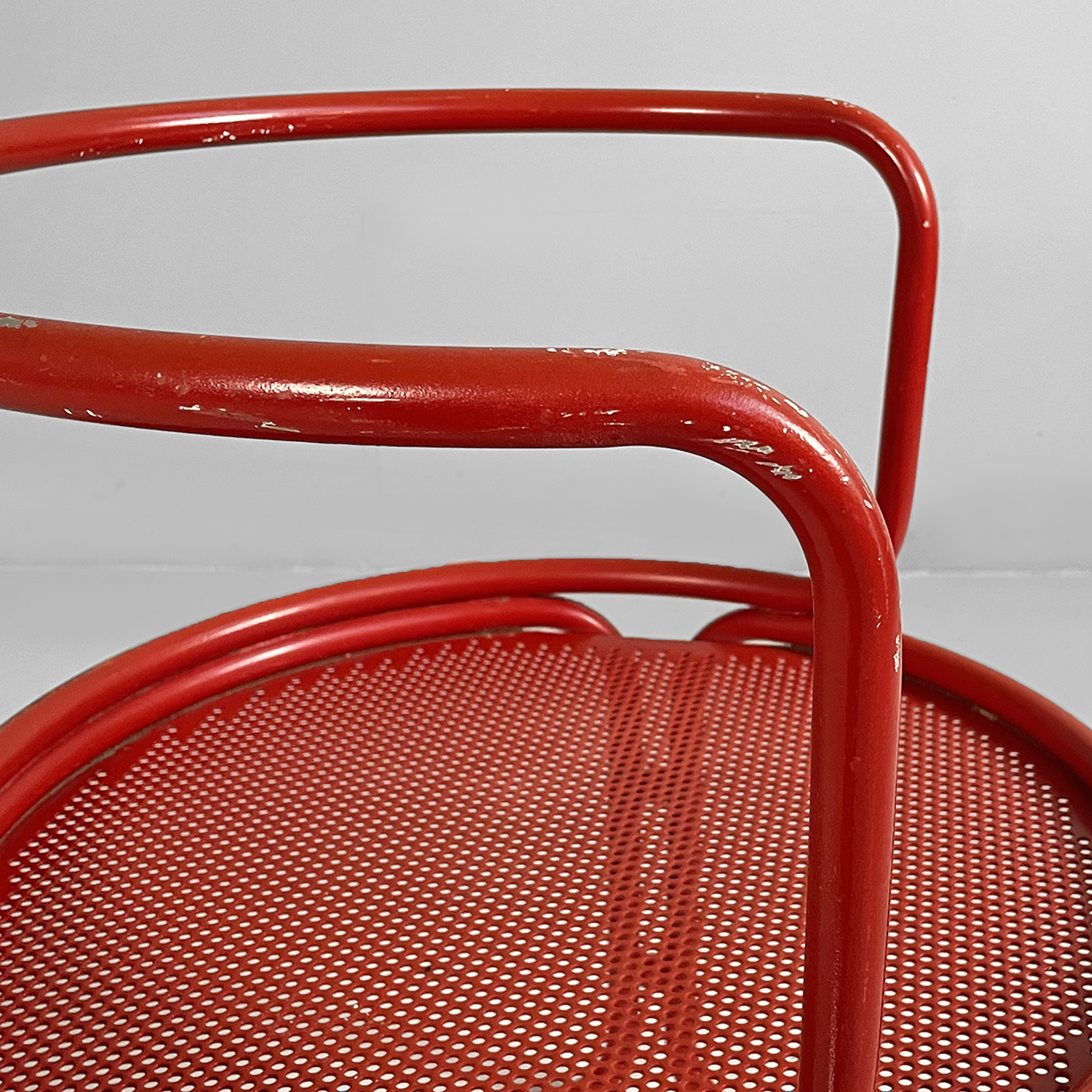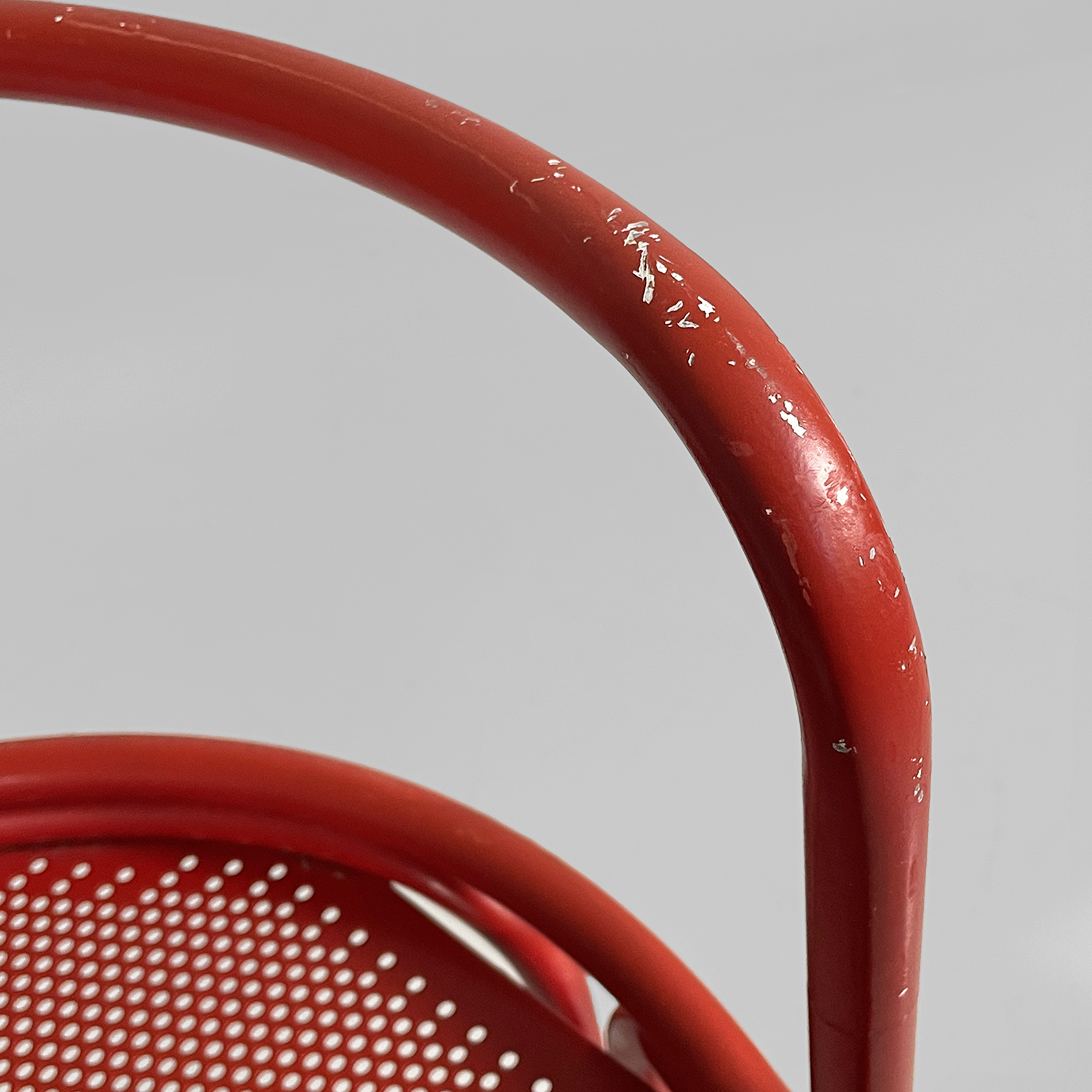 Coppia di sedie interamente in metallo verniciato rosso. La seduta tonda è in lamiera traforata. La struttura, i braccioli, lo schienale e le zampe sono in tubolare di metallo. Adatte ad uso esterno come in giardino.