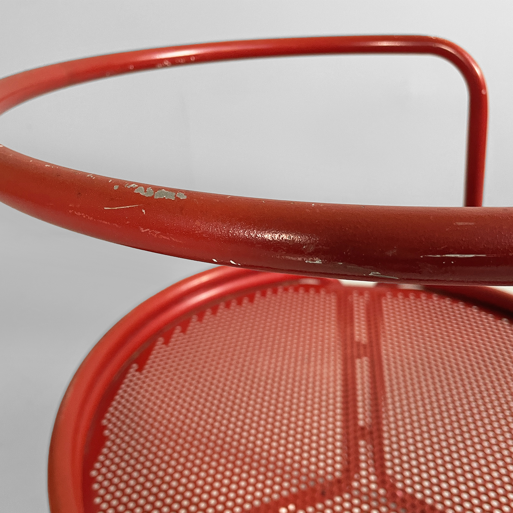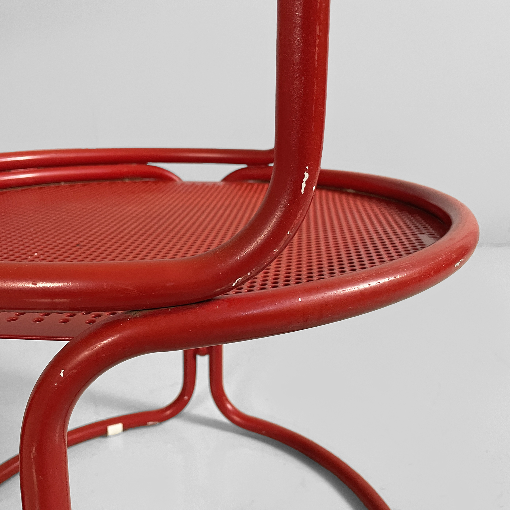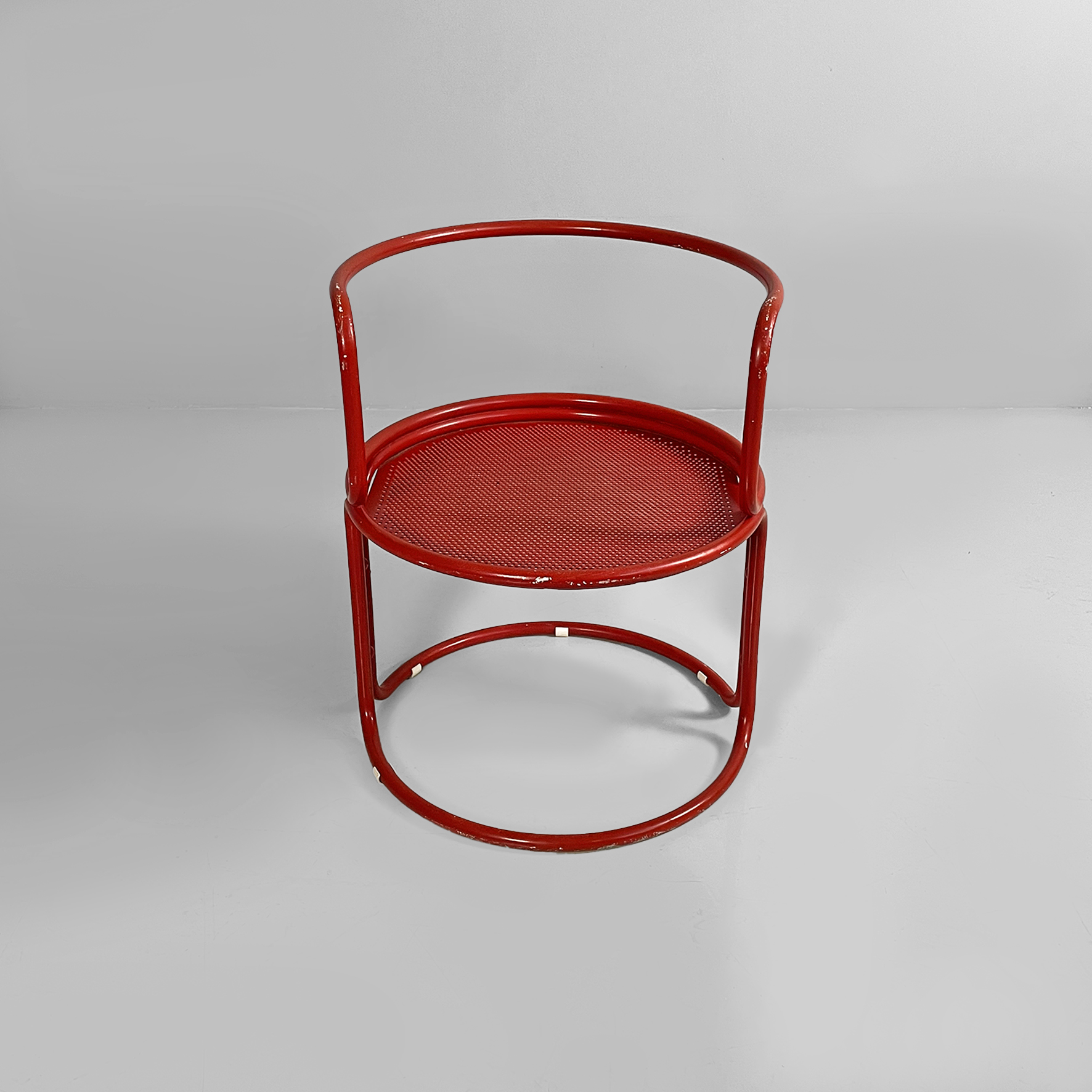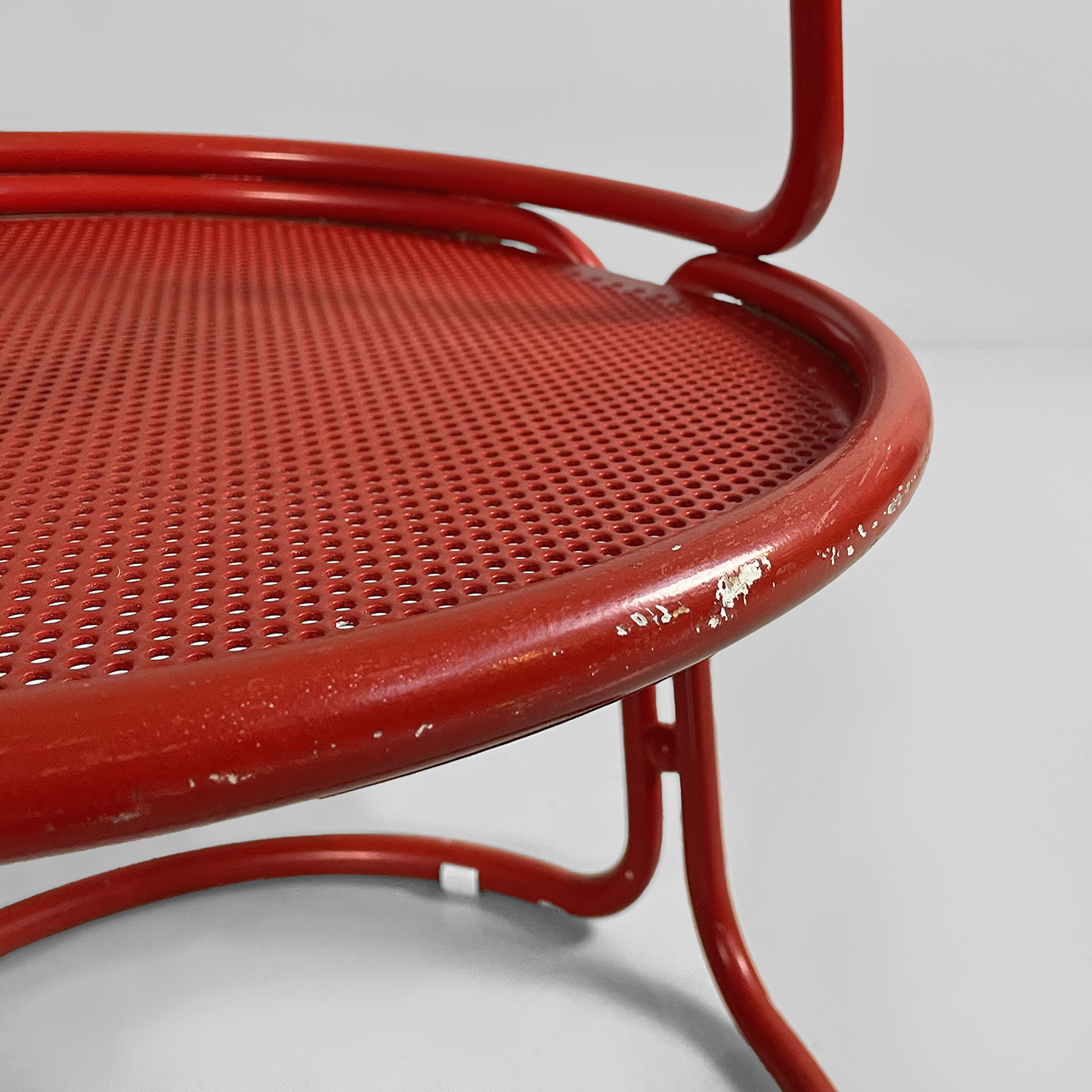 Coppia di sedie interamente in metallo verniciato rosso. La seduta tonda è in lamiera traforata. La struttura, i braccioli, lo schienale e le zampe sono in tubolare di metallo. Adatte ad uso esterno come in giardino.