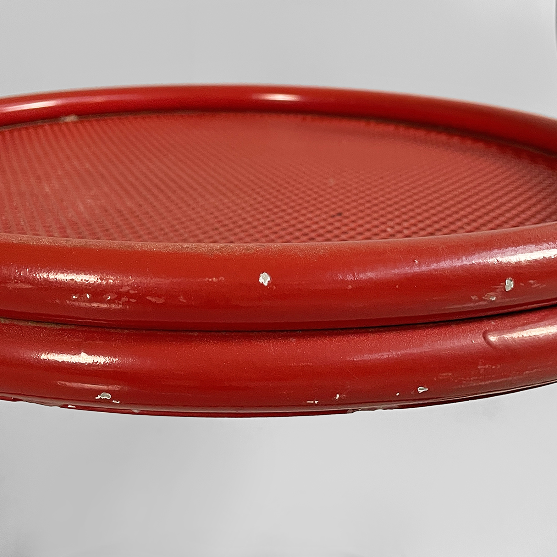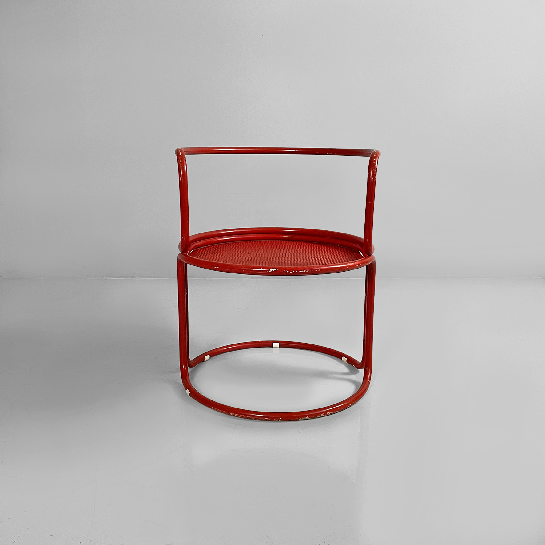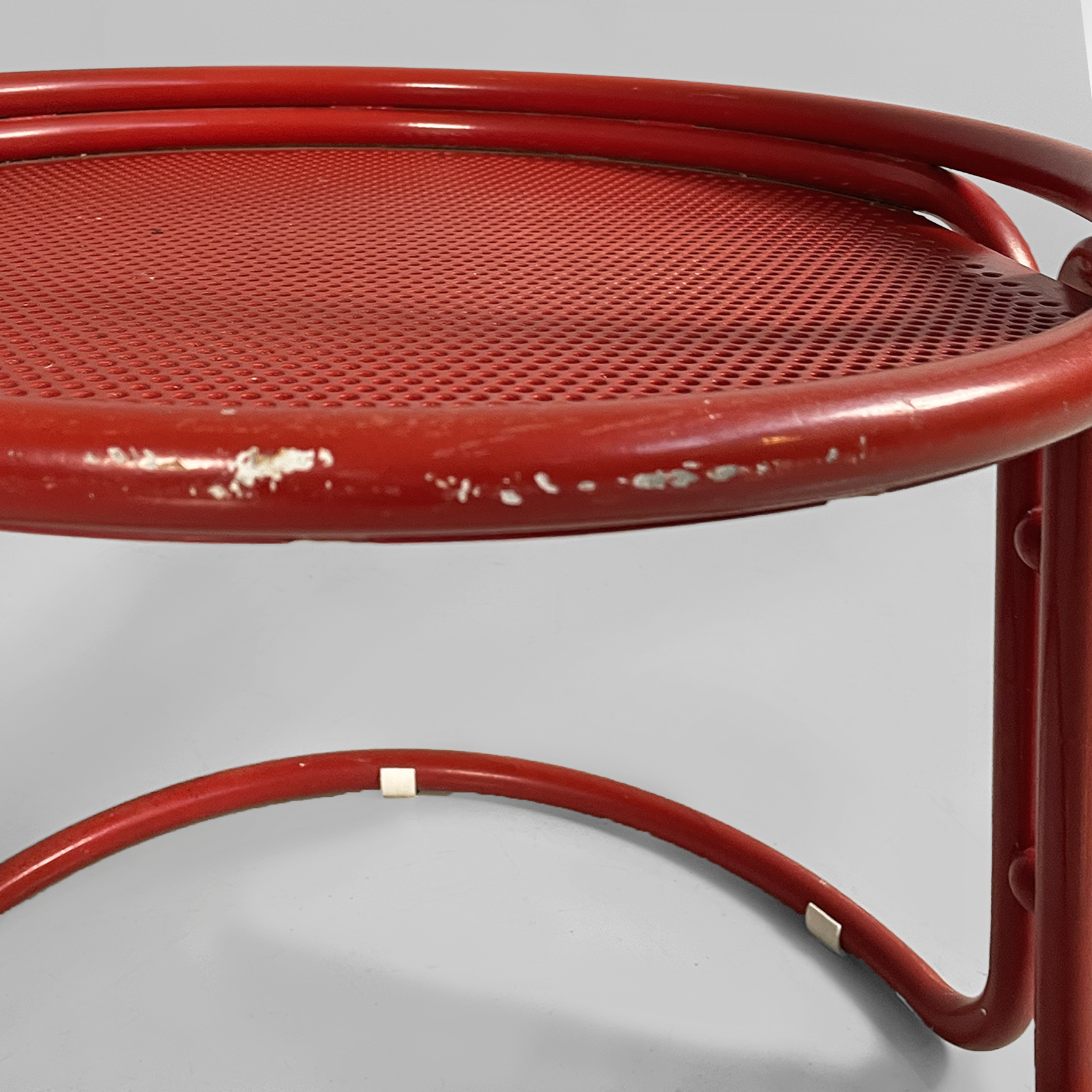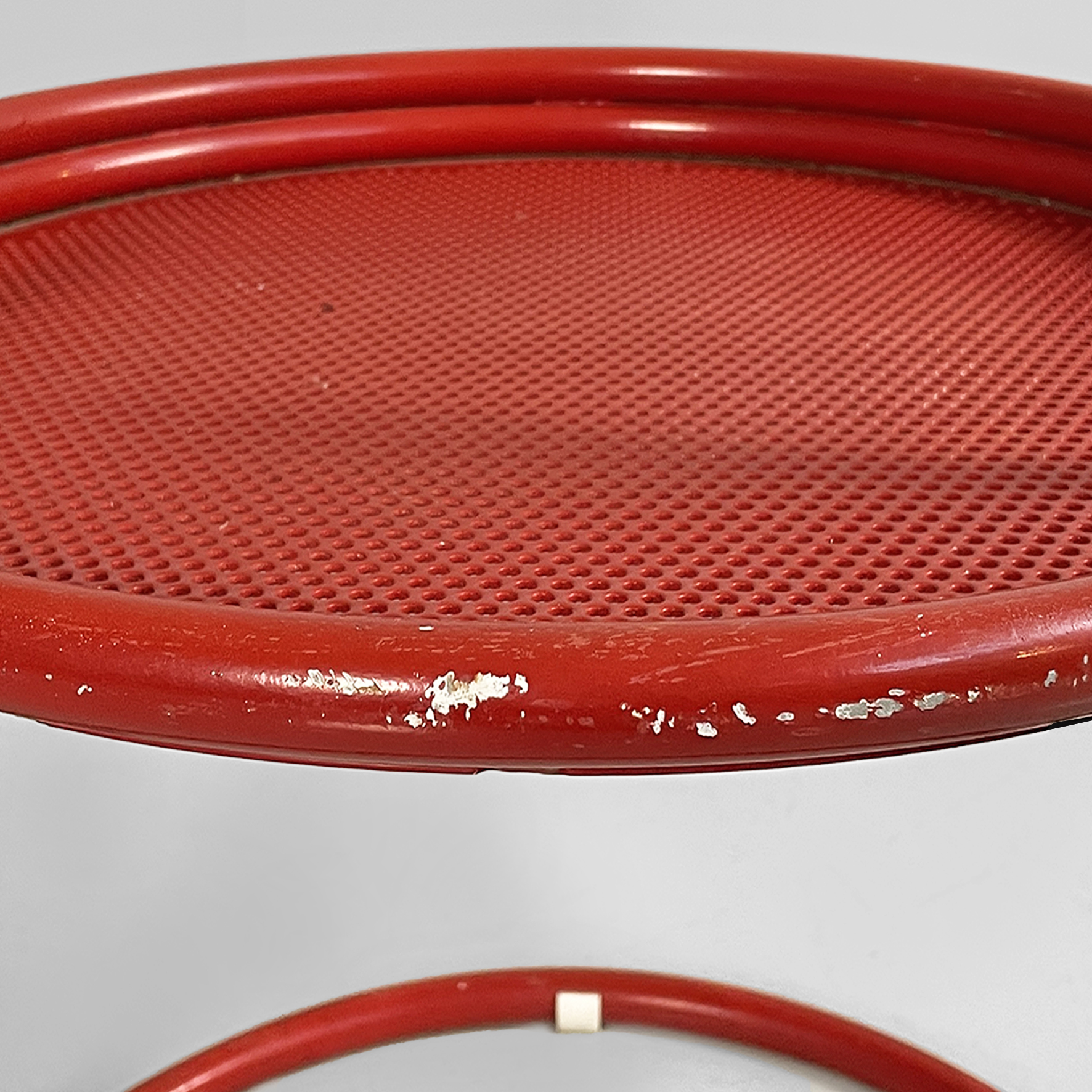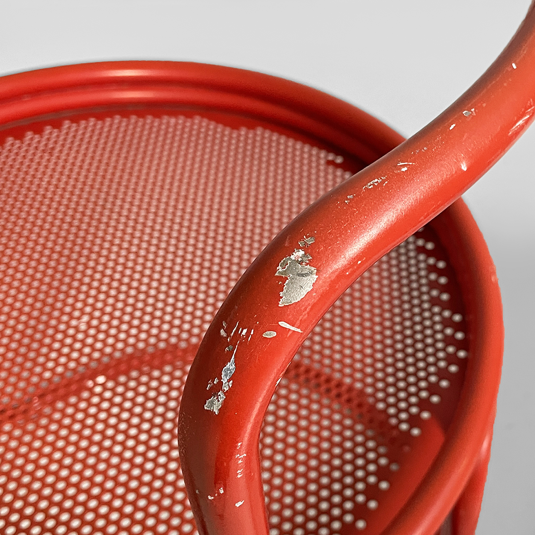 Coppia di sedie interamente in metallo verniciato rosso. La seduta tonda è in lamiera traforata. La struttura, i braccioli, lo schienale e le zampe sono in tubolare di metallo. Adatte ad uso esterno come in giardino.